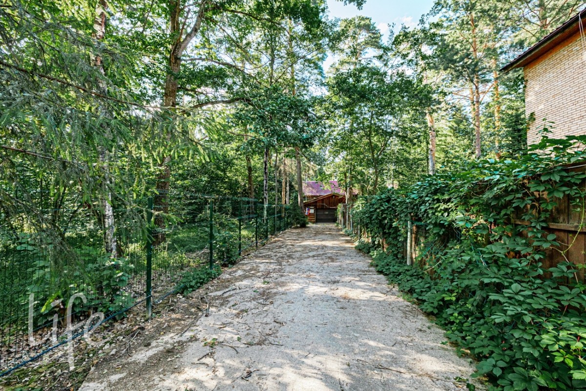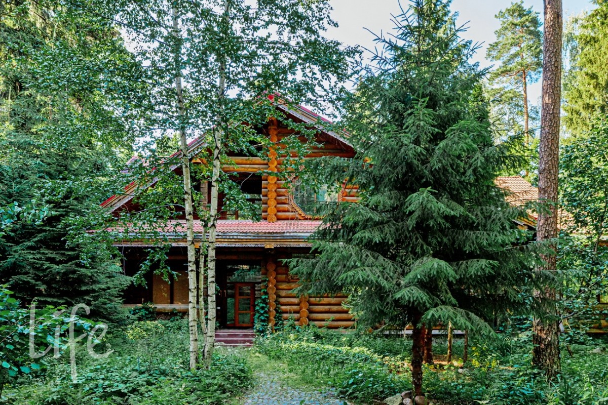 Потрясающий лесной участок: вековые хвойные в сочетании с березками создают неповторимый сказочный уют. Дом как будто бы затерян в глубине участка, от гаража к нему ведет дорожка-тропинка.