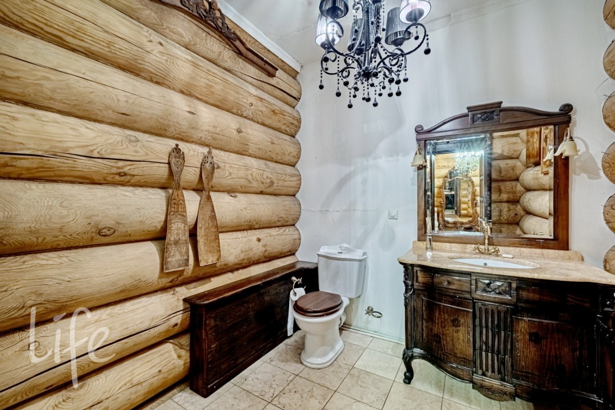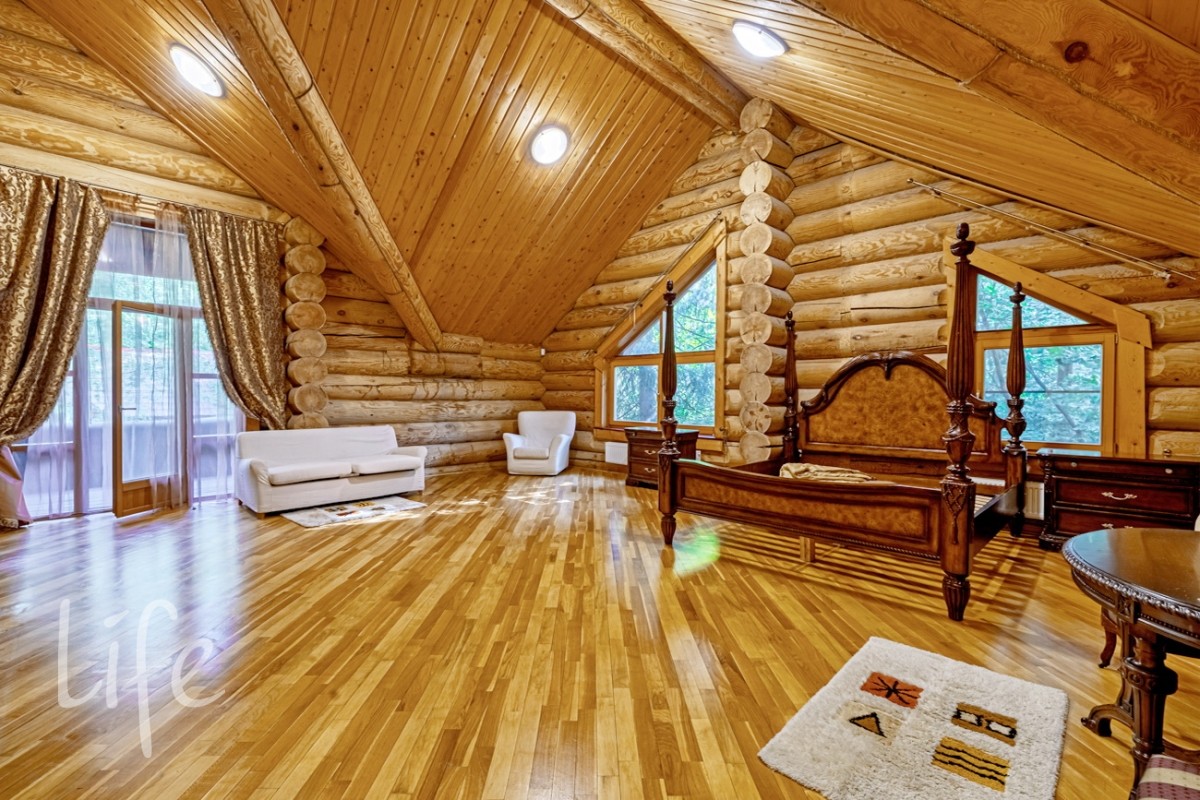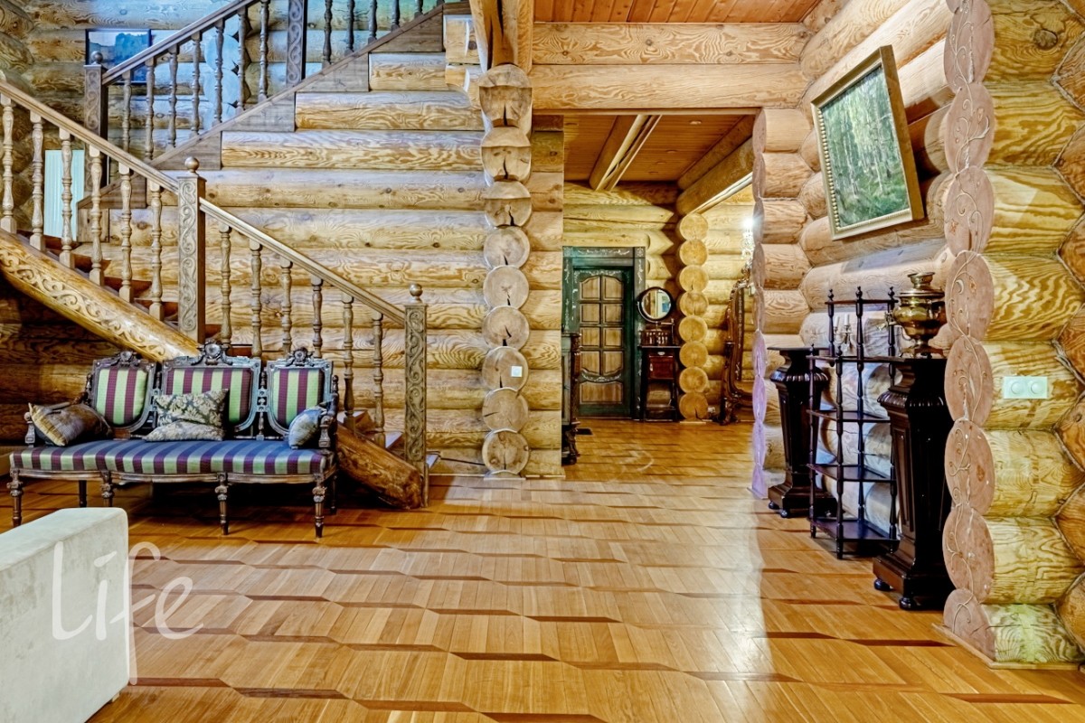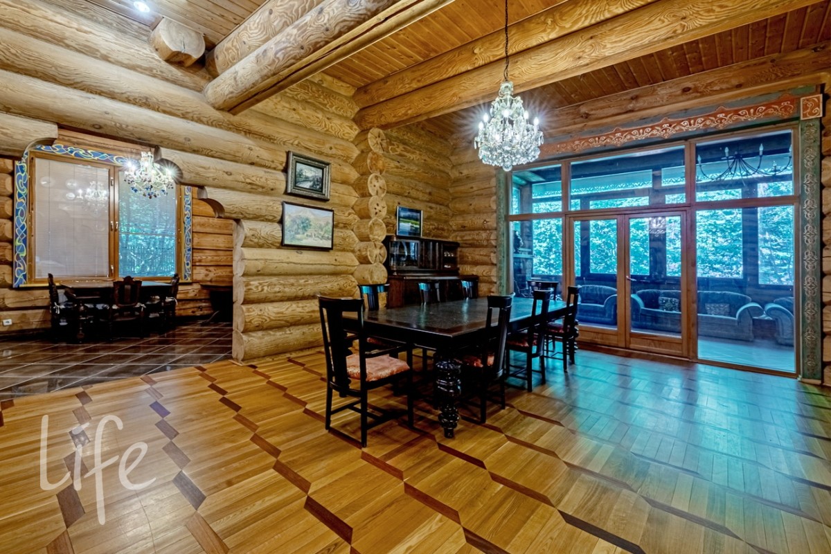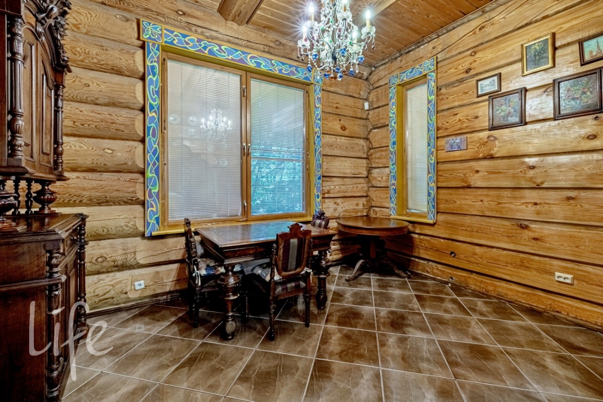 Ни с чем не сравнимая атмосфера экологичного деревянного дома, наполненность светом и воздухом за счет высоких потолков, огромных окон, просторных площадей. Ручная роспись, раритетная отреставрированная мебель, элементы и предметы декора, картины придают логическую завершенность интерьеру.