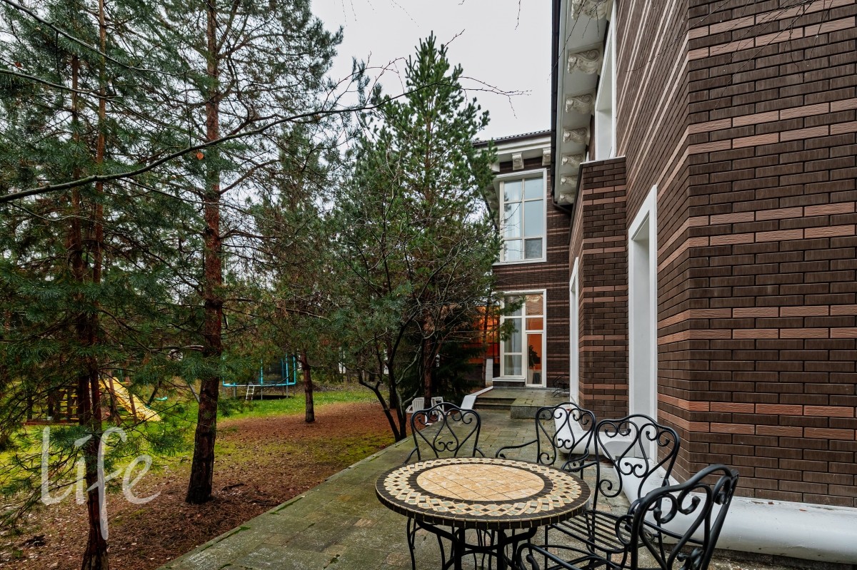 Участок правильной прямоугольной формы, выполнен ландшафтный дизайн. Газон, декоративные деревья и кустарники, садовые деревья. На территории расположены дом для обслуживающего персонала с двумя спальнями и ванными комнатами, гараж на три автомобиля, СПА-зона с бассейном 8х3,5 метра, зоной отдыха, мини-кухней-баром, с/у, сауной, джакузи, площадкой барбекю.