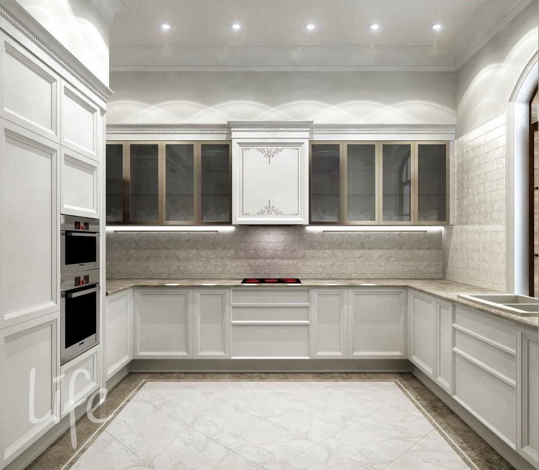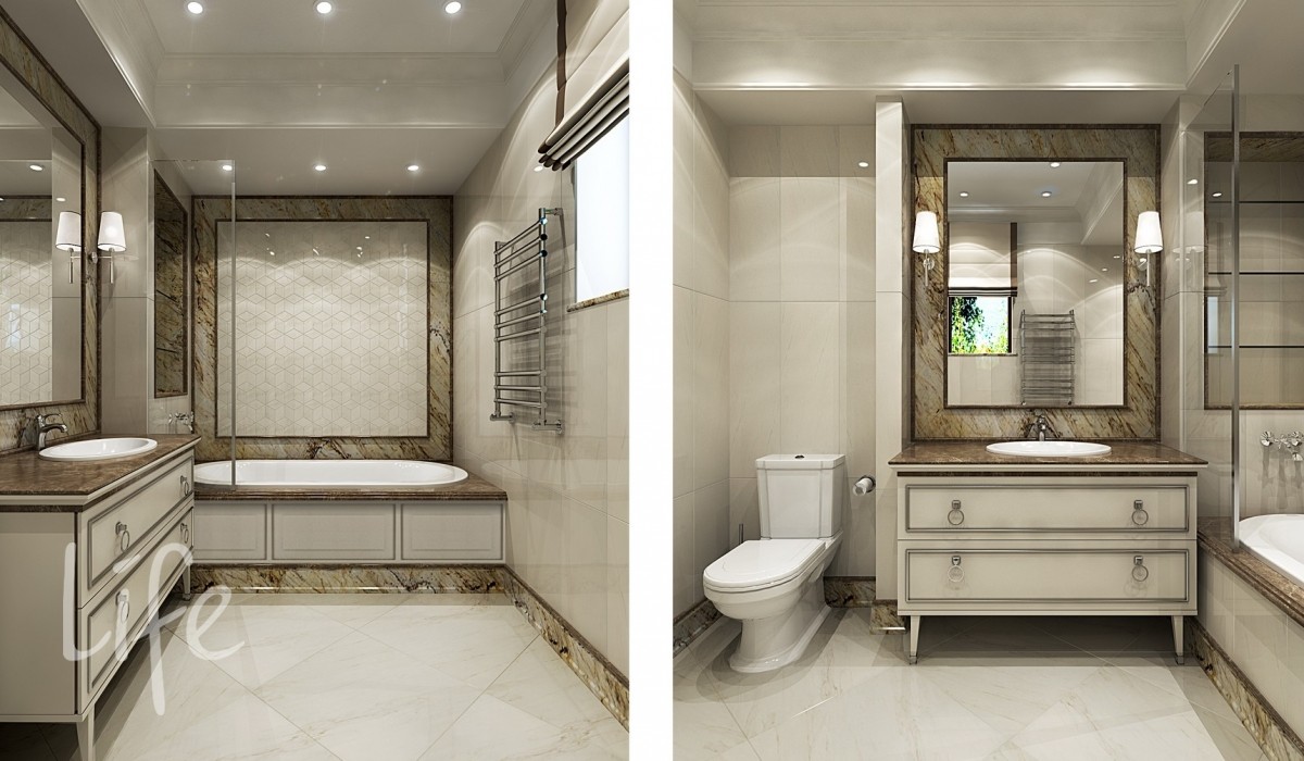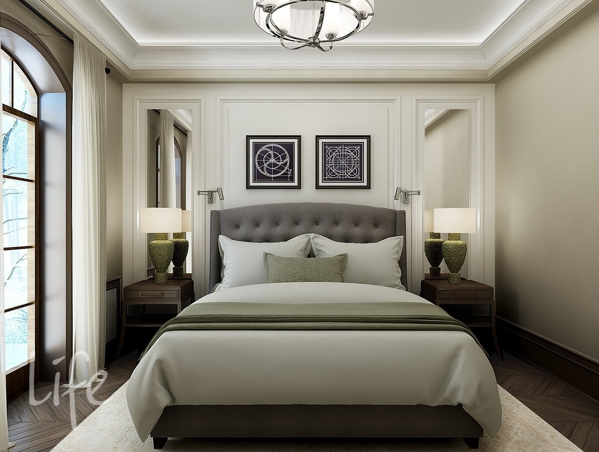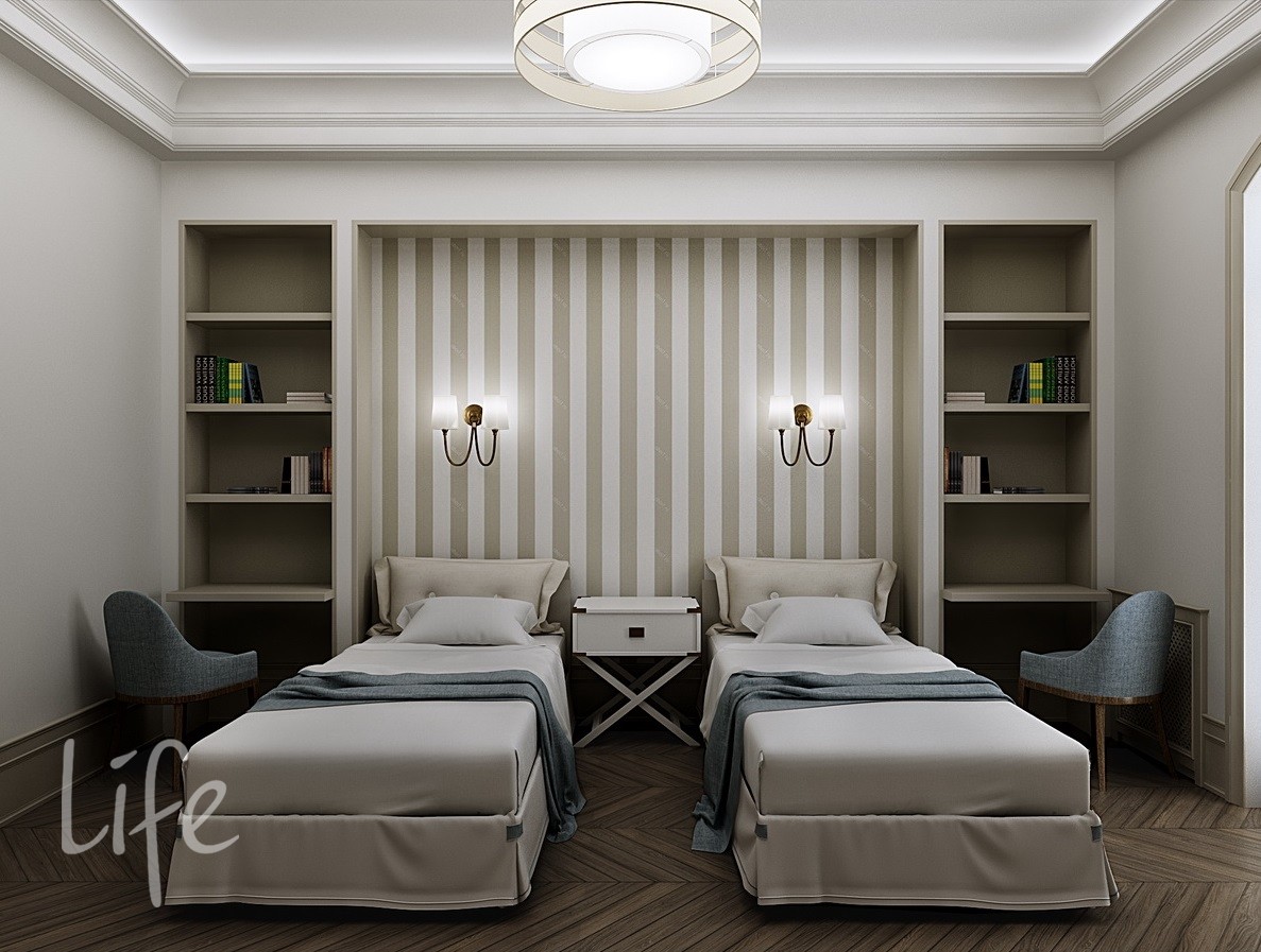 Интерьер выполнен в классическом стиле, в светлых мягких тонах, подобраны дорогая мебель и аксессуары.