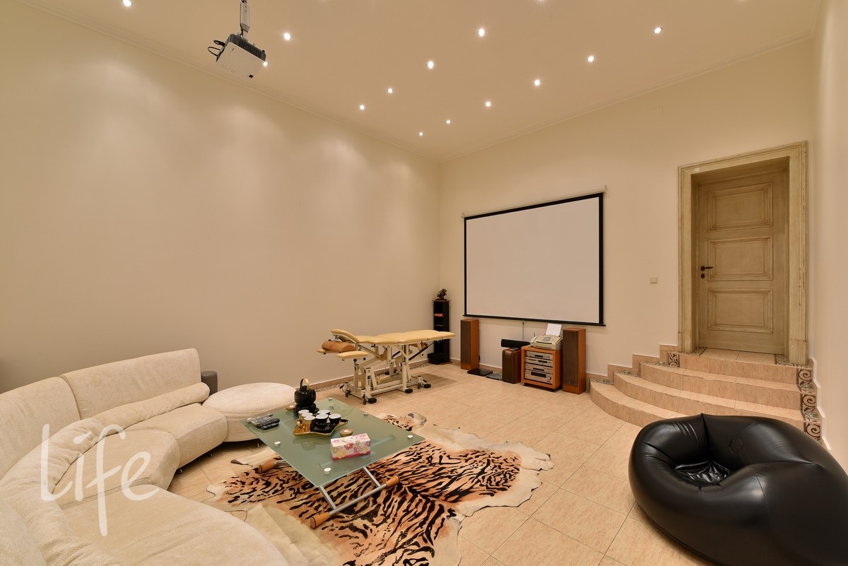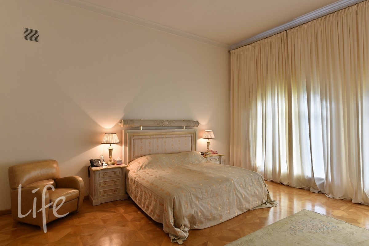 Планировка с пятью спальнями, гостиной, зоной СПА подойдет для комфортного проживания большой семьи. Есть блок для обслуживающего персонала в отдельно стоящем здании.