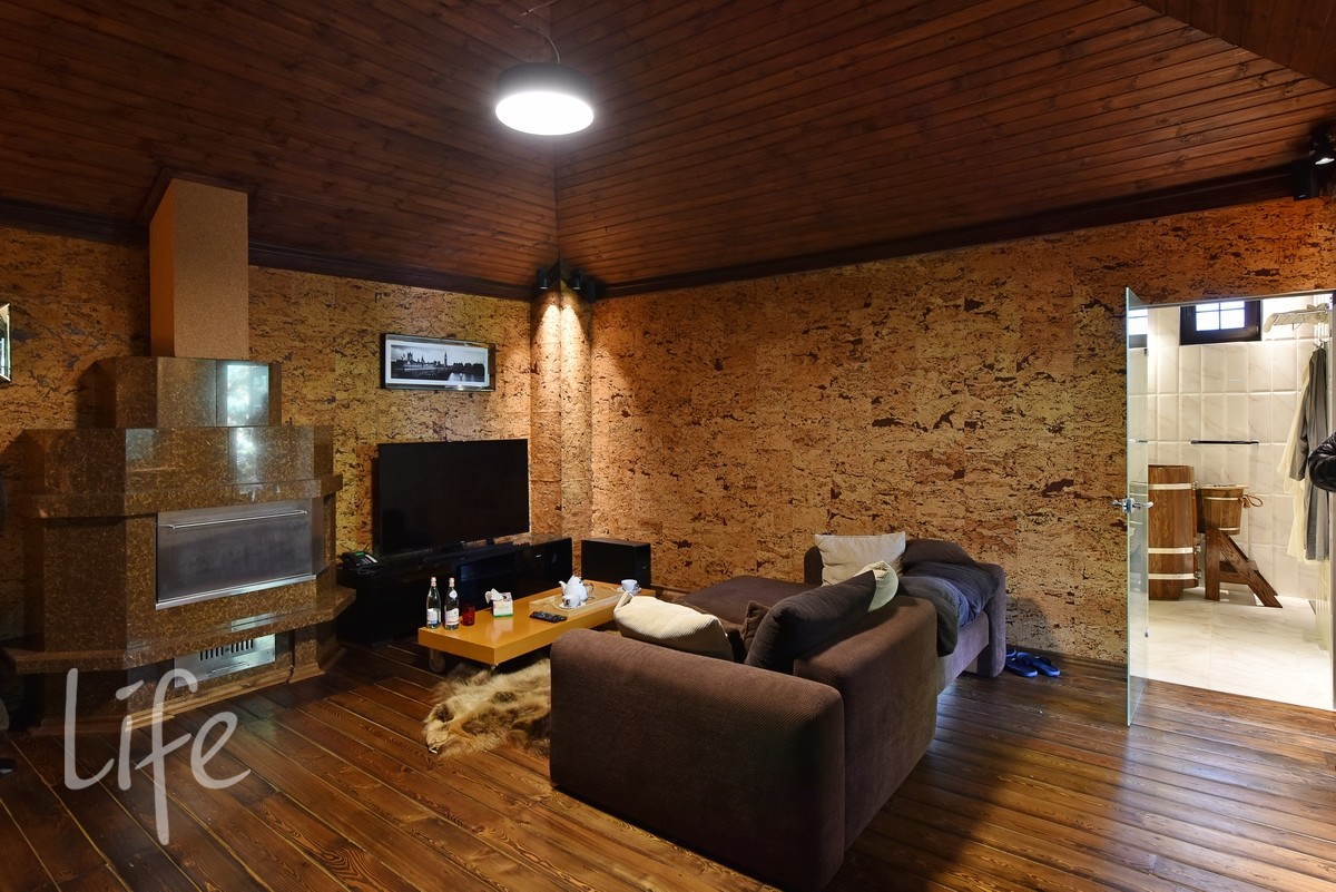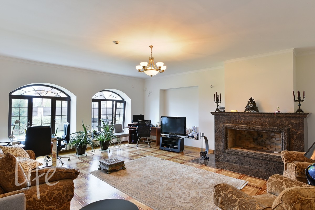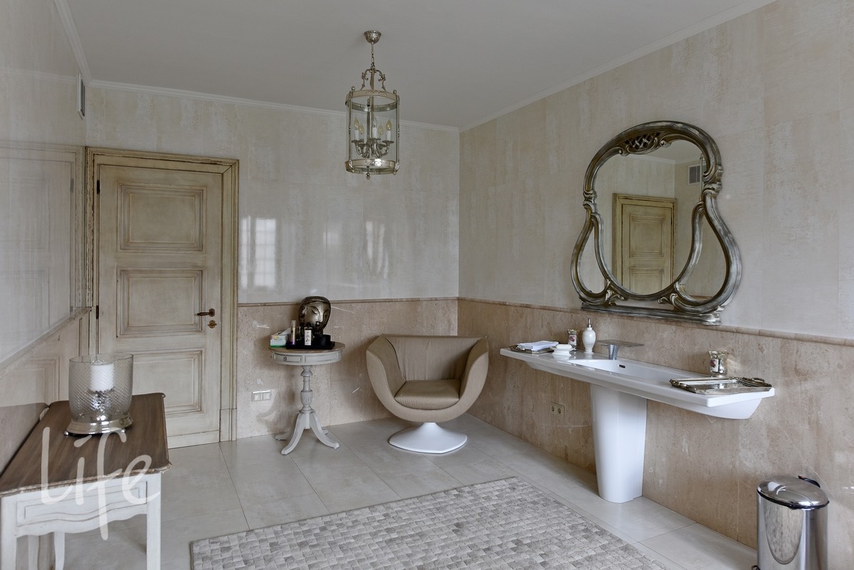 Интерьер выполнен в современном классическом стиле, со вкусом подобрана дорогостоящая мебель и аксессуары. Гостиная со вторым светом украшена действующим дровяным камином.