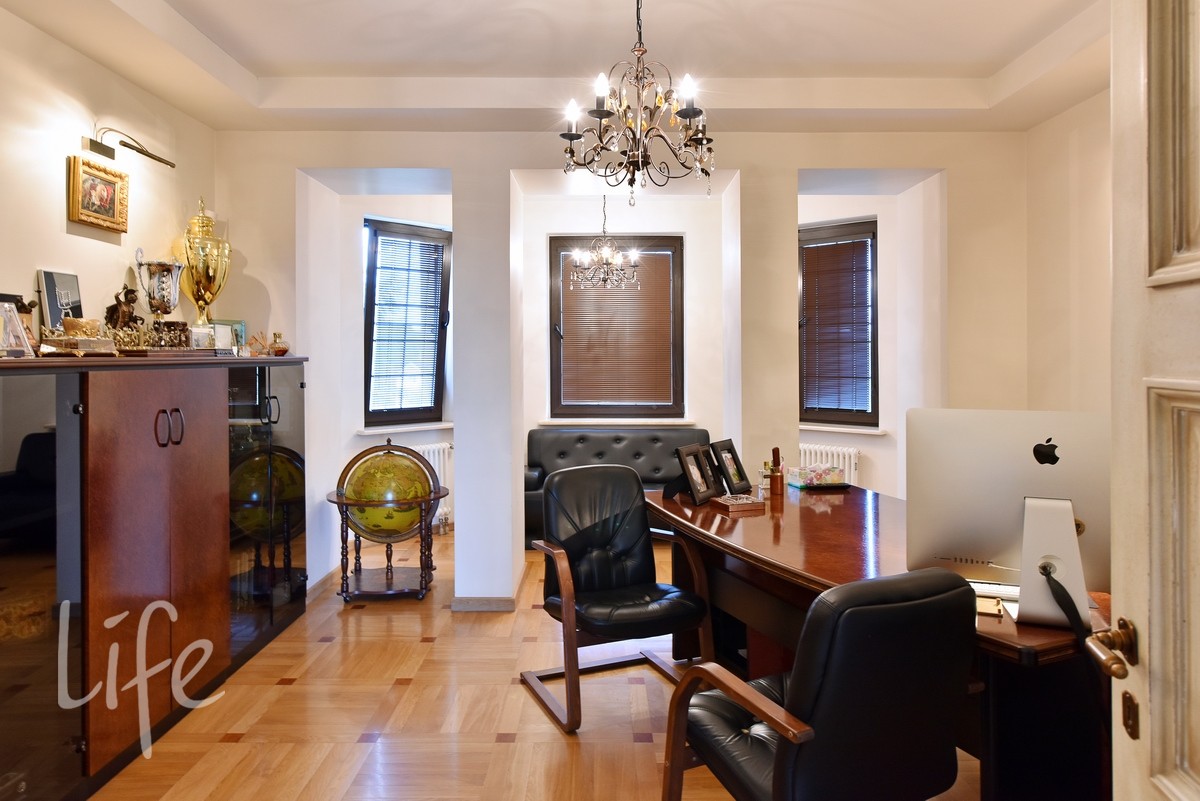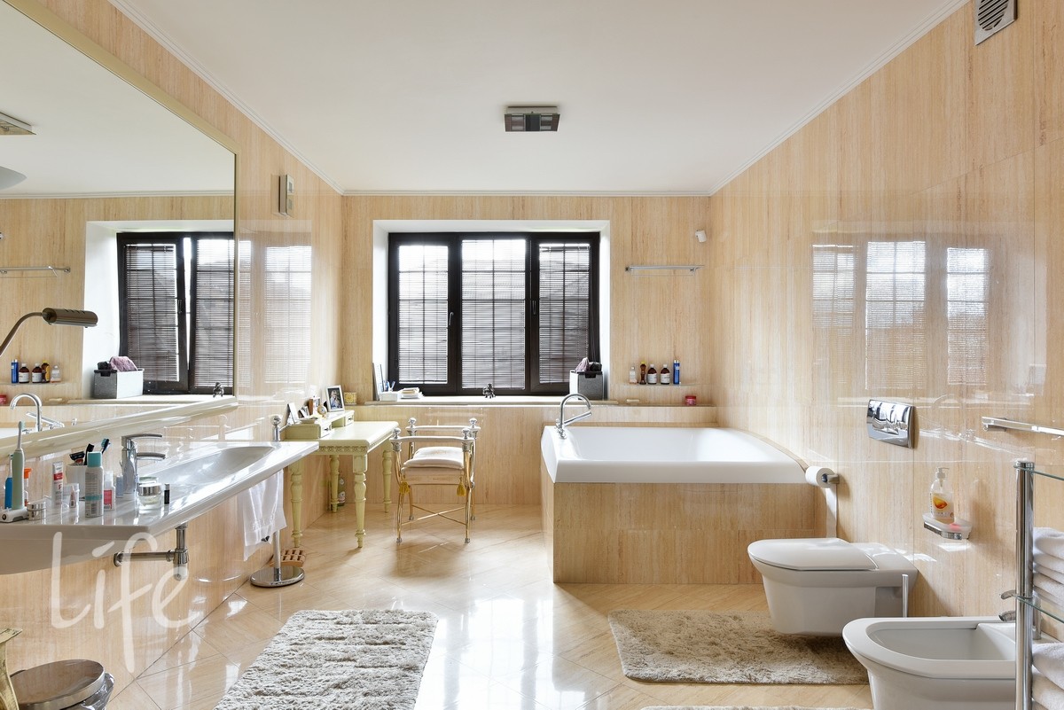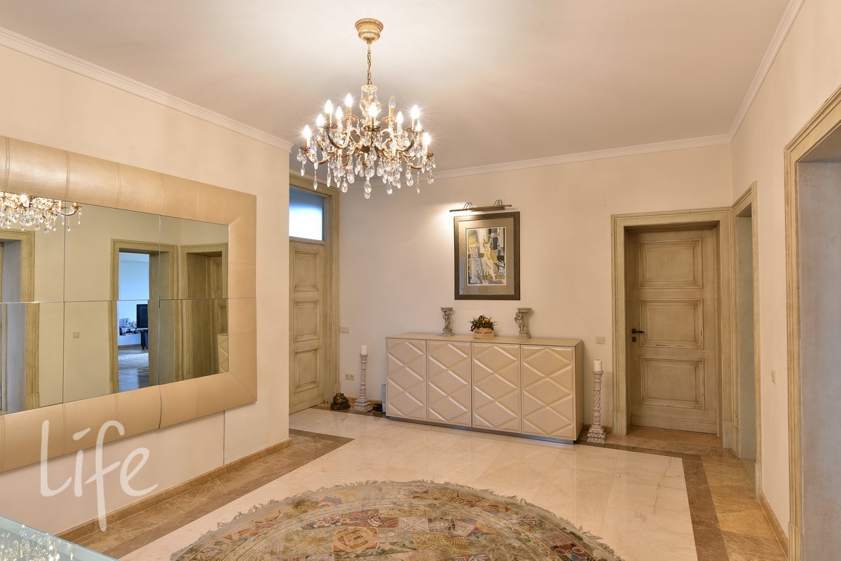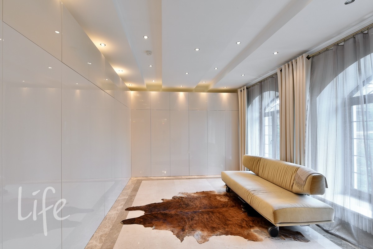 Интерьер выполнен в современном классическом стиле, со вкусом подобрана дорогостоящая мебель и аксессуары. Гостиная со вторым светом украшена действующим дровяным камином.