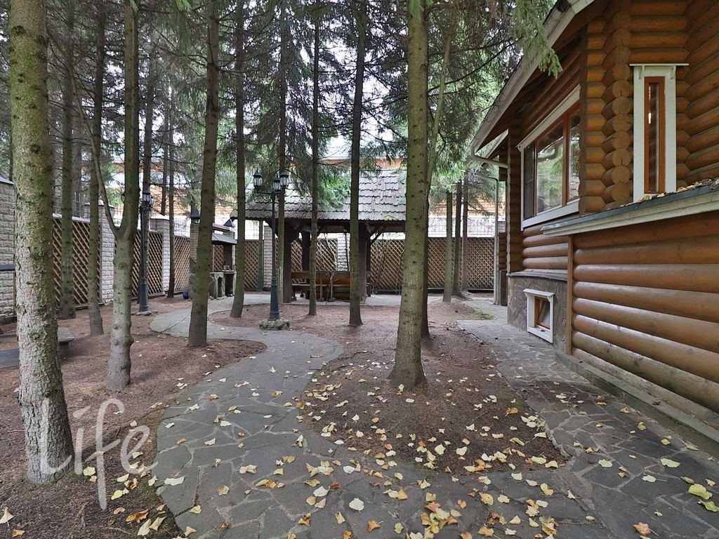 На участке парковочное место, дорожки, беседка с барбекю, елки и лиственные деревья. Очень тихое место.
