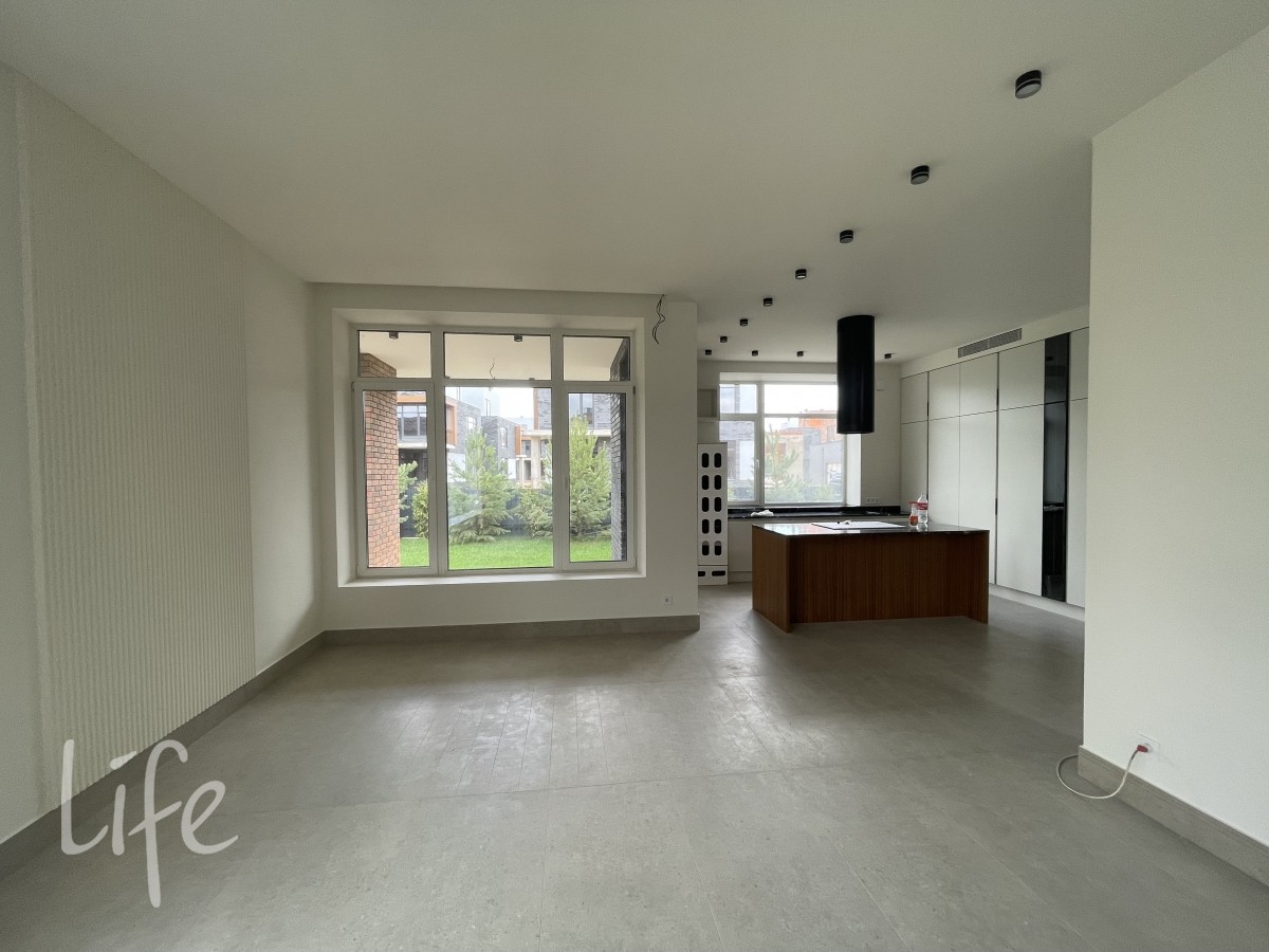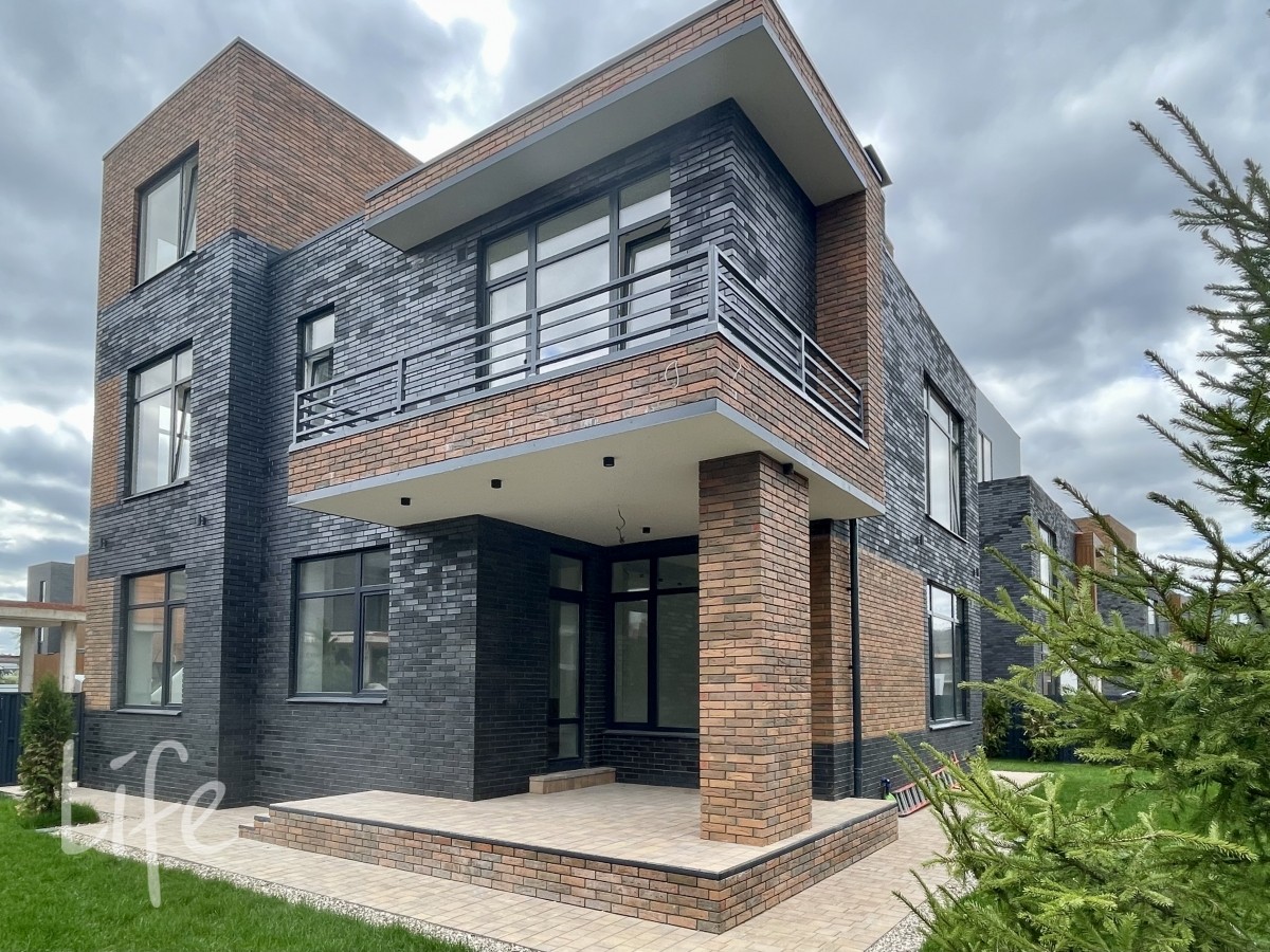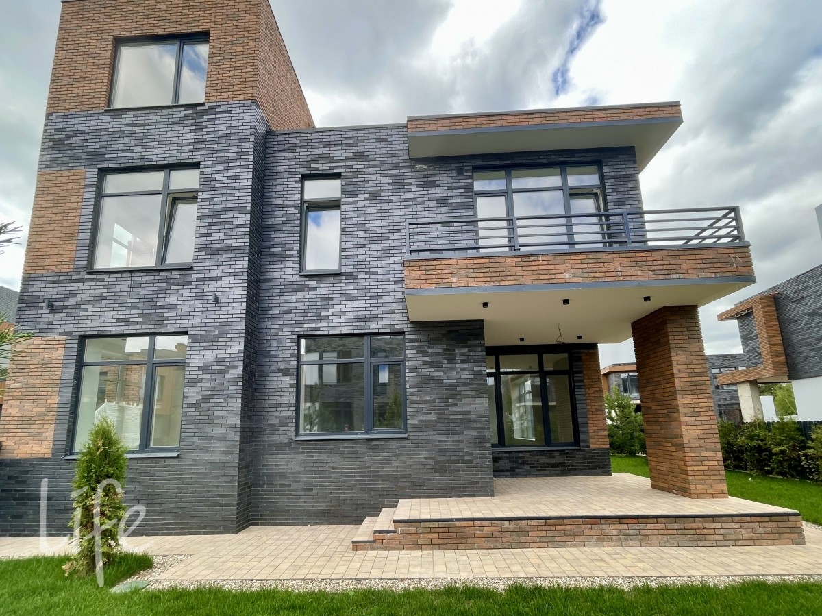 Охраняемый коттеджный поселок. Дом жилой, полностью под ключ, меблирован и оборудован всей необходимой бытовой техникой. Модный экстерьер дома, панорамное остекление, плоская кровля.