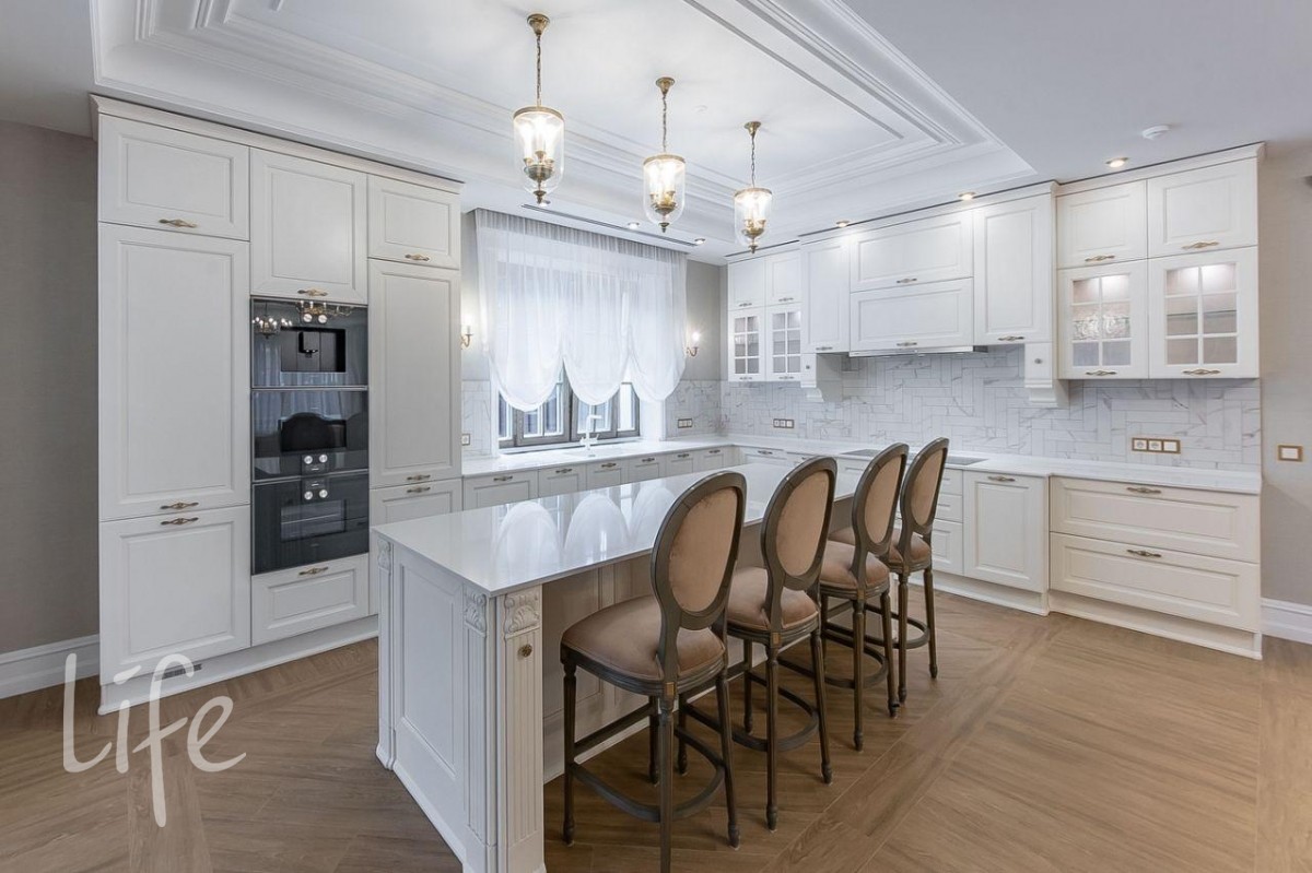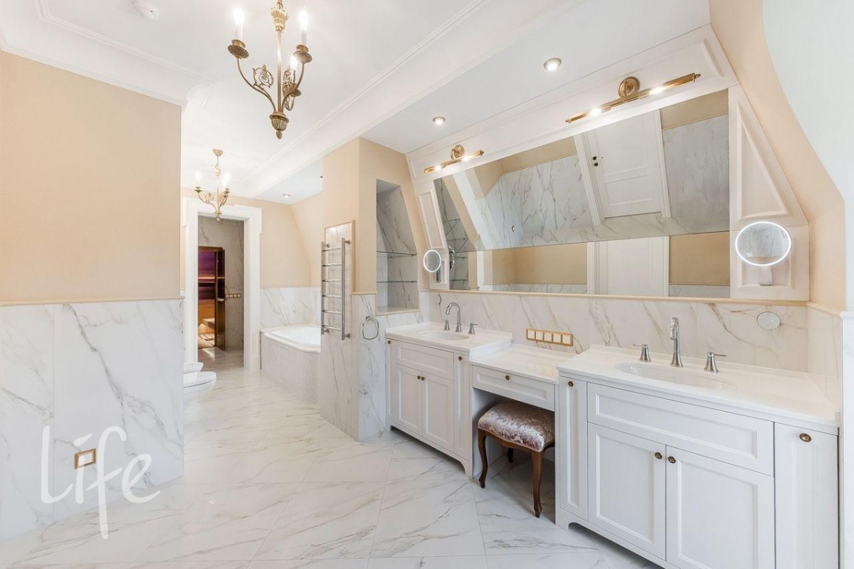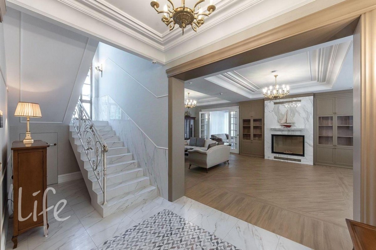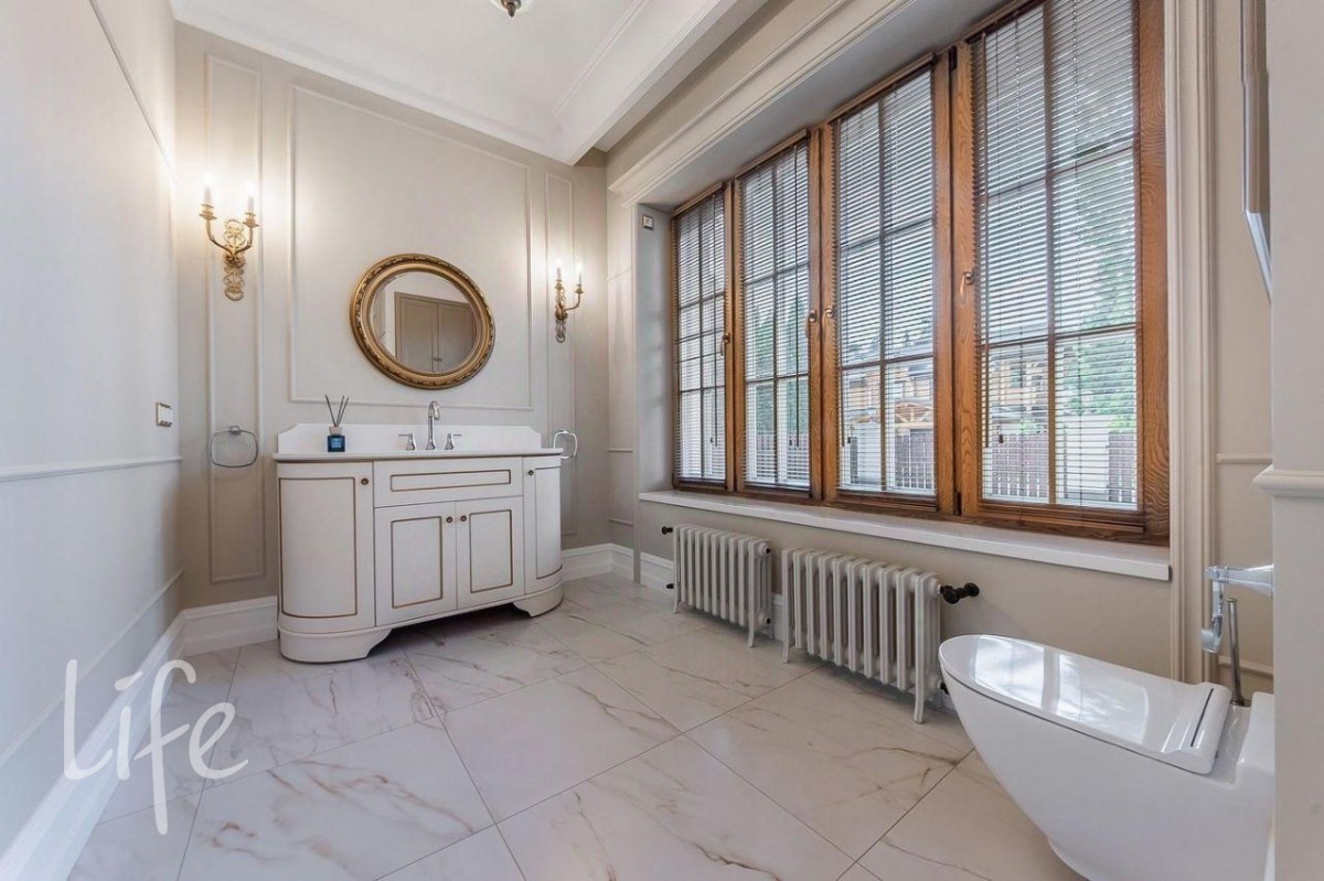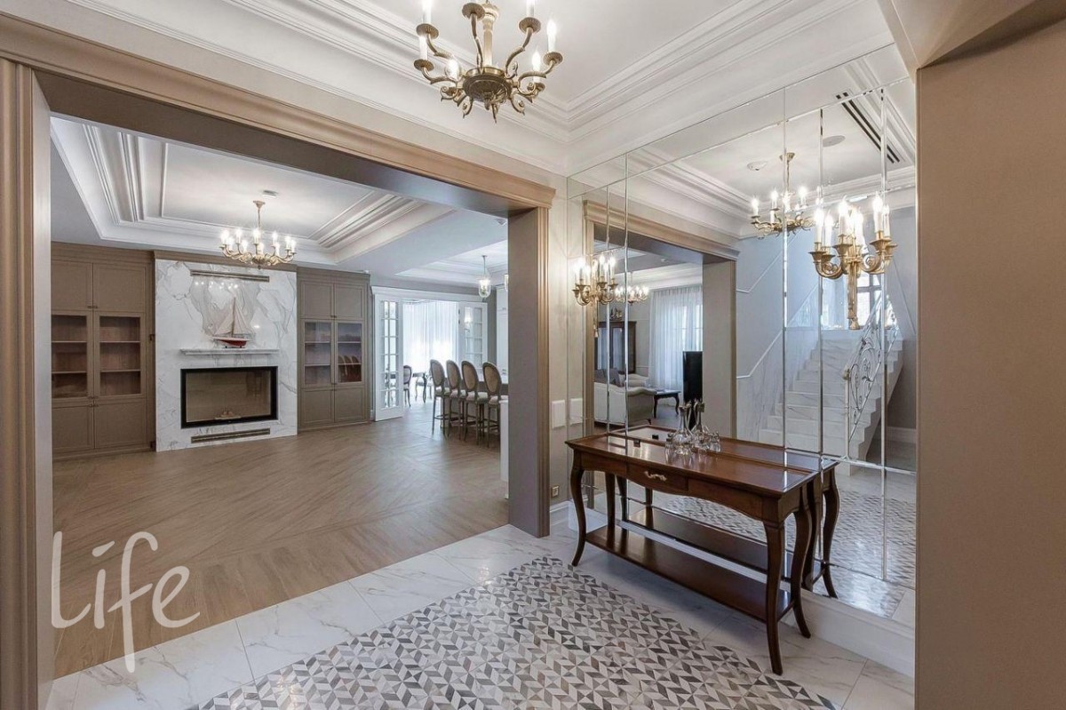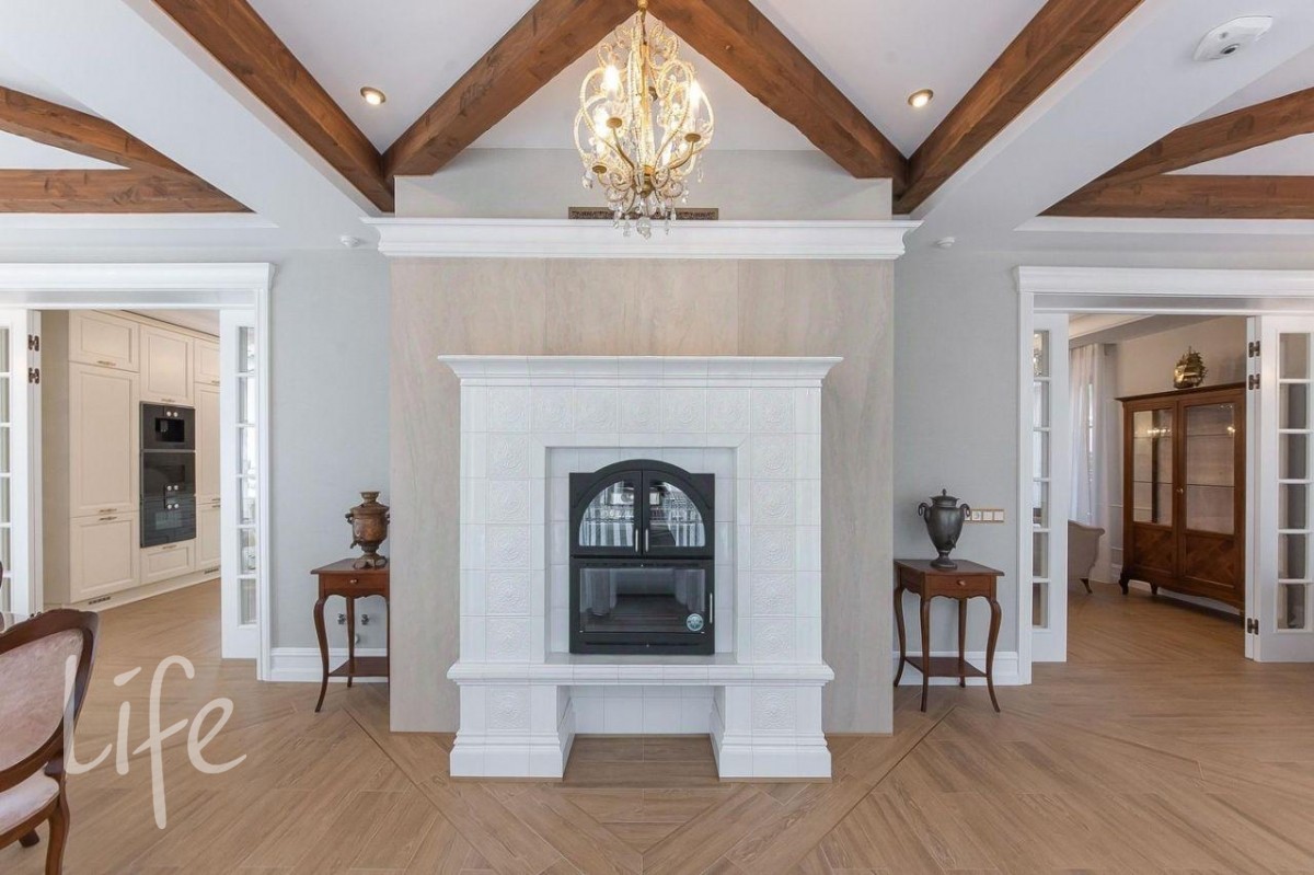 Интерьер в классическом стиле, в мягких, светлых тонах. Со вкусом подобрана мебель и аксессуары. Гостиную украшает шикарный дровяной камин, а в столовой установлена дровяная печь.