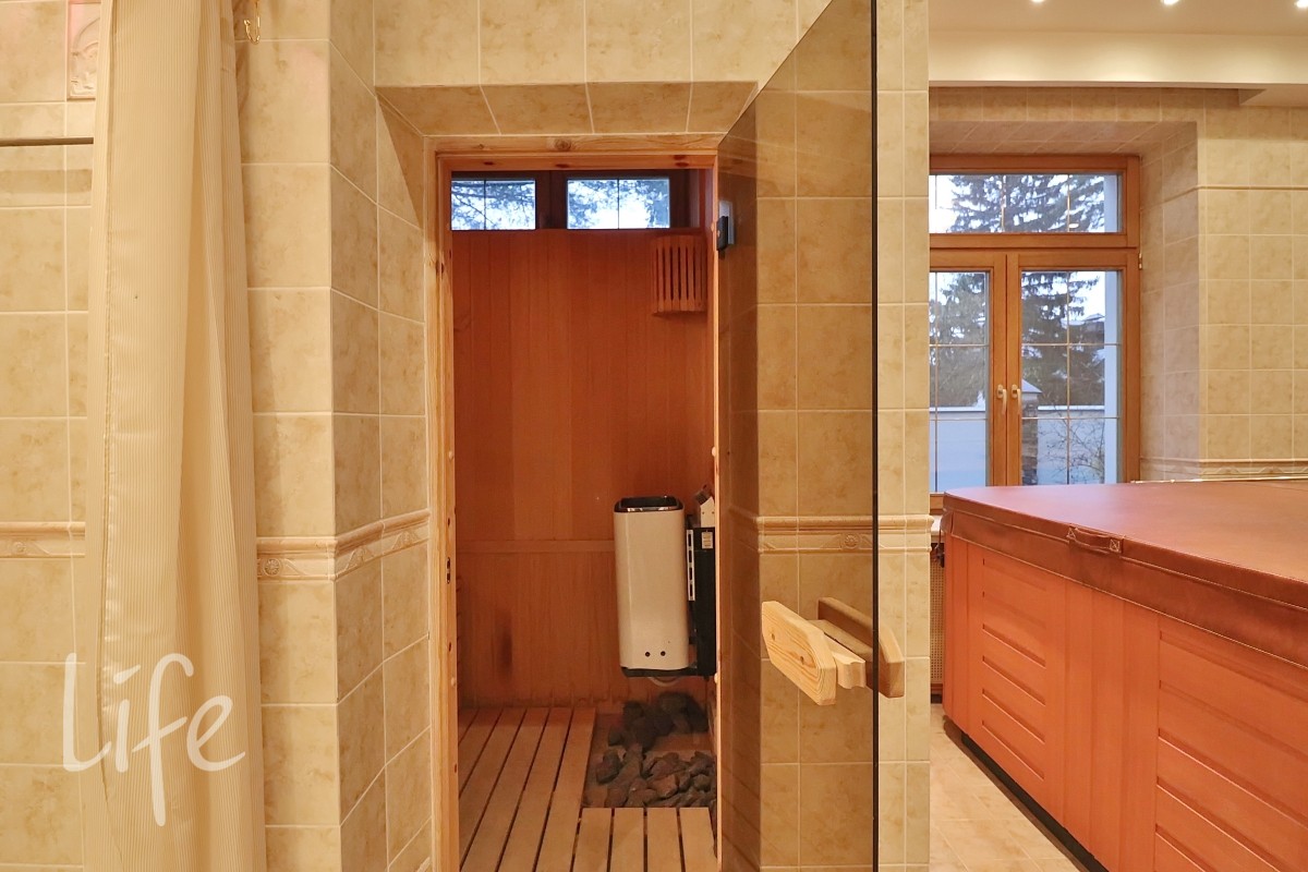 1 этаж: прихожая, гостиная, кухня с выходом на террасу, столовая, с/у, сауна, джакузи, комната отдыха с дровяным камином.