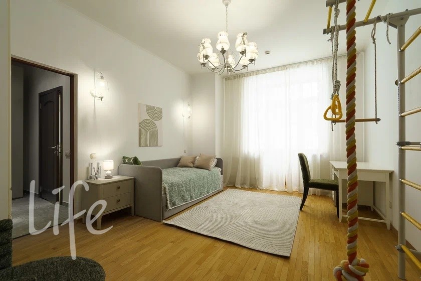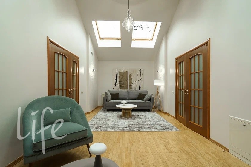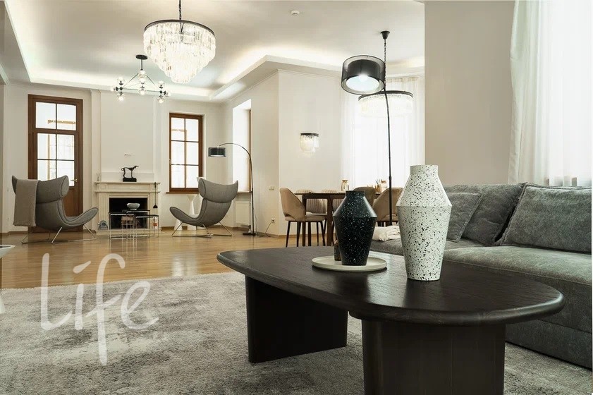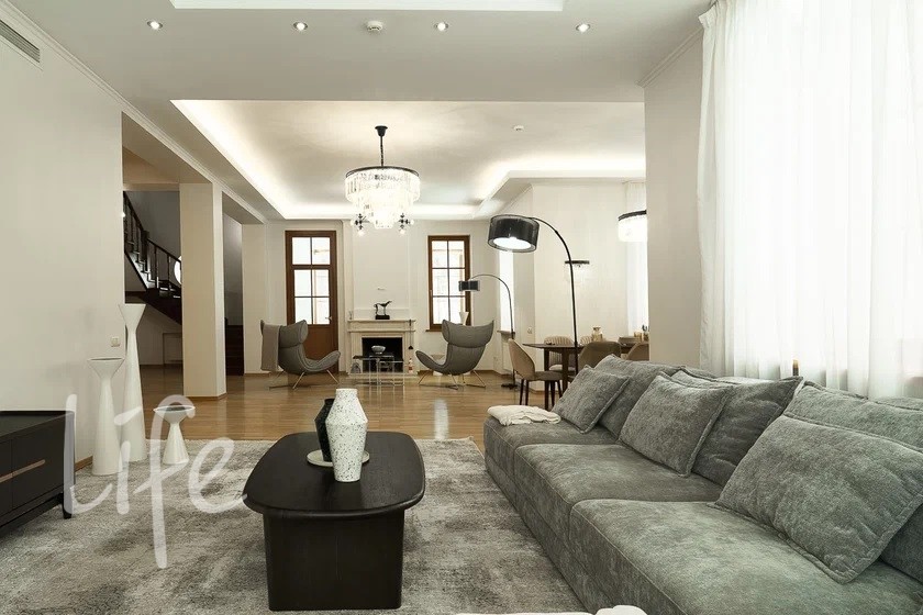 Интерьер выполнен в современном классическом стиле, в светлых мягких тонах. Гостиную украшает дровяной камин. В отделке использовались натуральные материалы: мрамор, гранит, дерево.