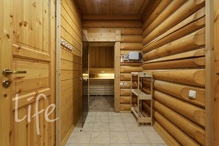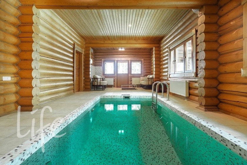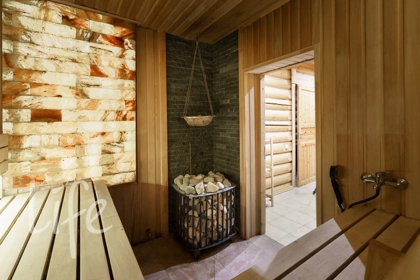 Баня: комната отдыха, бассейн, сауна, гостевая спальня, крытая терраса, лаунж-зона на втором этаже.