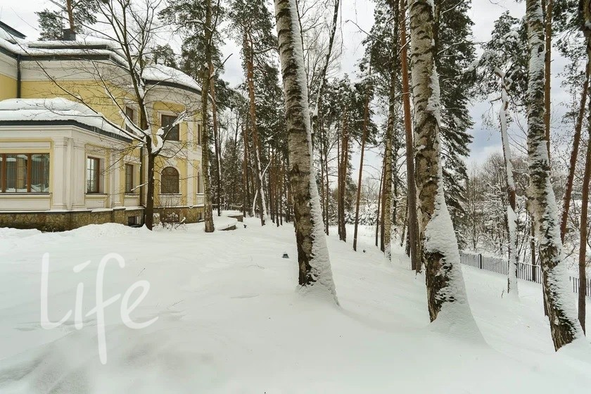 Участок с лесными деревьями, выполнен ландшафтный дизайн. Дорожки, ночное освещение, автополив. На территории расположена деревянная баня с зоной отдыха, бассейном и дом для персонала с гаражом на два автомобиля. Собственный выход к Москве-реке.