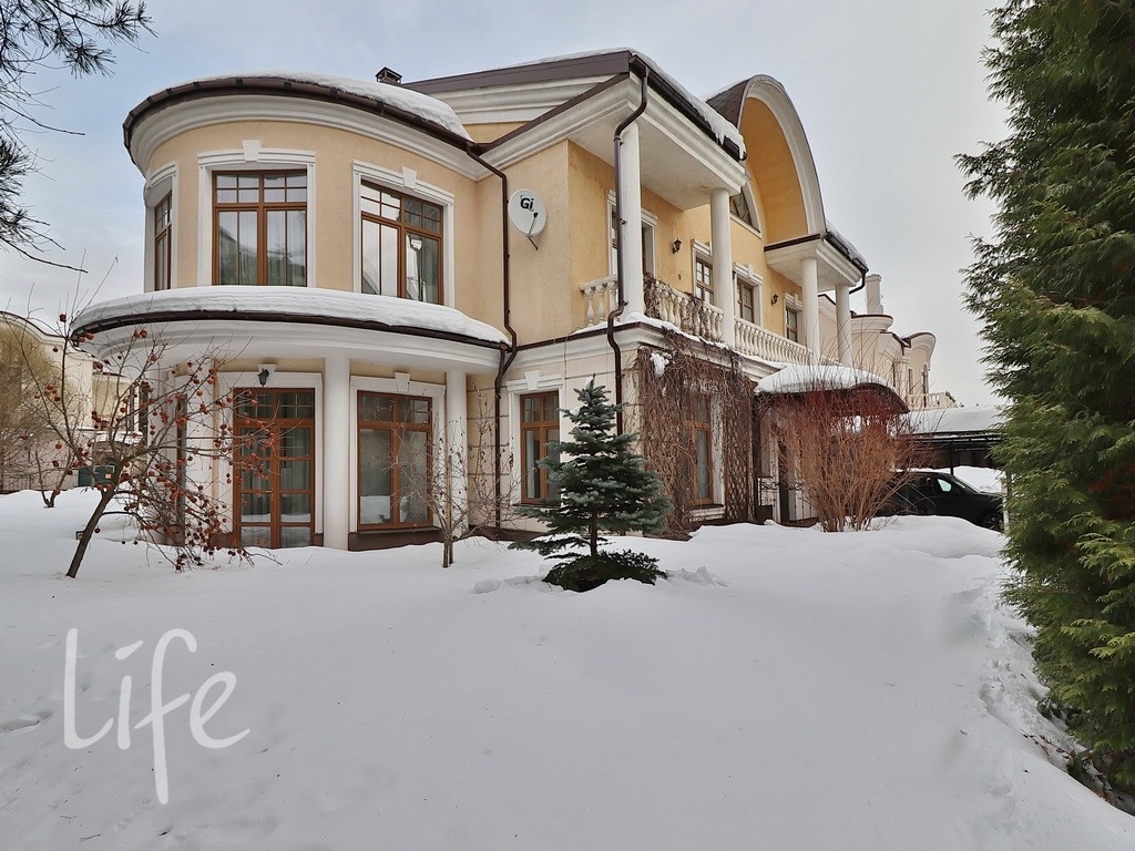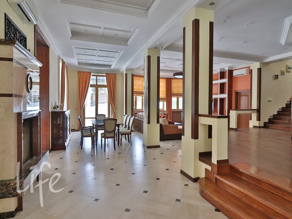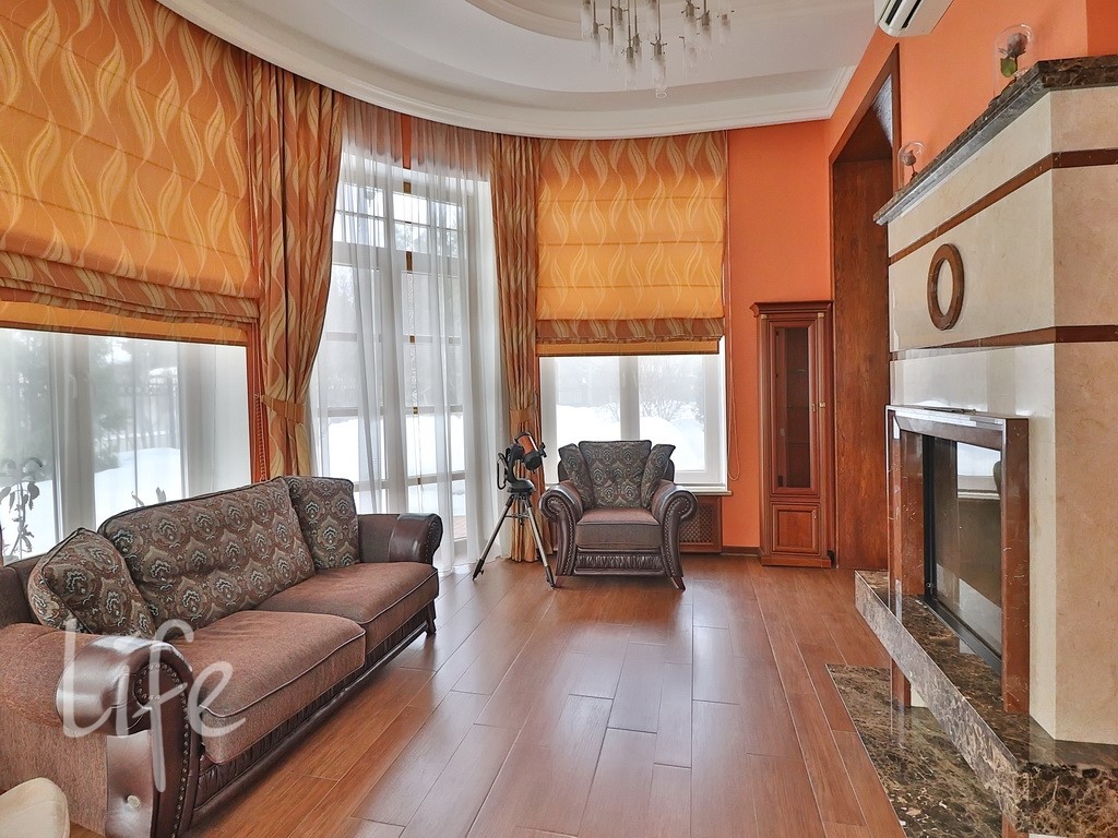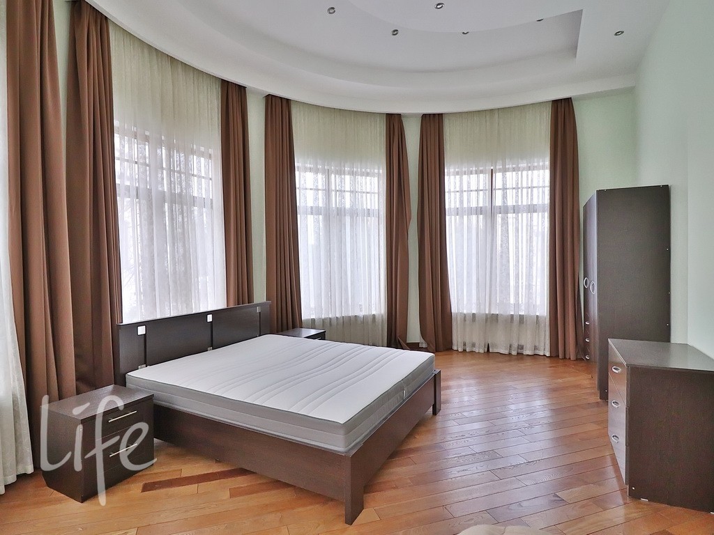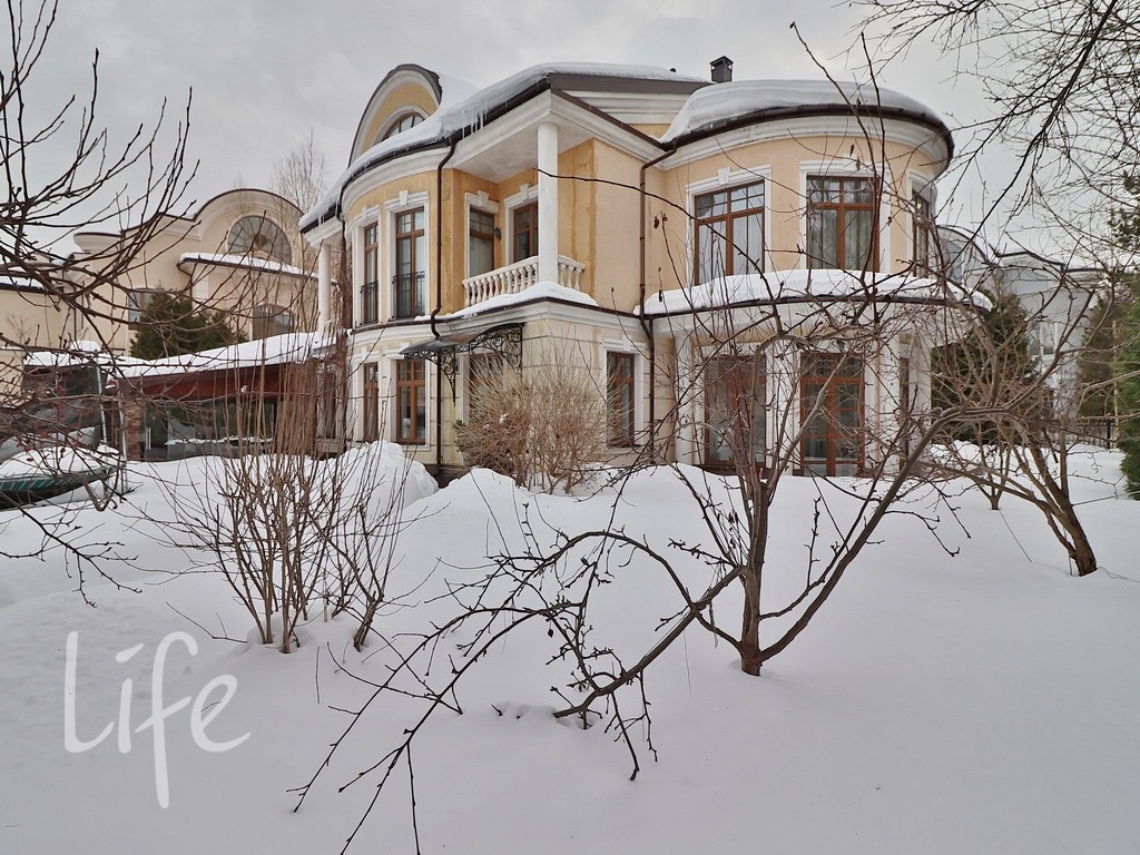 Планировка дома продумана до мелочей: пять спален, просторная гостиная, кабинет. В отдельном здании расположена баня. Все коммуникации центральные. В доме установлены тёплые полы и кондиционеры. А ещё здесь очень приятная хозяйка. В посёлке действует строгий пропускной режим. На его территории находятся: