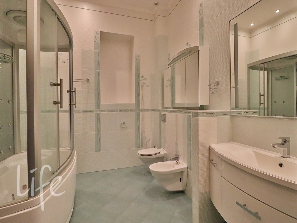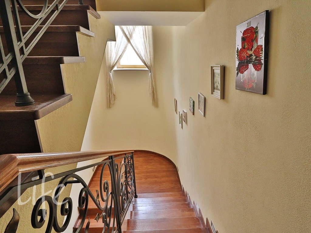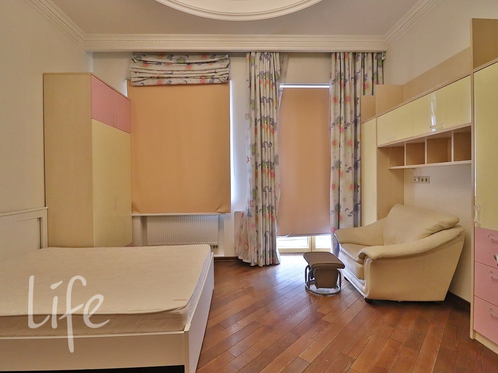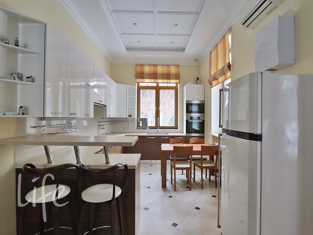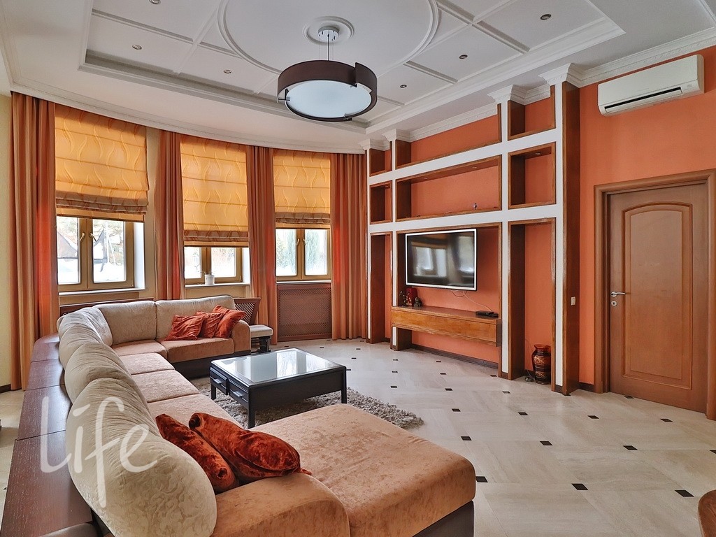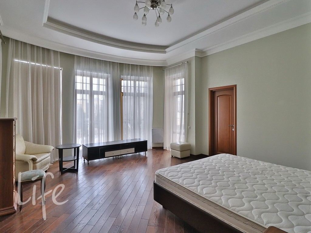 Планировка дома продумана до мелочей: пять спален, просторная гостиная, кабинет. В отдельном здании расположена баня. Все коммуникации центральные. В доме установлены тёплые полы и кондиционеры. А ещё здесь очень приятная хозяйка. В посёлке действует строгий пропускной режим. На его территории находятся: