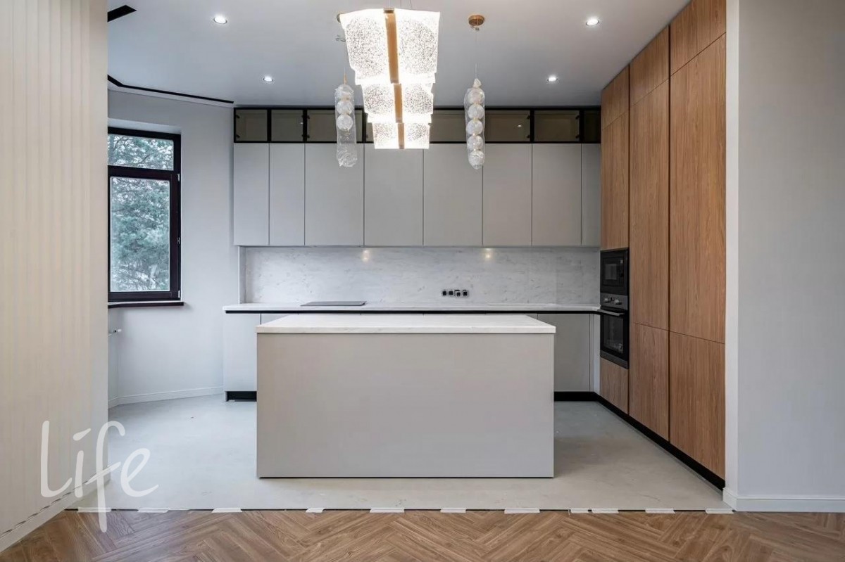 Интерьер выполнен в современном классическом стиле, в мягких светлых тонах. На кухне установлен кухонный гарнитур.