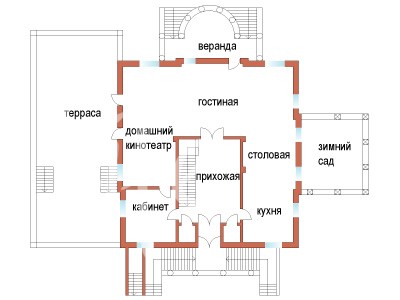 1 этаж: тамбур, прихожая, с/у, гардероб, кабинет, кухня, столовая, домашний кинотеатр, гостиная, зимний сад, веранда, терраса.