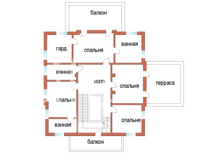 2 этаж: холл, четыре спальни, три ванных, гардеробная, терраса, два балкона.