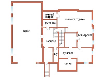 Цоколь: гараж, помещение для отдыха, раздевалка, душевая, сауна, постирочная, котельная, с/у, коридор, бильярдная, винный погреб.