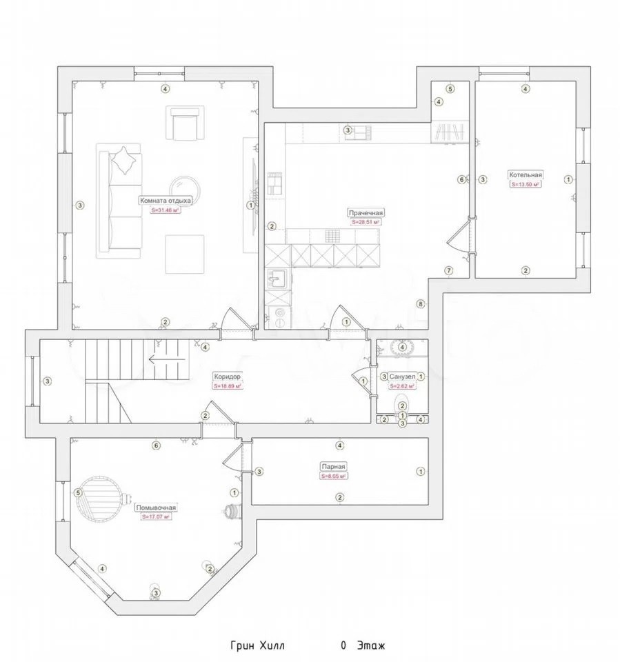 Цоколь: холл с лестницей, комната отдыха, сауна, с/у, душ, постирочная, котельная.