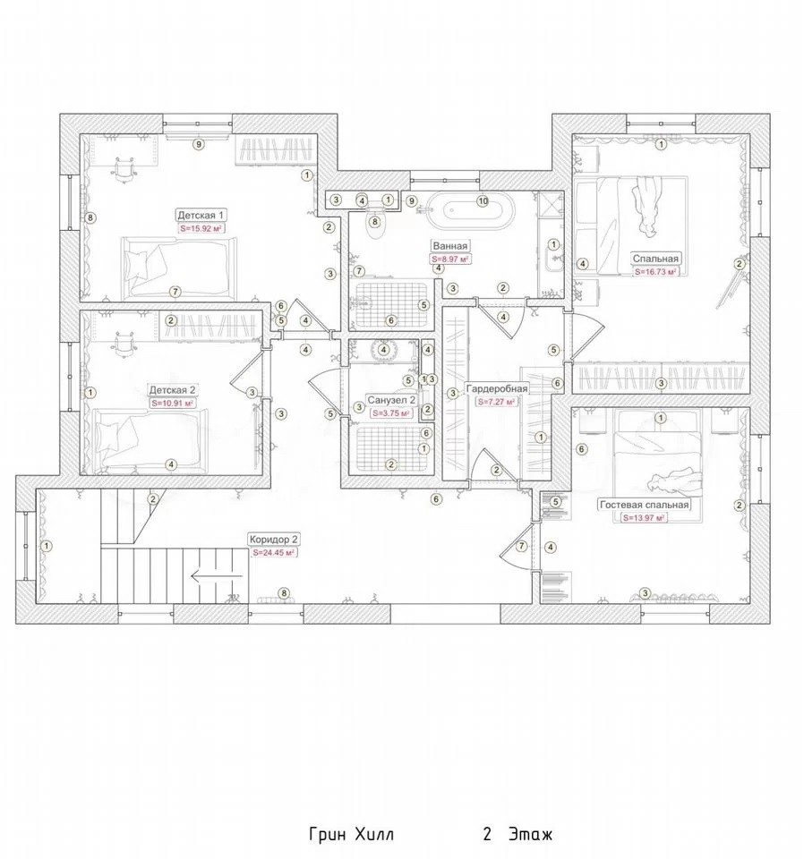 2 этаж: мастер спальня с гардеробной и ванной комнатой, три спальни, с/у.