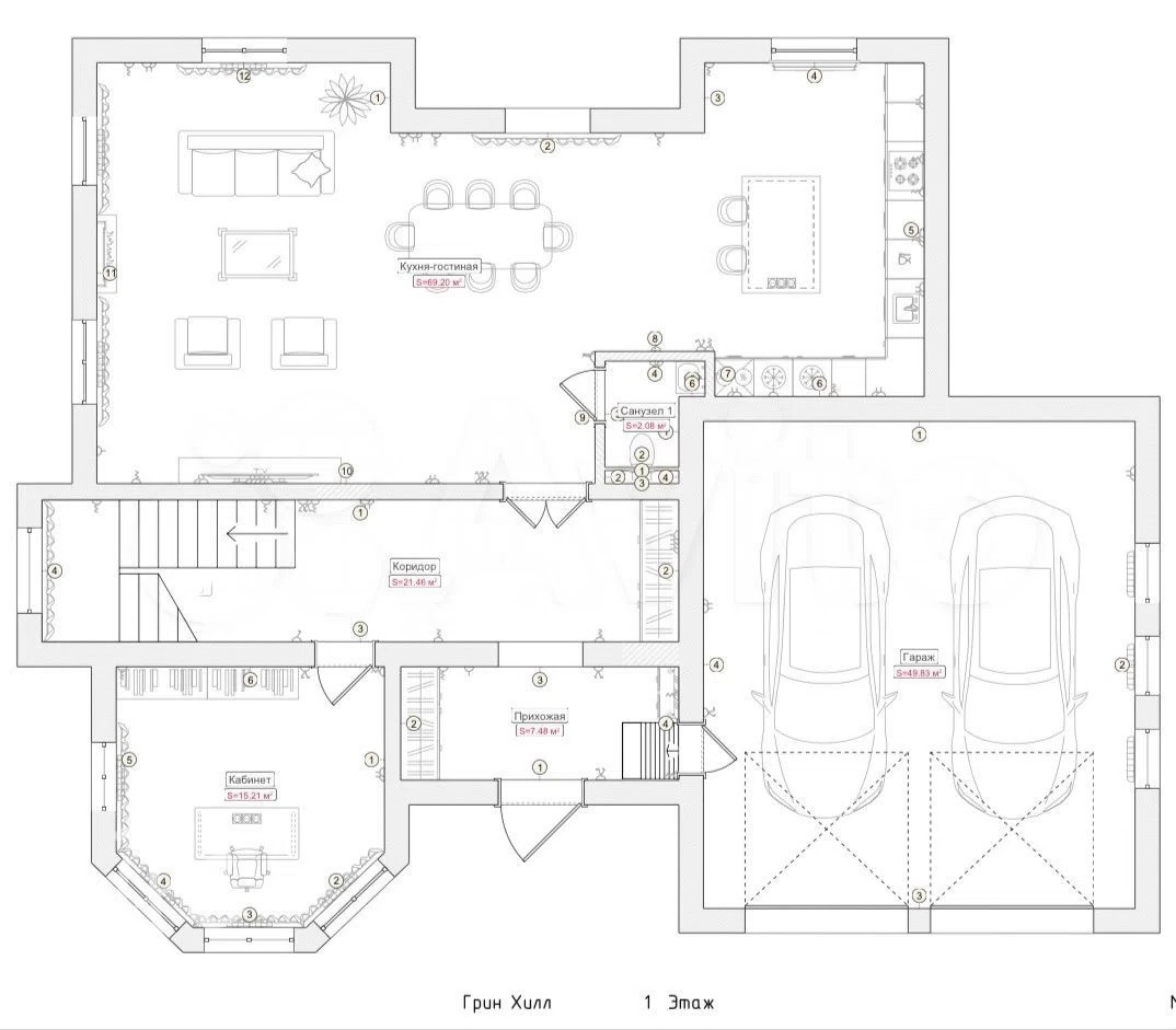 1 этаж: прихожая, гардеробная, холл, кабинет, гостиная-кухня-столовая, с/у, терраса, гараж на два автомобиля.