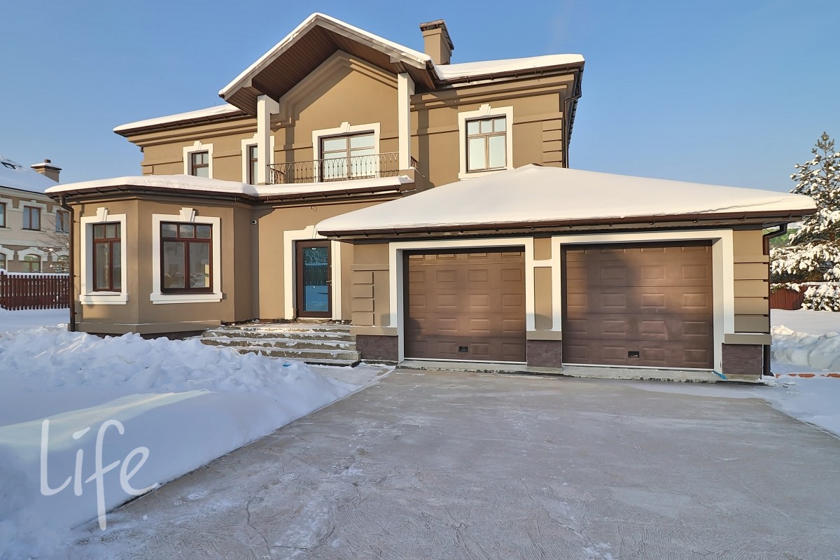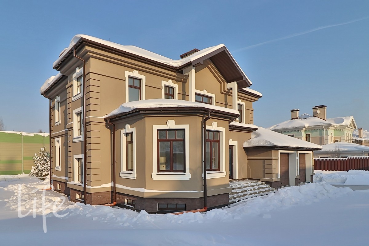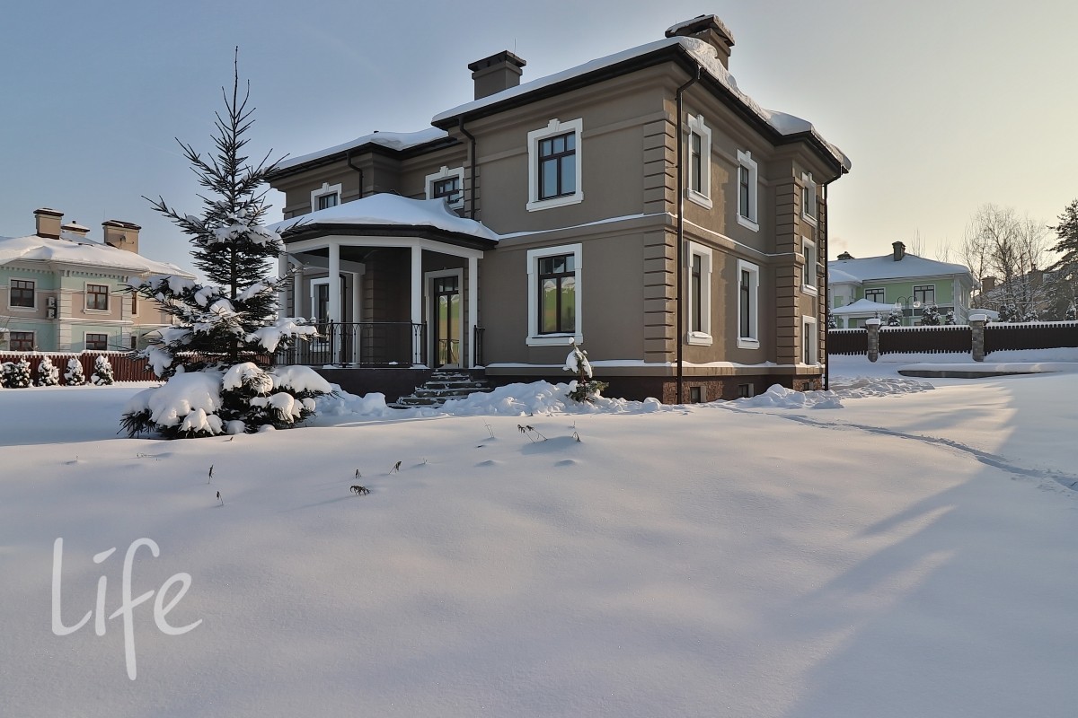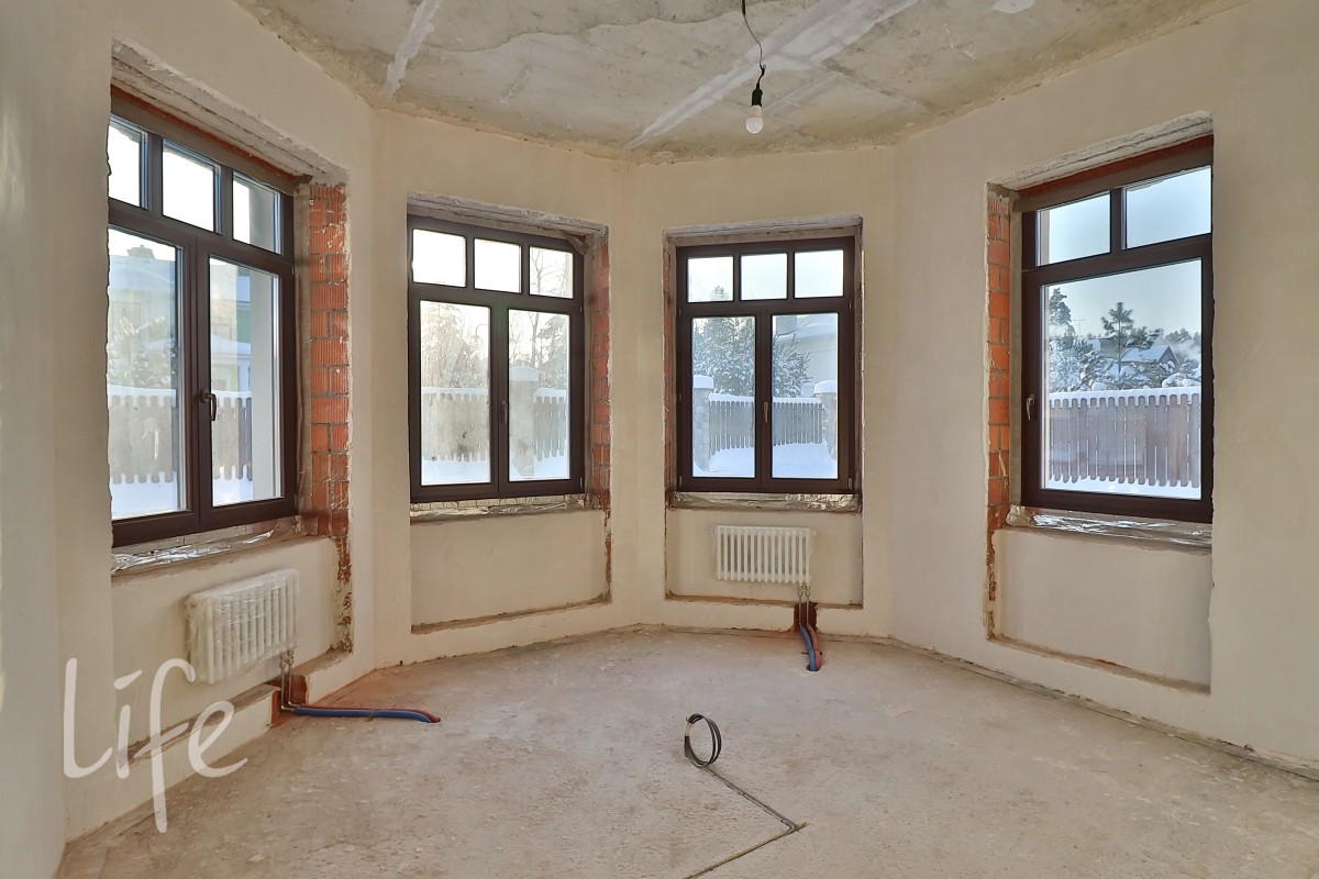 Охраняемый поселок. Новый дом под чистовую отделку в состоянии «White Box». Конструктив: монолитные фундамент и перекрытия, стены — кирпич, крыша — мягкая кровля.