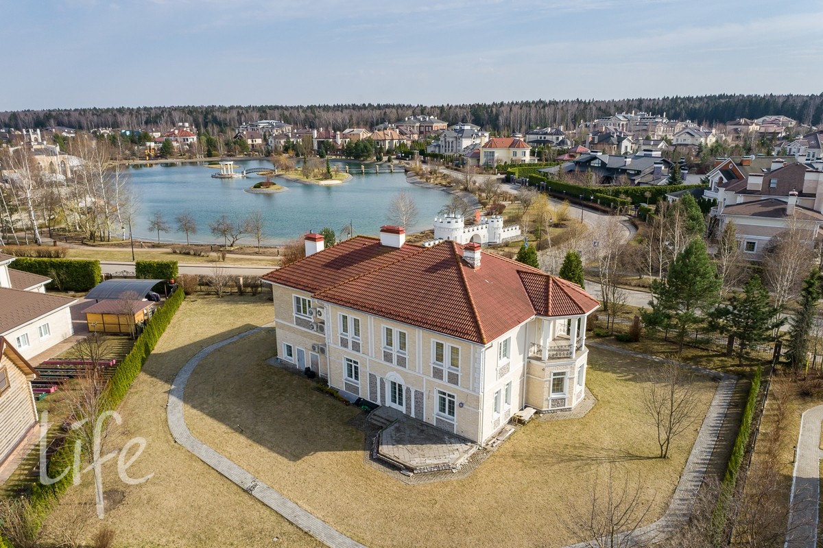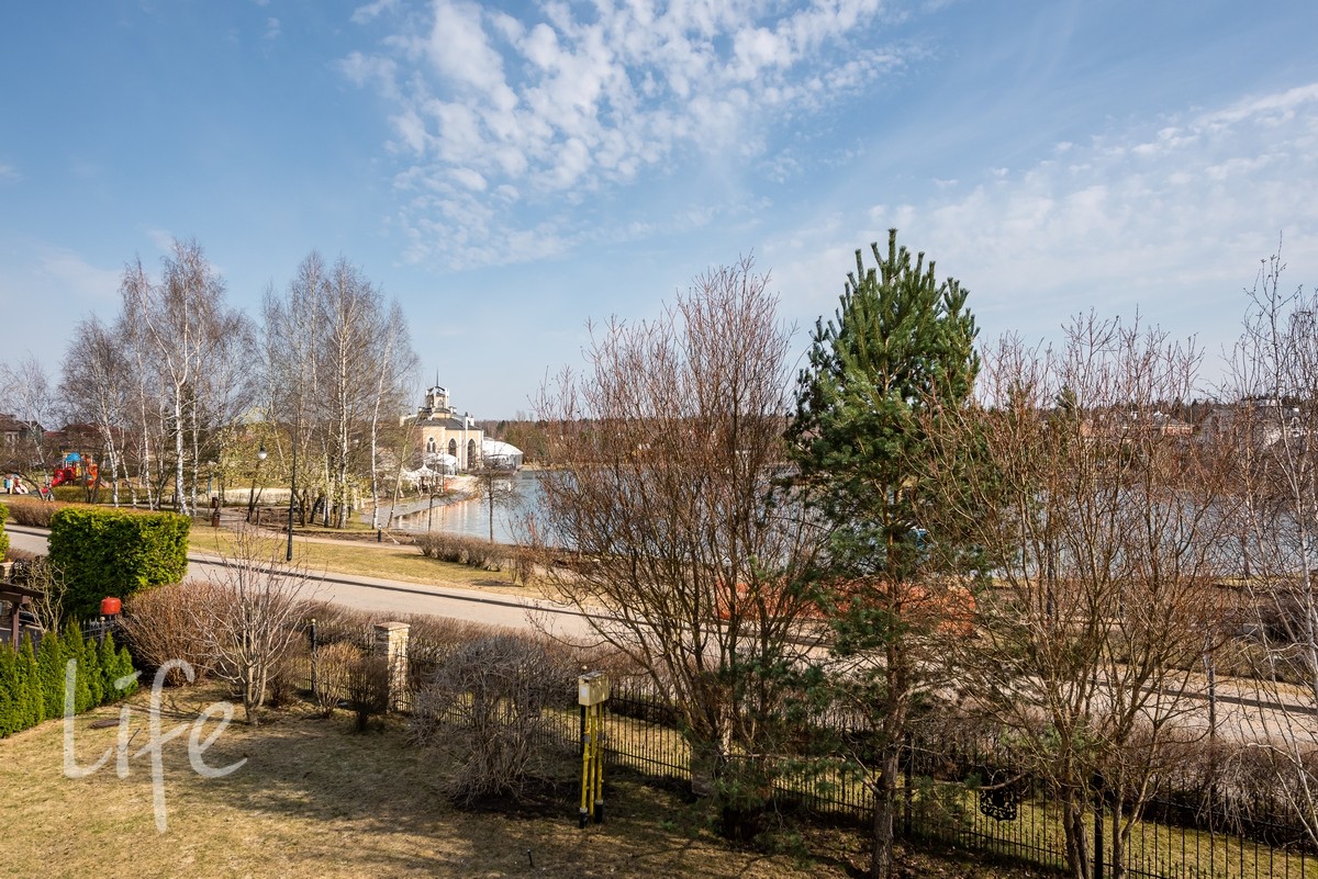 Участок правильной прямоугольной формы, с ландшафтным дизайном. Газон, декоративные деревья и кустарники. Одно из преимуществ участка — 1-я линия у озера.