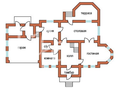 1 этаж: прихожая, гостиная, кухня-столовая, кабинет/спальня, с/у, терраса, подсобные помещения, гараж.
