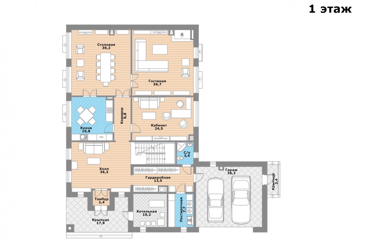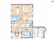1 этаж: гостиная, столовая, кухня, кабинет или спальня, холл, гардеробная с выходом к гаражу, санузел, постирочная, котельная.