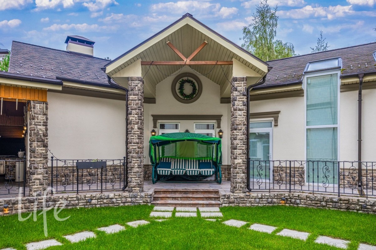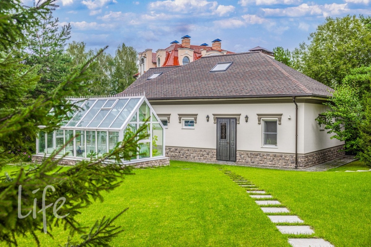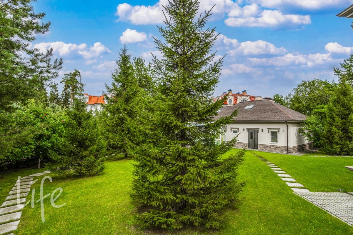 На территории участка расположены: SPA-комплекс с большим бассейном 10,5х3,7м, сауной, хамамом, винной и сигарной комнатой; открытая веранда с профессиональной печью и грилем; гараж на два машино-места с квартирой для персонала.