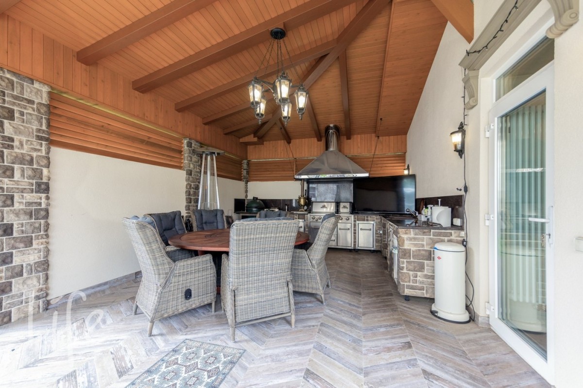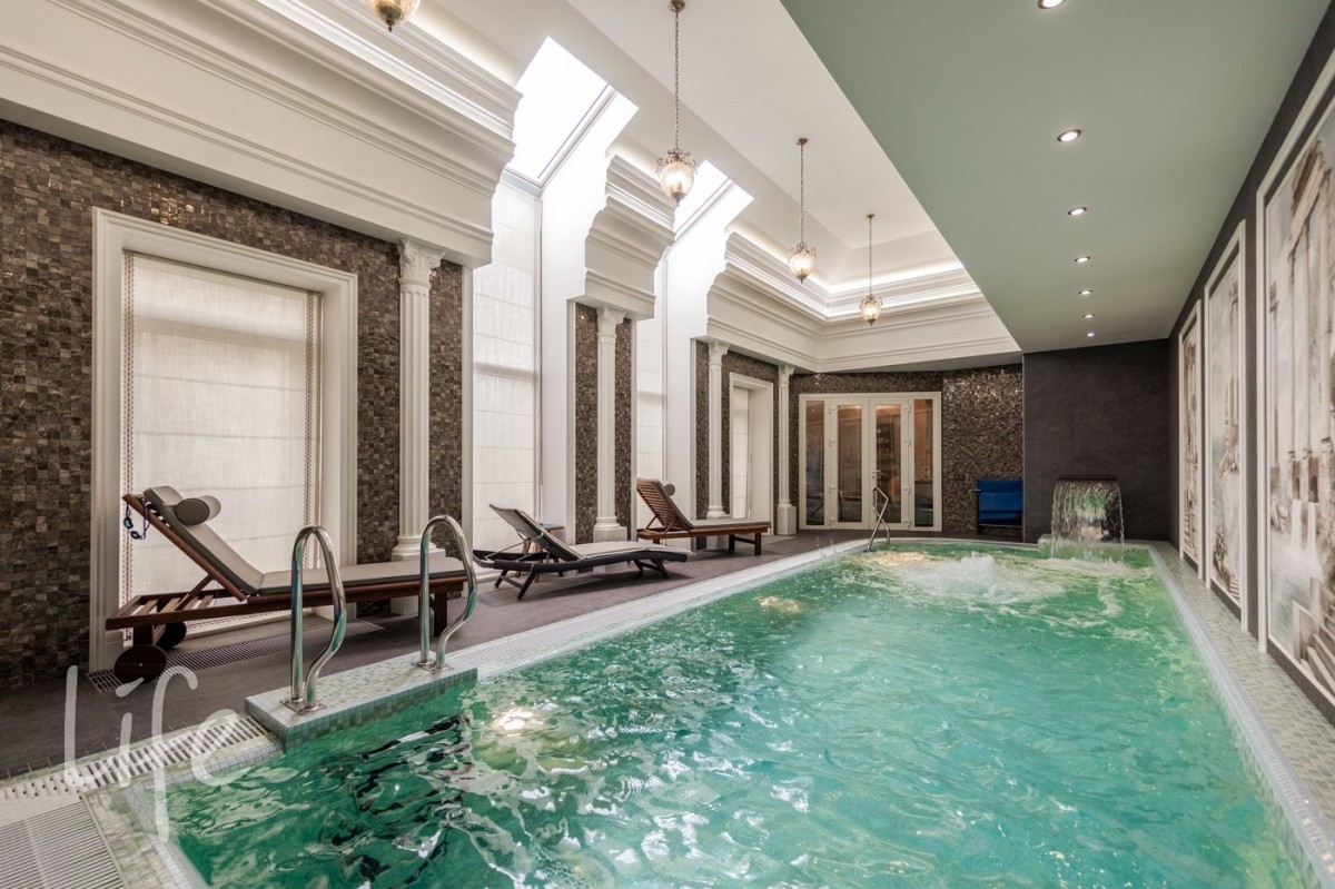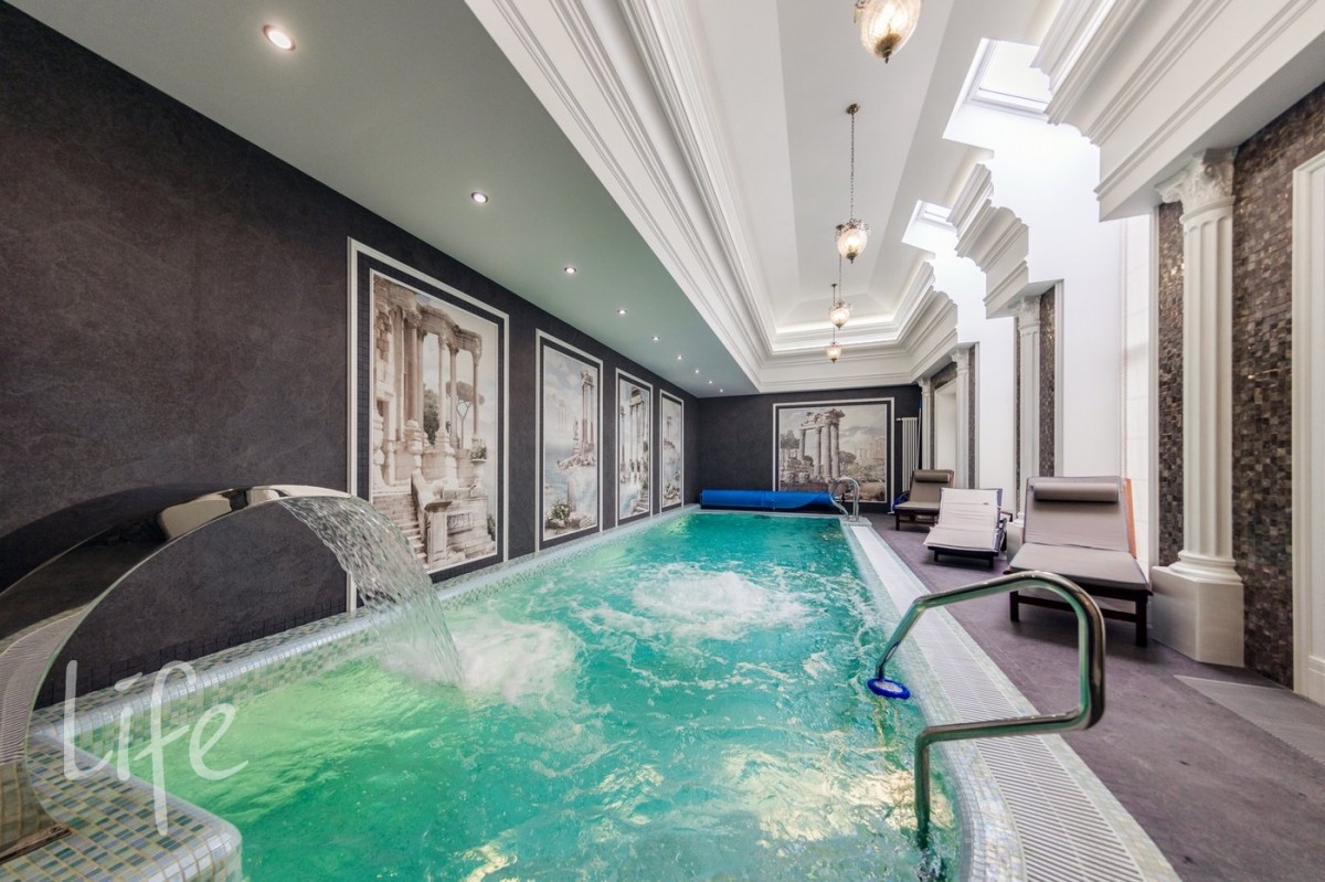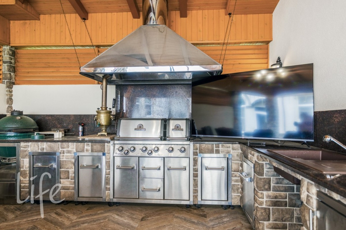 На территории участка расположены: SPA-комплекс с большим бассейном 10,5х3,7м, сауной, хамамом, винной и сигарной комнатой; открытая веранда с профессиональной печью и грилем; гараж на два машино-места с квартирой для персонала.