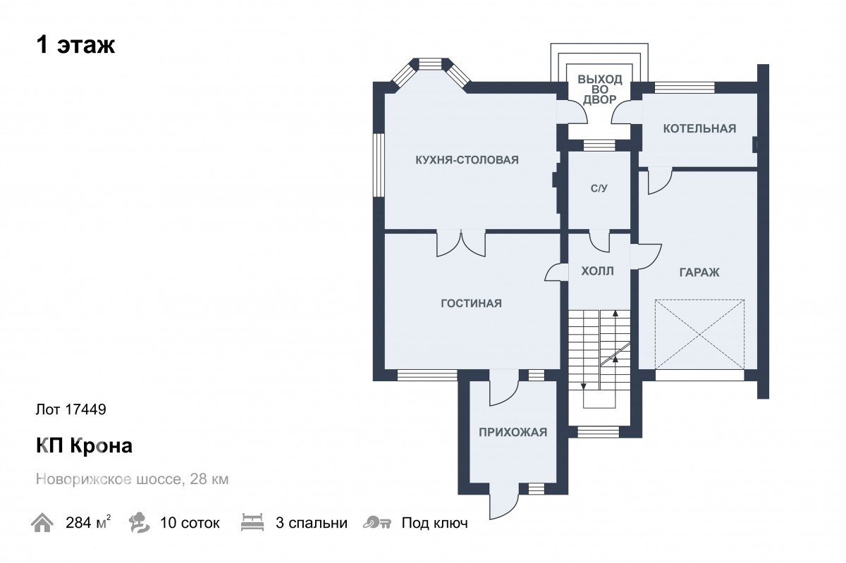 1 этаж: теплый тамбур-гардеробная, прихожая, кухня-столовая-гостиная, котельная, кладовая, с/у, гараж. Отдельный выход на участок.