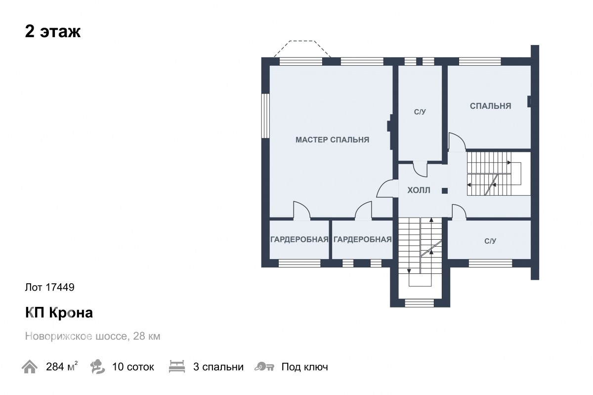2 этаж: мастер-спальня с двумя гардеробными и су (душ и ванная), спальня со своим с/у с ванной, холл