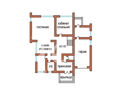 1 этаж: кухня-столовая, гостиная, гараж, с/у, холл, кабинет (спальня), прихожая, крыльцо.
