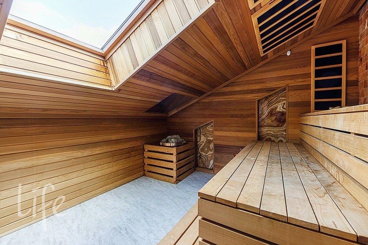 Дизайнерский интерьер. В интерьере использованы материалы премиум-класса: массив дерева, натуральный камень, мрамор и оникс. Элегантная итальянская мебель идеально дополняет эту концепцию. На кухне установлена уникальная кухня из 200-летнего карагача. По всему дому встроена невидимая аудиосистема Sonos. Уютная планировка с четырьмя спальнями и гостиной с дровяным камином идеально подходит для большой семьи. Особенно приятно, что в доме есть кедровая сауна, которая добавит комфорта в повседневную жизнь.
