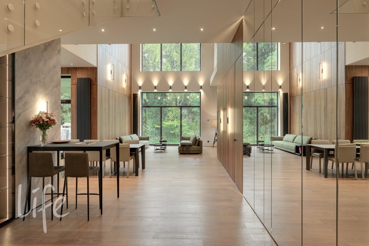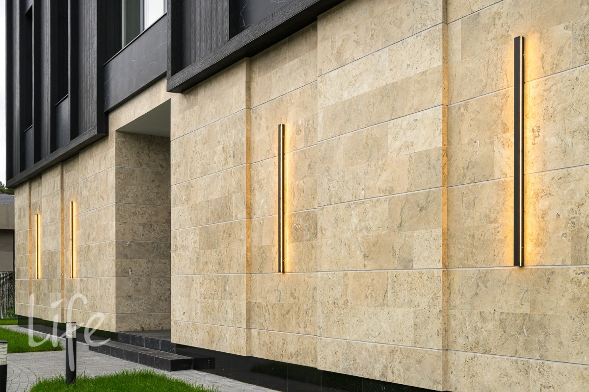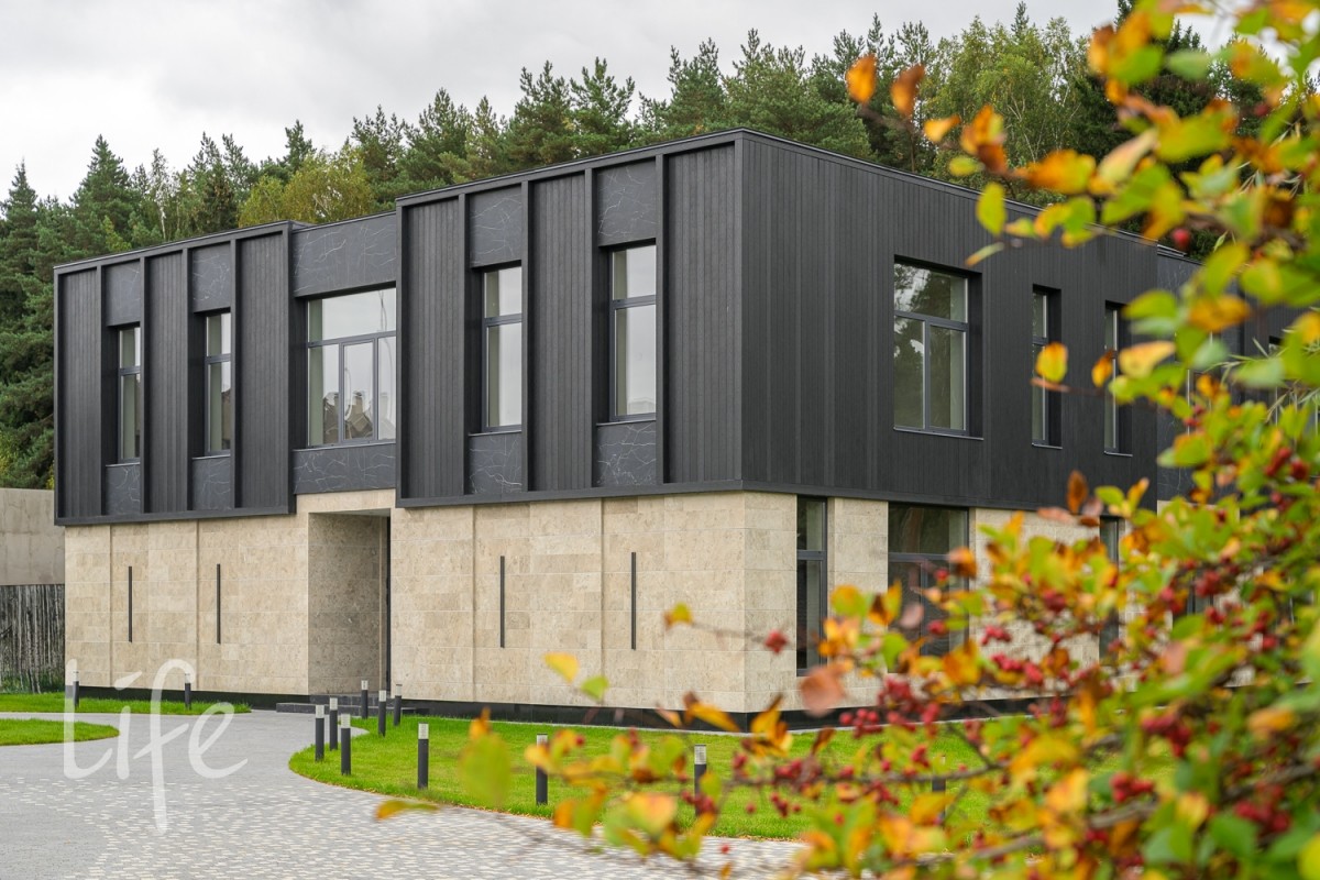 Экстерьер дома сдержанный, фасад дома облицован натуральным камнем в сочетании с деревом, выполнена архитектурная подсветка. Большие панорамные окна.