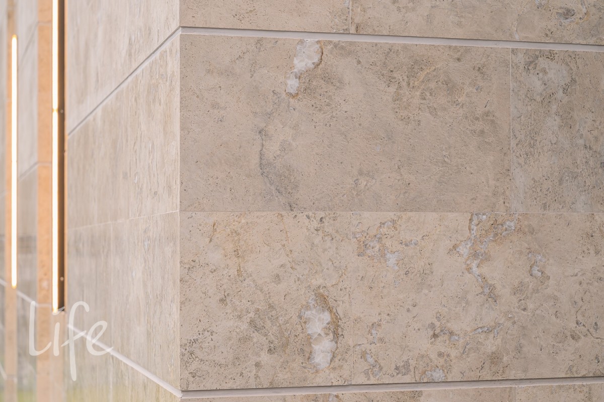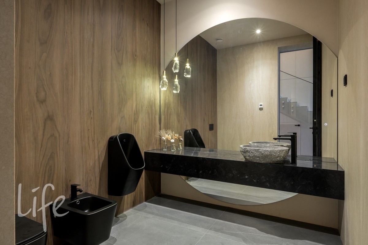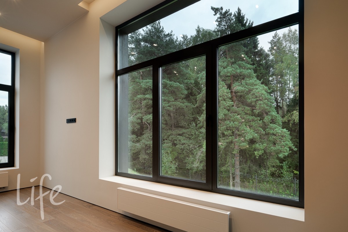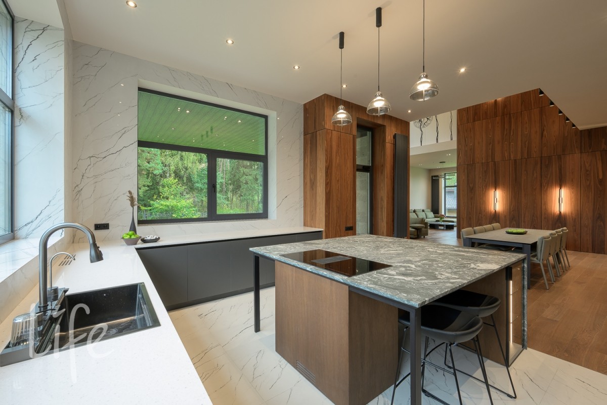 Экстерьер дома сдержанный, фасад дома облицован натуральным камнем в сочетании с деревом, выполнена архитектурная подсветка. Большие панорамные окна.