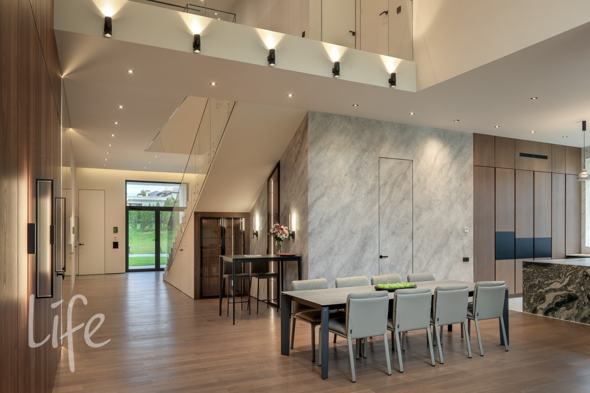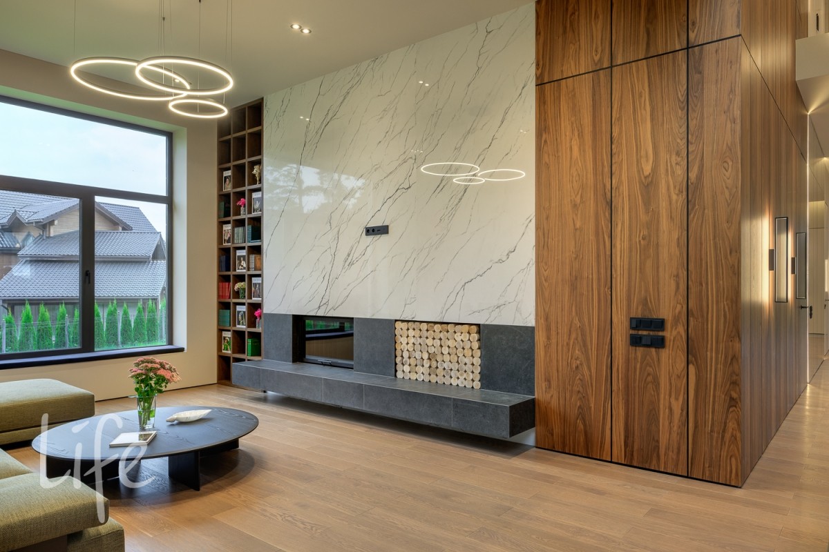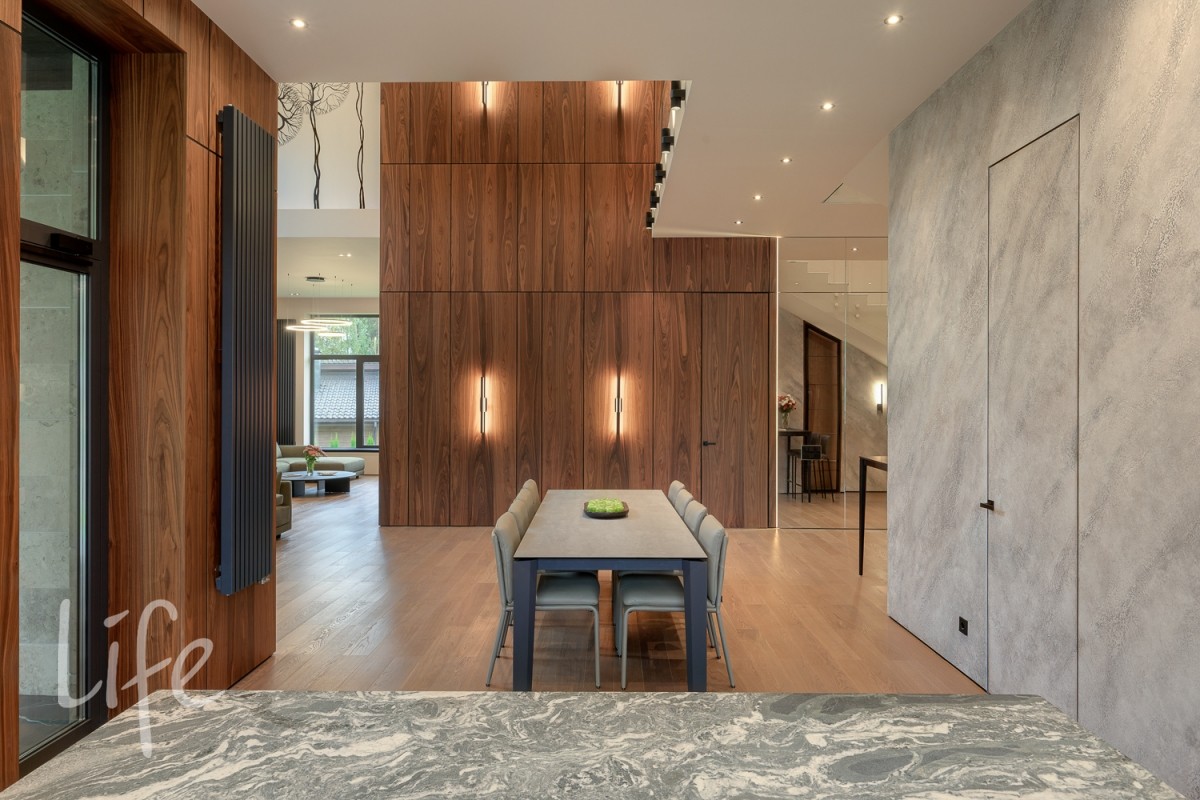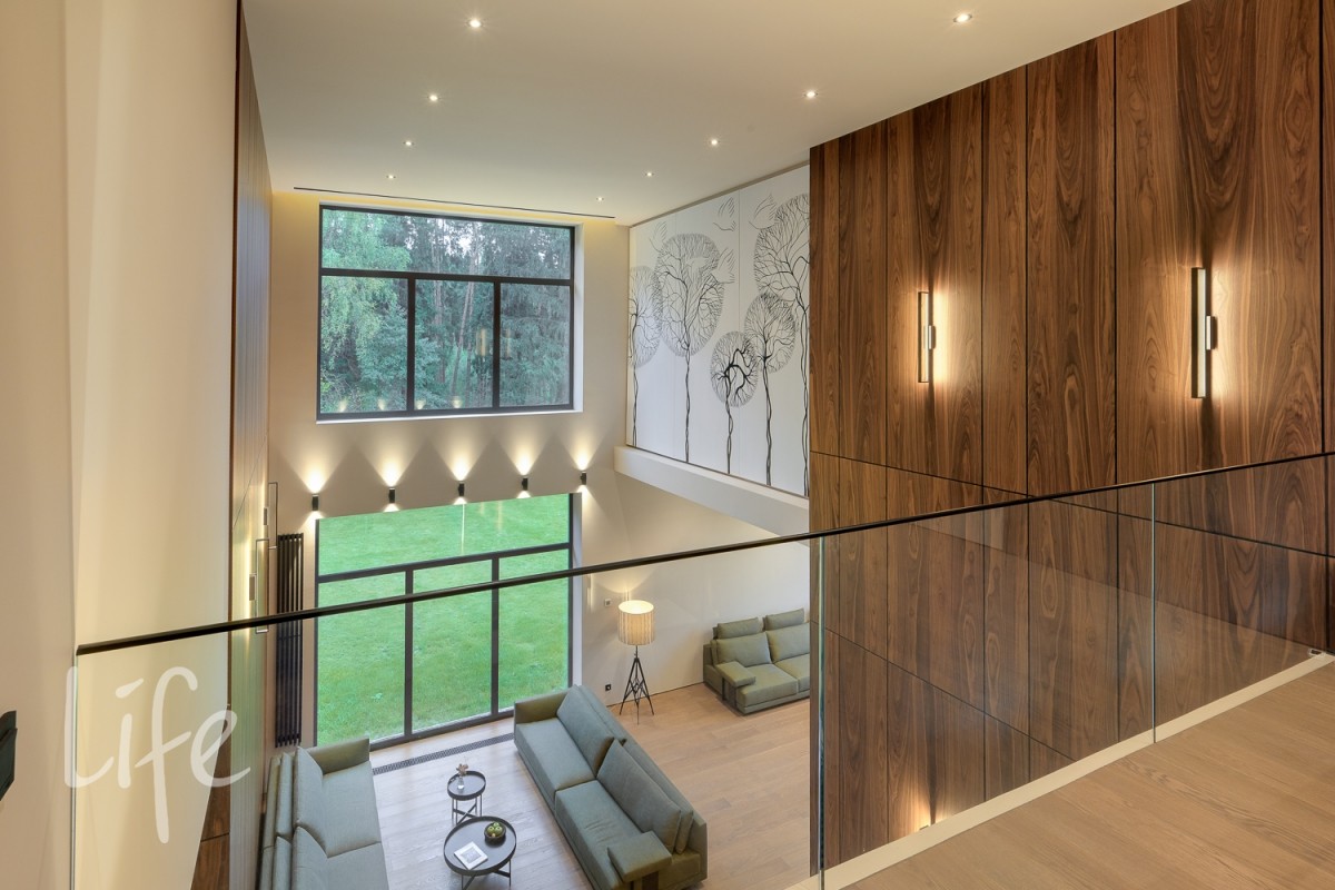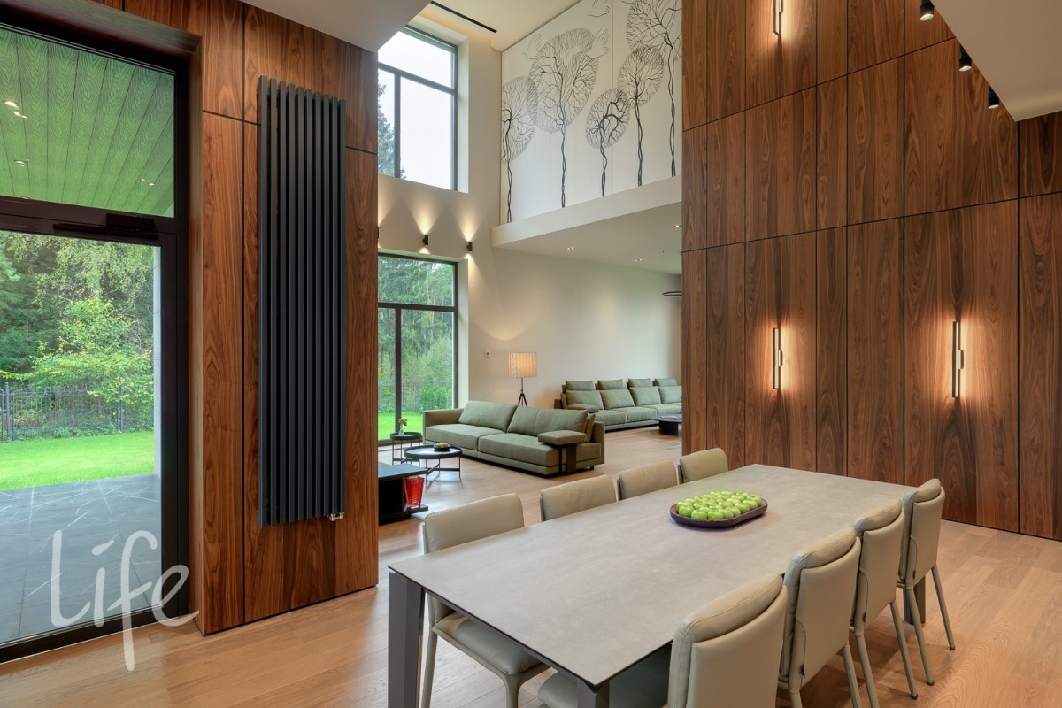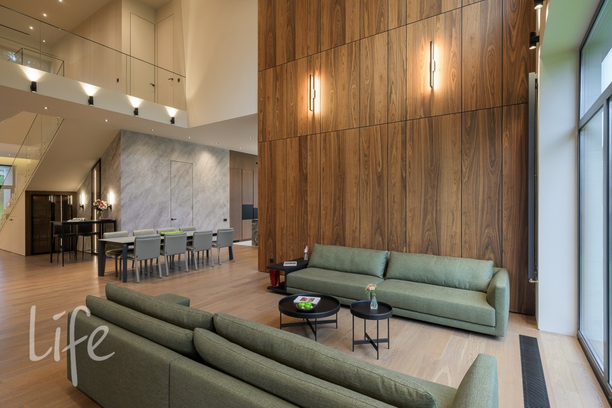 Светлый интерьер, спокойный и уютный, с деревянными панелями на стенах в качестве декора. Со вкусом подобрана мебель от итальянских брендов Poliform, Natuzzi, Calligaris, датской BoConcept и аксессуары. Гостиная со вторым светом, установлен дровяной камин.