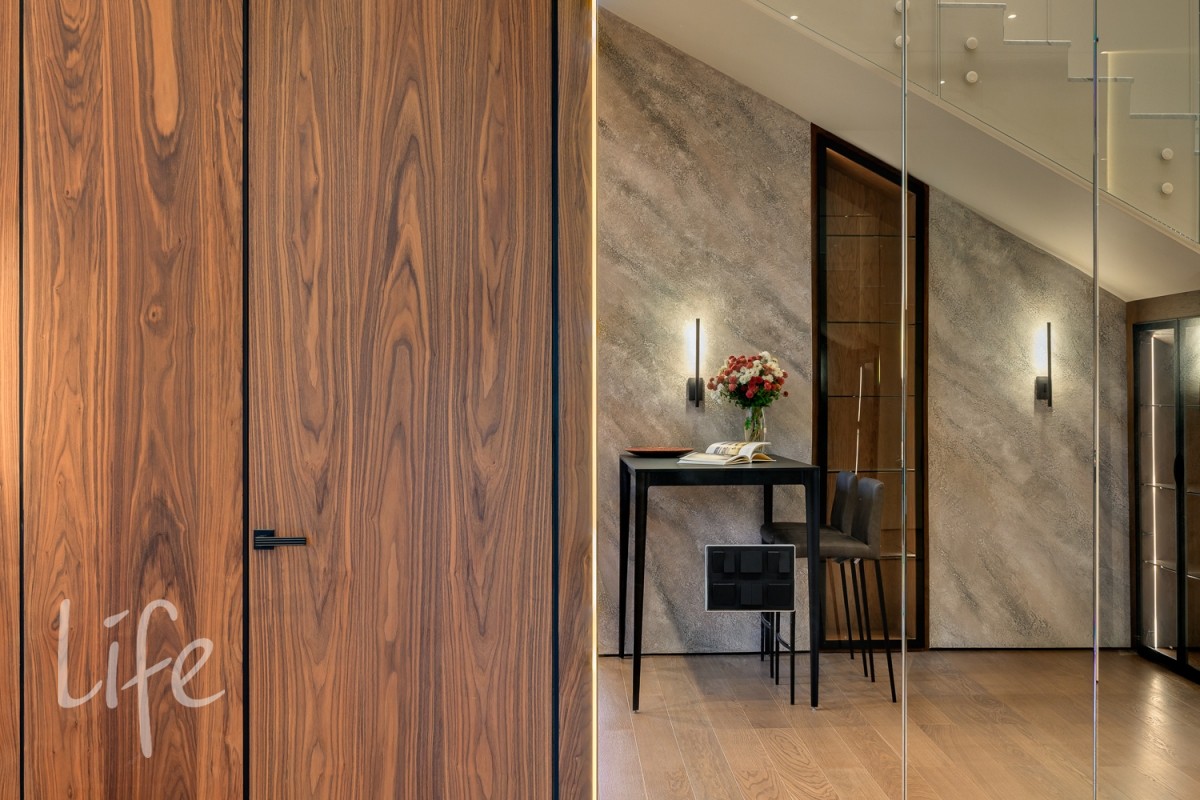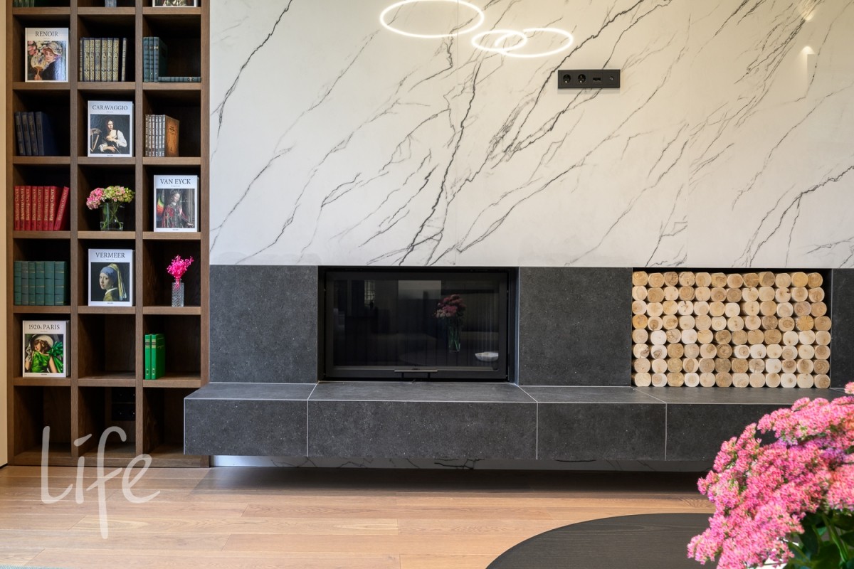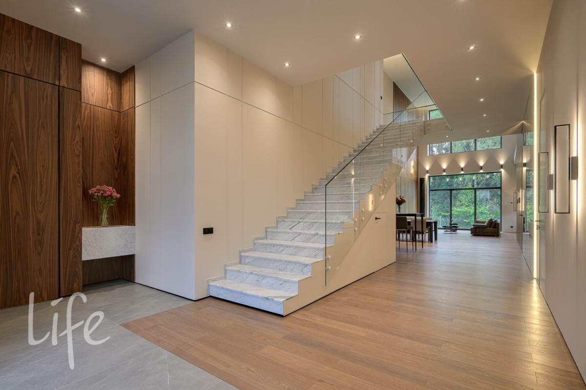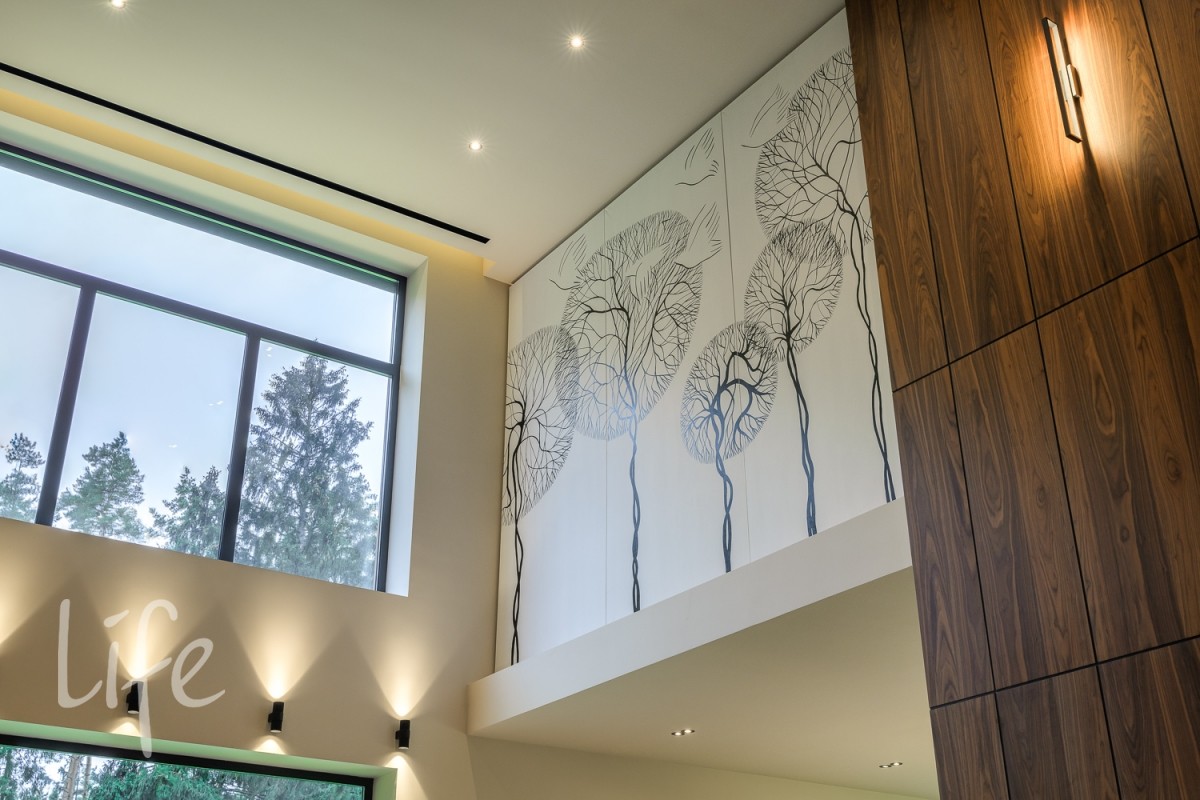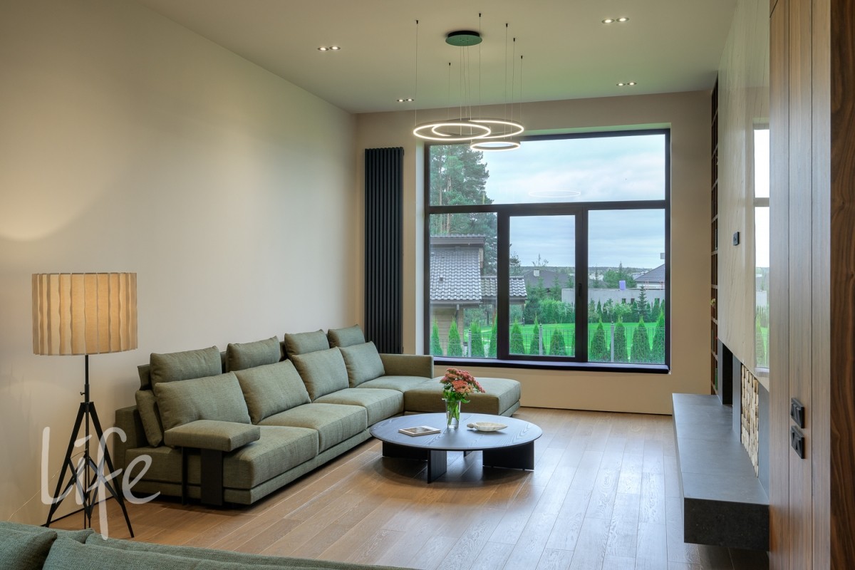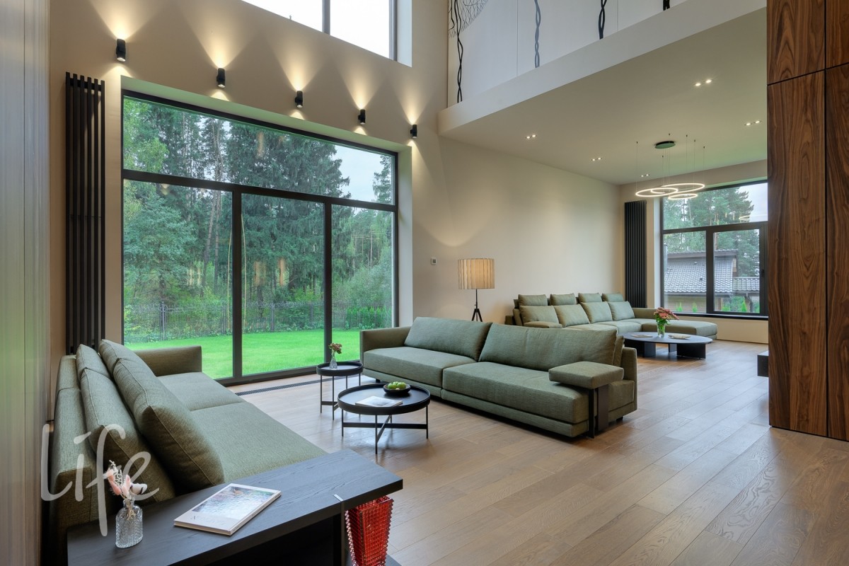 Светлый интерьер, спокойный и уютный, с деревянными панелями на стенах в качестве декора. Со вкусом подобрана мебель от итальянских брендов Poliform, Natuzzi, Calligaris, датской BoConcept и аксессуары. Гостиная со вторым светом, установлен дровяной камин.