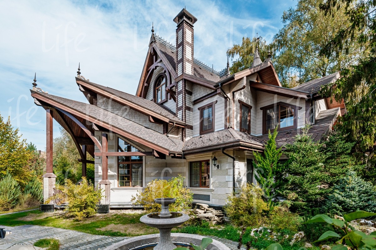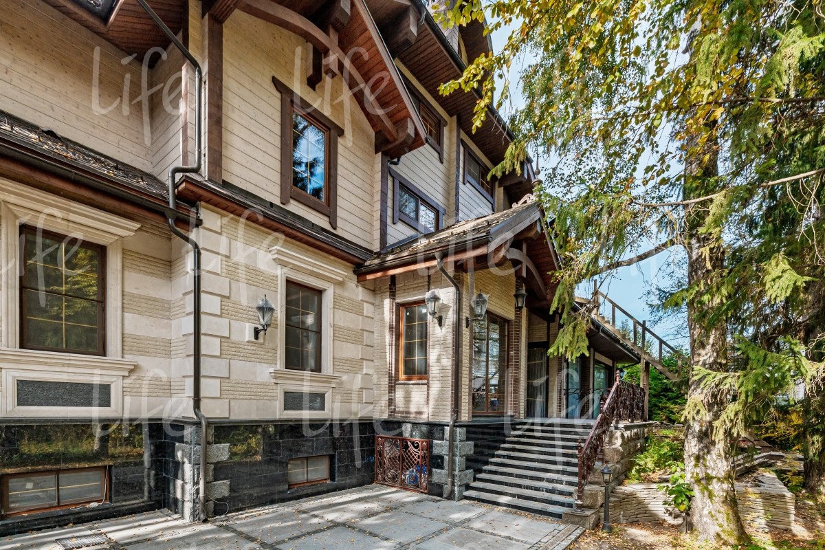Фасад дома полностью отделан, облицовка стен из таких материалов, как лабрадорит, песчаник, лиственница, дранка. Оригинальный, сделанный вручную, медный кровельный декор украшает коньковую часть крыши и печной трубы.