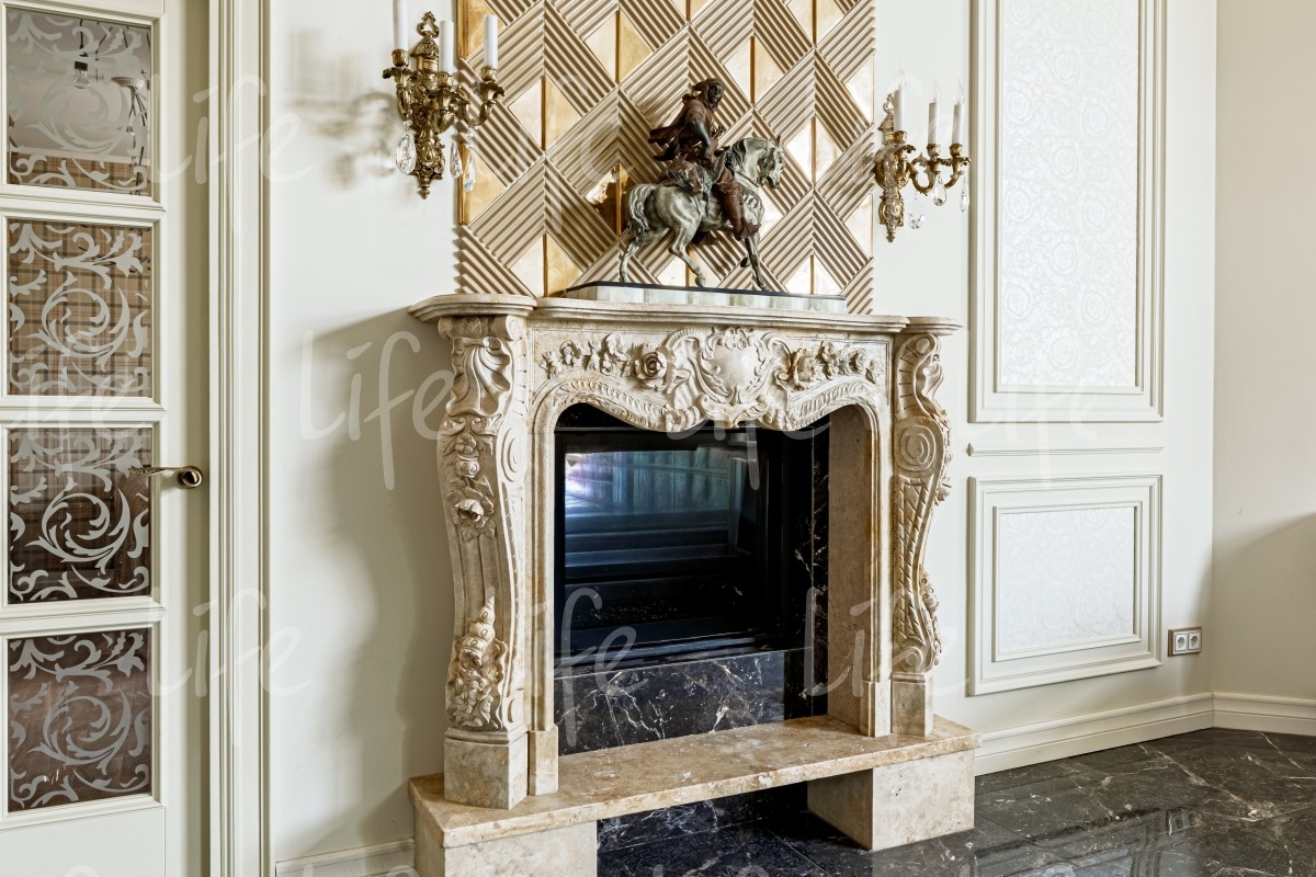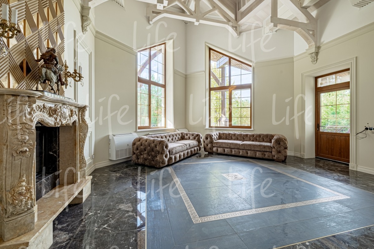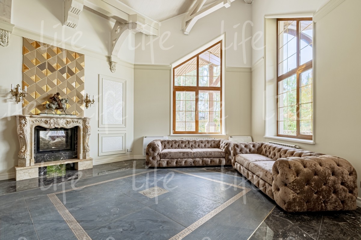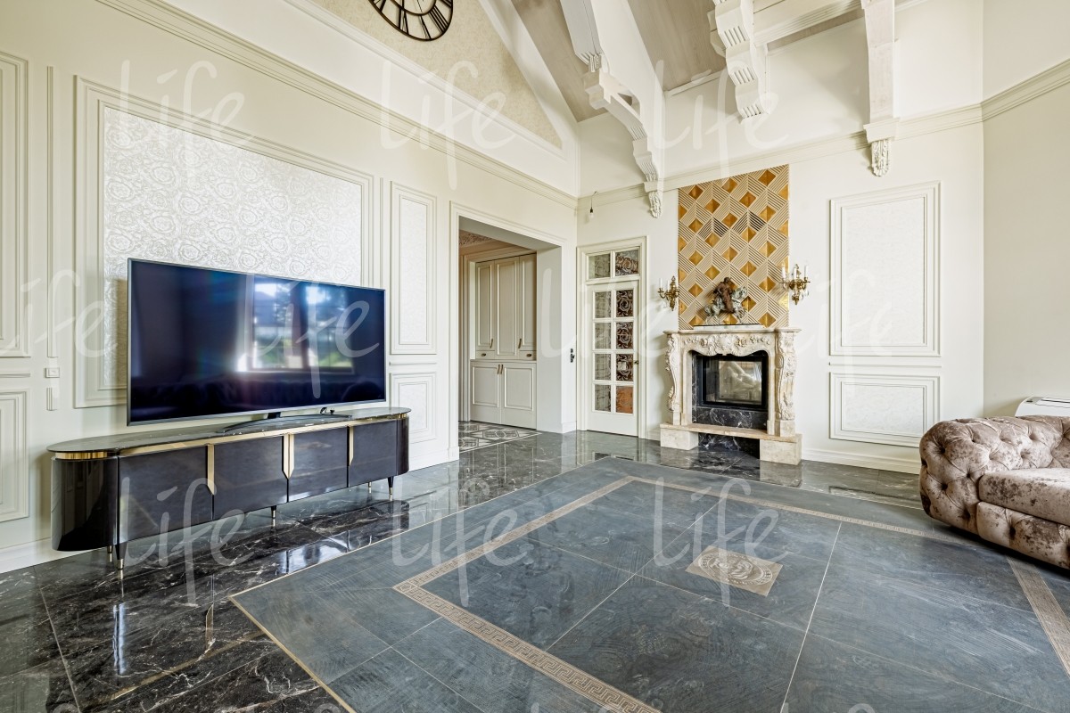 В отделочных работах использованы дорогостоящие материалы премиум-класса от итальянских производителей. Гостиной особый шарм придает двухсторонний дровяной камин. А со стороны кабинета, камин эффектно оформлен изразцами изумрудного цвета.