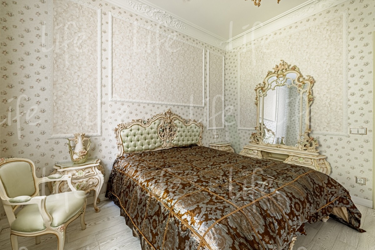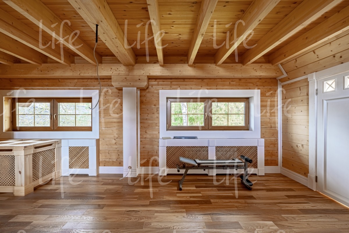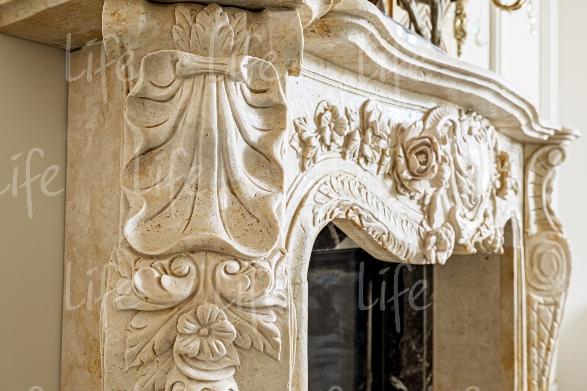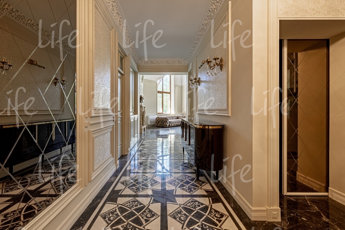 В отделочных работах использованы дорогостоящие материалы премиум-класса от итальянских производителей. Гостиной особый шарм придает двухсторонний дровяной камин. А со стороны кабинета, камин эффектно оформлен изразцами изумрудного цвета.