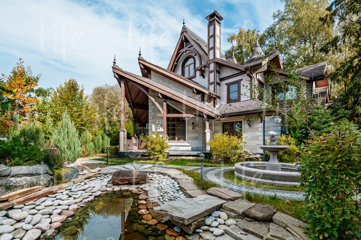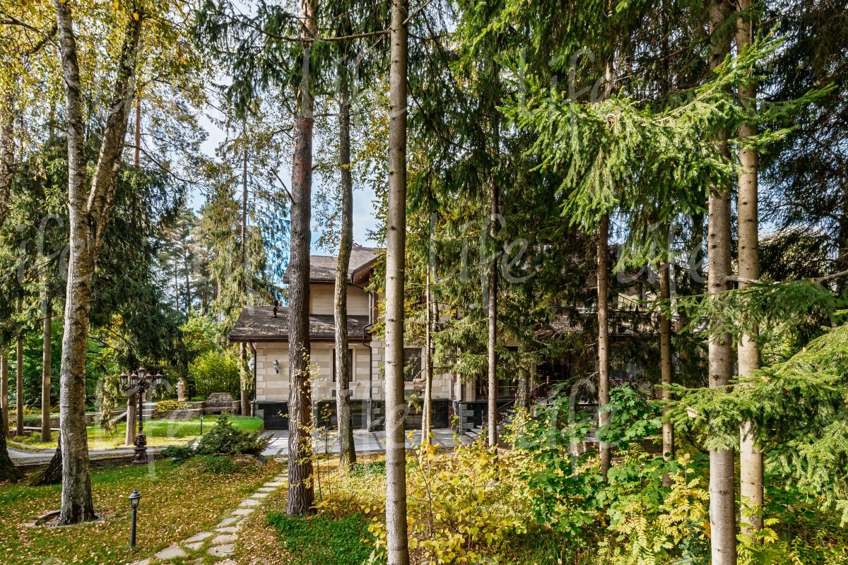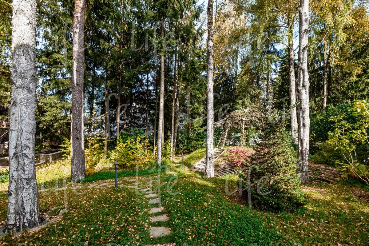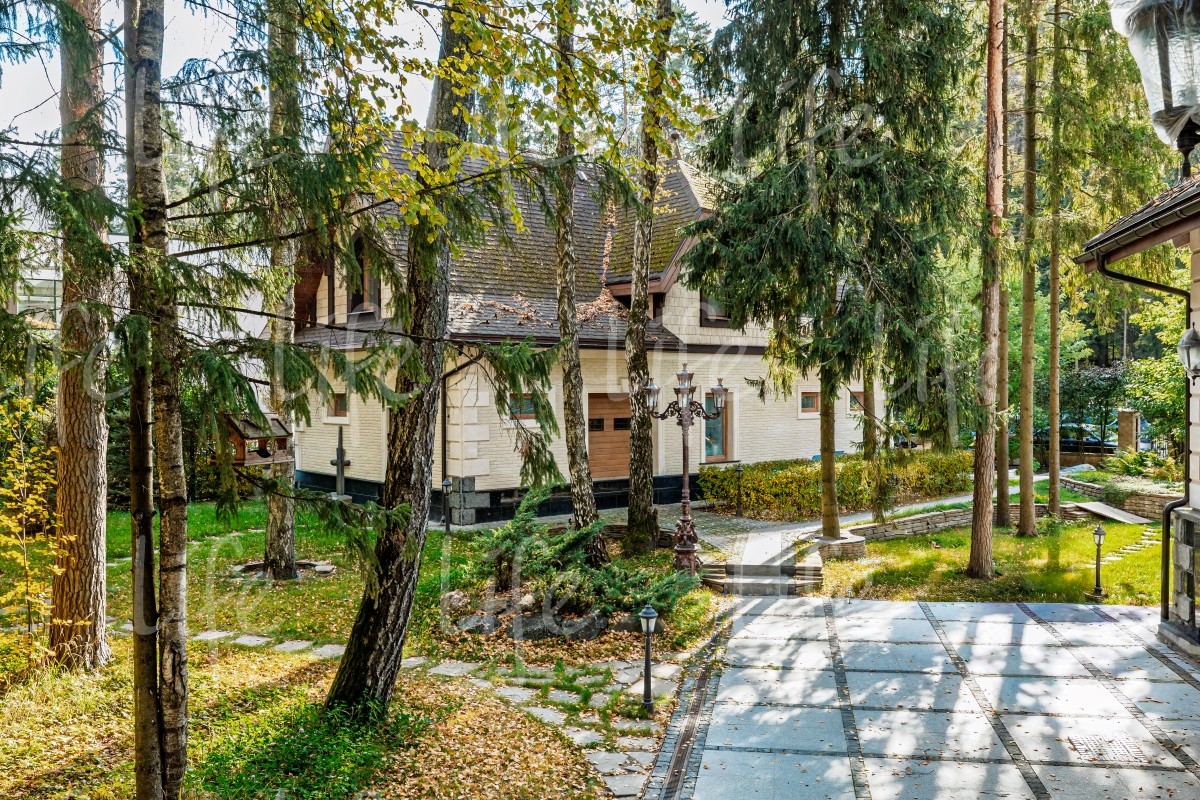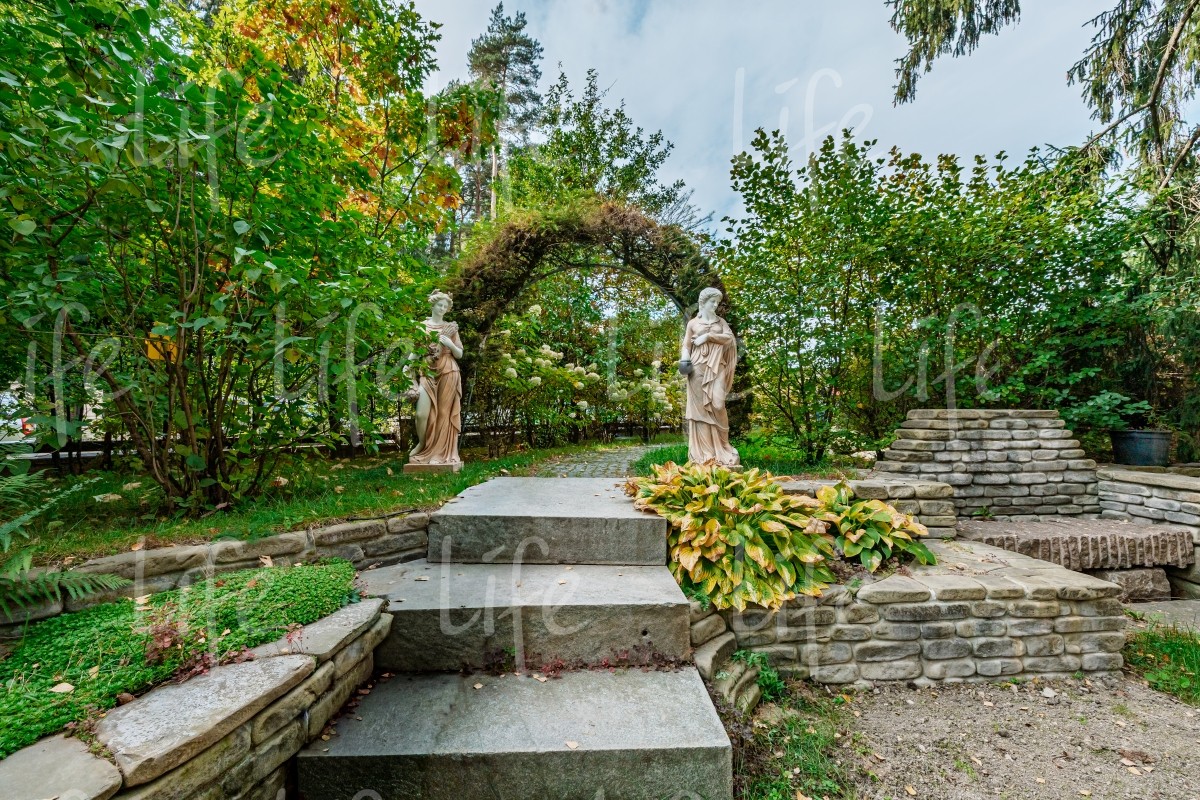 Участок с лесными деревьями, ландшафтный дизайн выполнен под стать дому, с французскими «нотками». Садовые дорожки из натурального гранита, фонтан с писающим мальчиком, небольшим прудиком, статуи женщин, декоративные арки из живых растений придают участку изысканность и элегантность. На территории расположен отдельно стоящий гараж на четыре автомобиля, с квартирой для персонала.