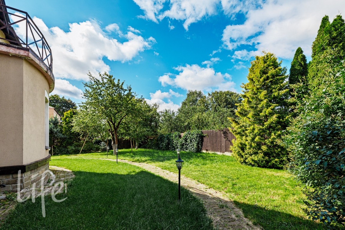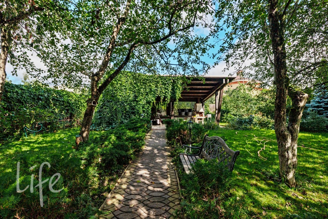 На участке выполнен ландшафтный дизайн, растут хвойные и плодовые деревья, цветы, есть фонтан, обустроена зона барбекю.