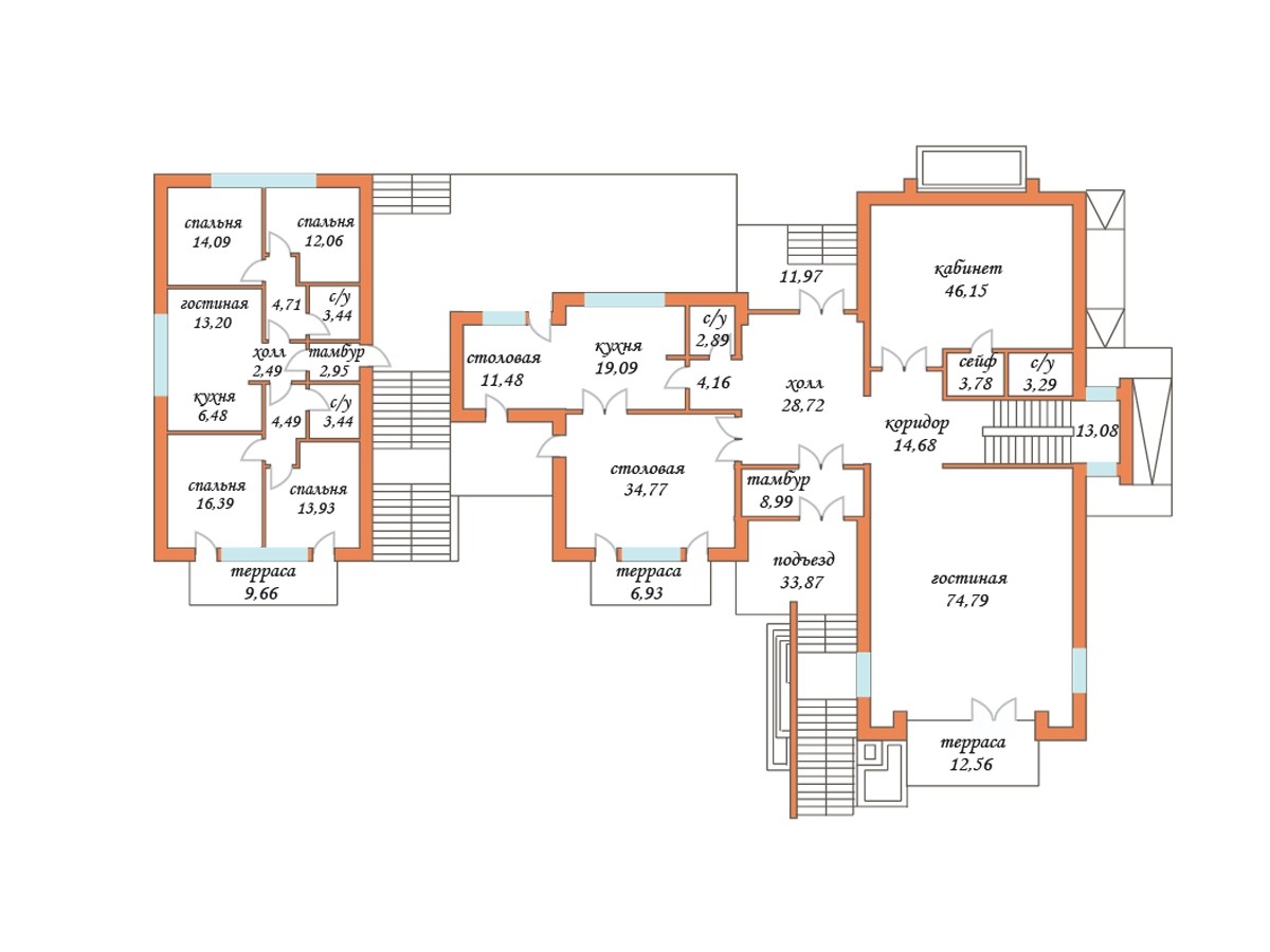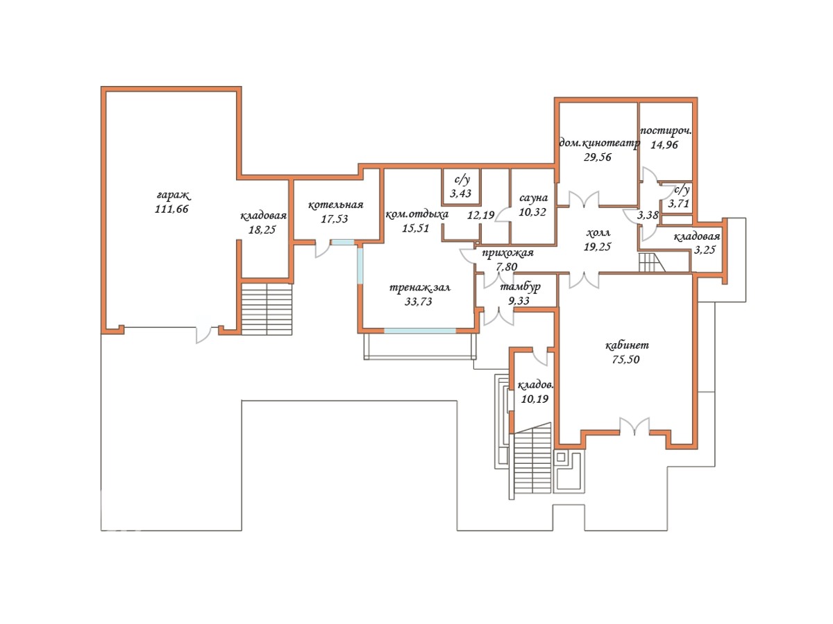 Цоколь: цокольный этаж: прихожая для входа с улицы, 2 спальни для персонала с кухней и санузлом, большая комната для хранения,помещение для инженерных систем, SPA зона с сауной и комнатой отдыха, гостевая спальня с собственным гардеробом и санузлом,отдельно расположен вход в котельную.