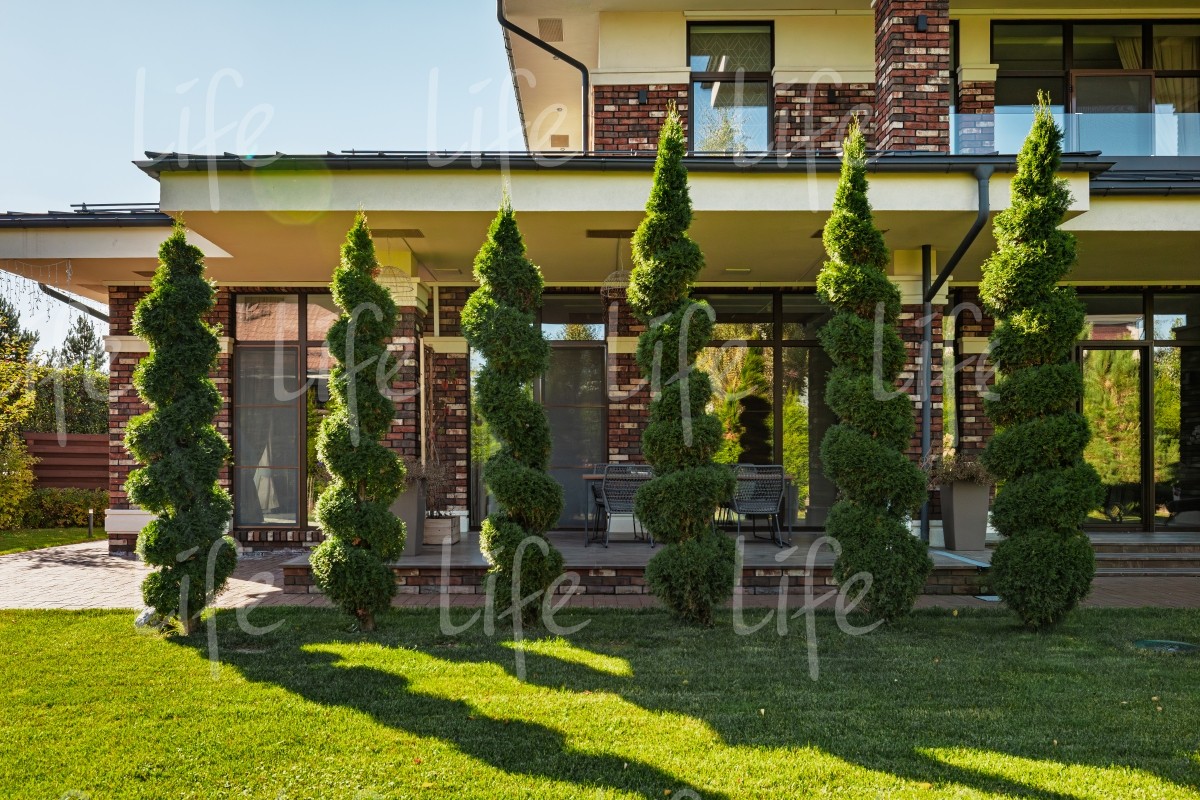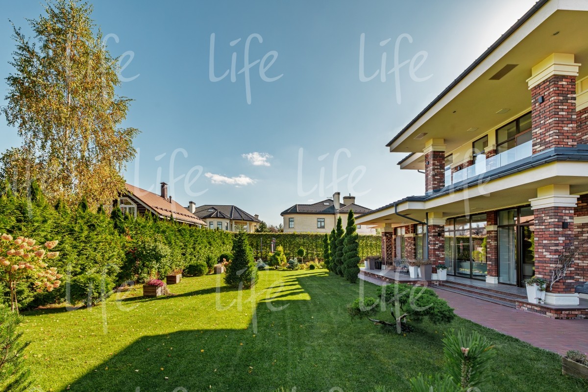 Участок правильной прямоугольной формы, выполнен ландшафтный дизайн. По периметру участка, вдоль забора, посажены туи, создающие приватное пространство. Газон, кустарники, хвойные и плодовые деревья. Автоматический полив. На территории расположена спортивная площадка, зона барбекю, оборудованная садовой мебелью.