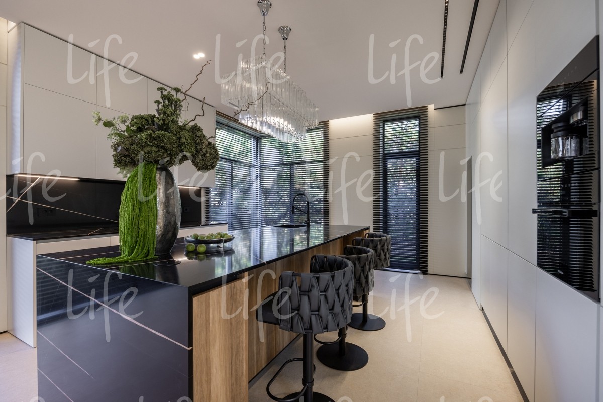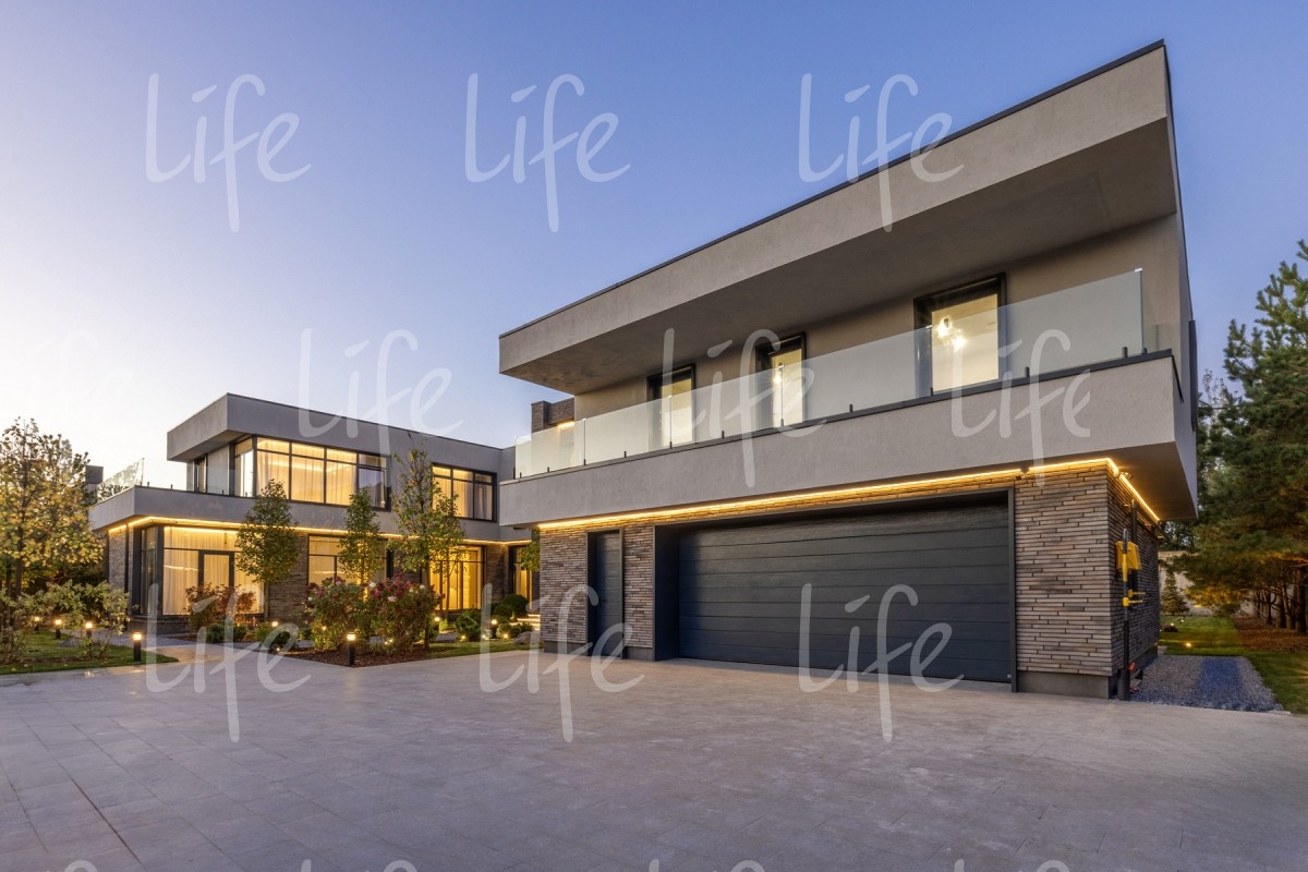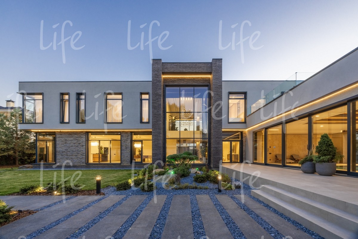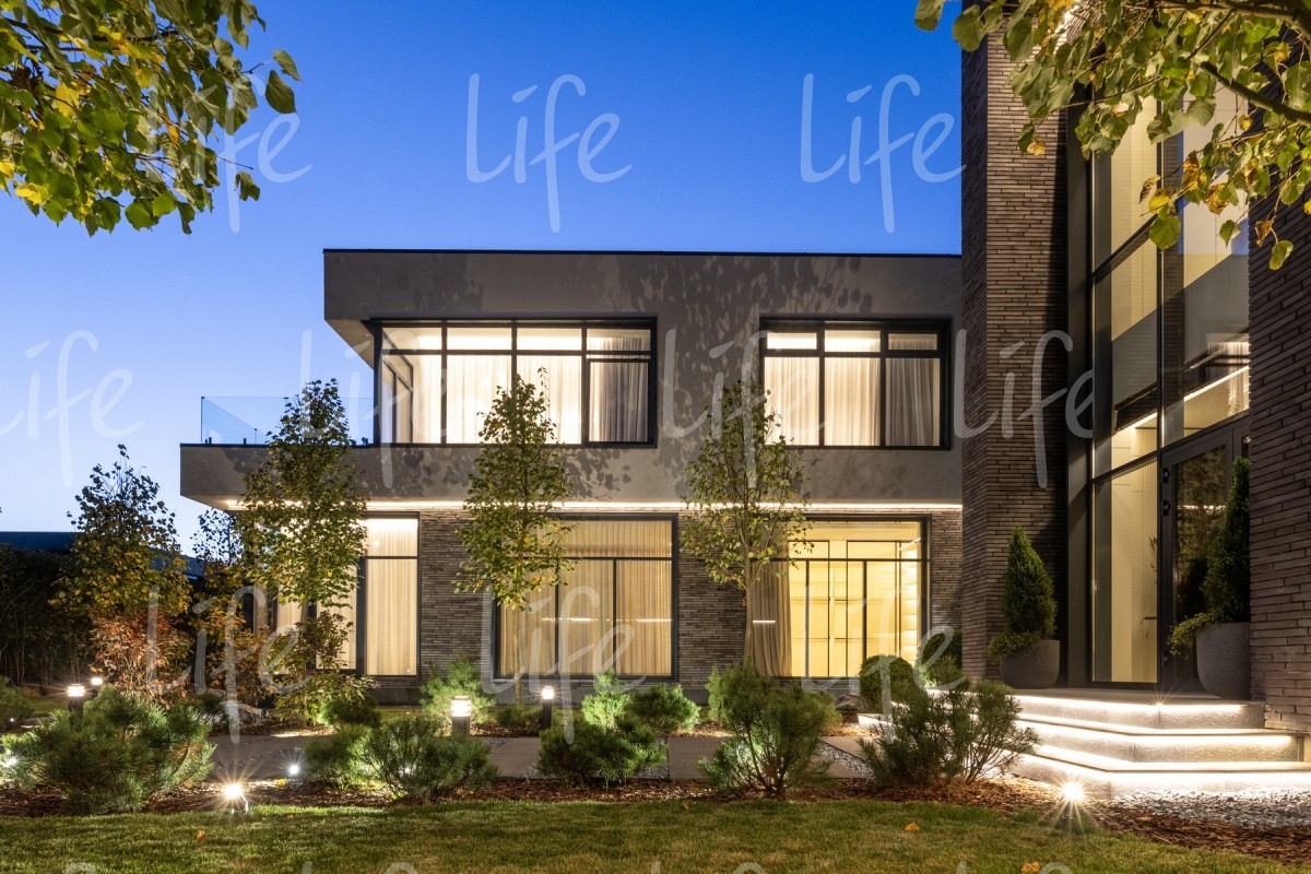 Элитный коттеджный поселок «Ренессанс Парк». Новый дом в стиле хай-тек, полностью под ключ, меблирован и оборудован всей необходимой бытовой техникой. Элегантный фасад выполнен по энергоэффективной технологии, облицован натуральным камнем, термообработанным деревом и высококачественной штукатуркой. Архитектурная подсветка в ночное время. Характерной особенностью дома являются панорамные окна, что наполняет дом светом в любую погоду.
