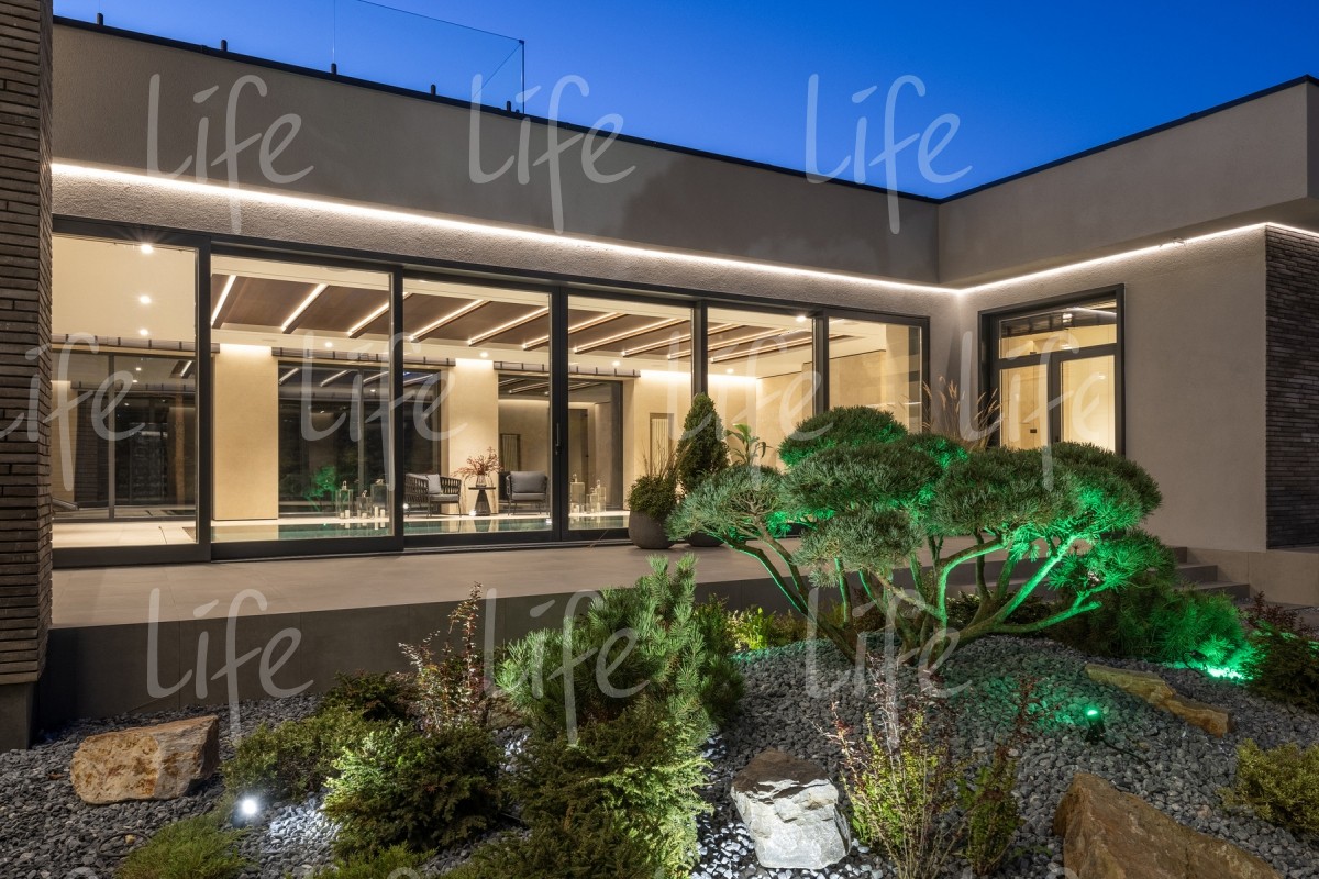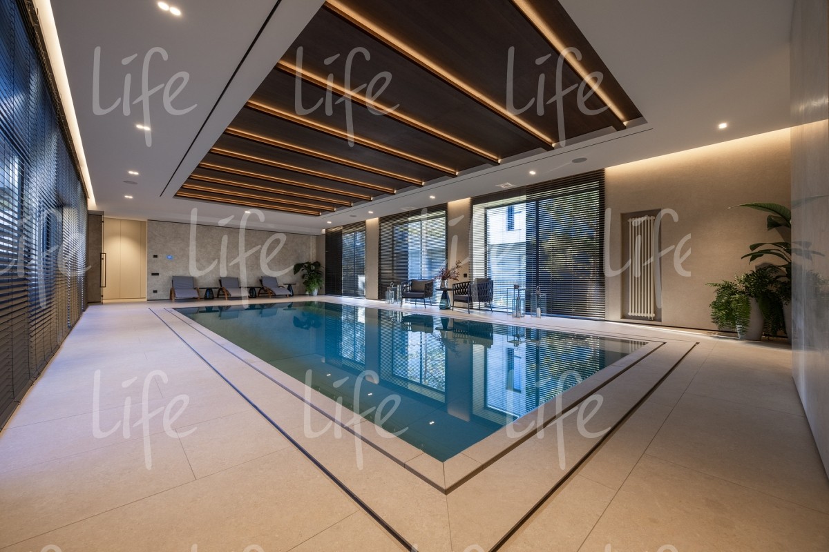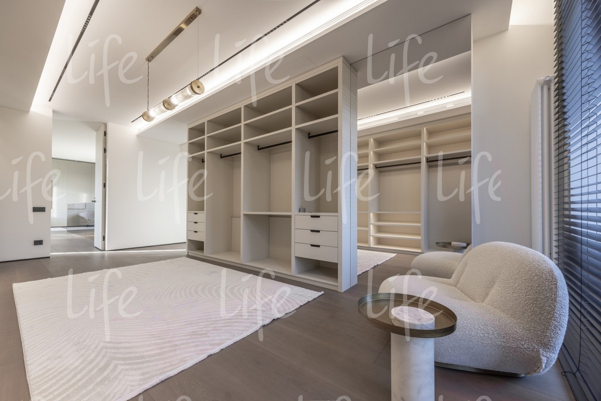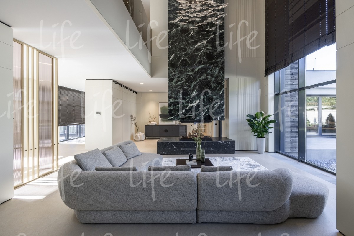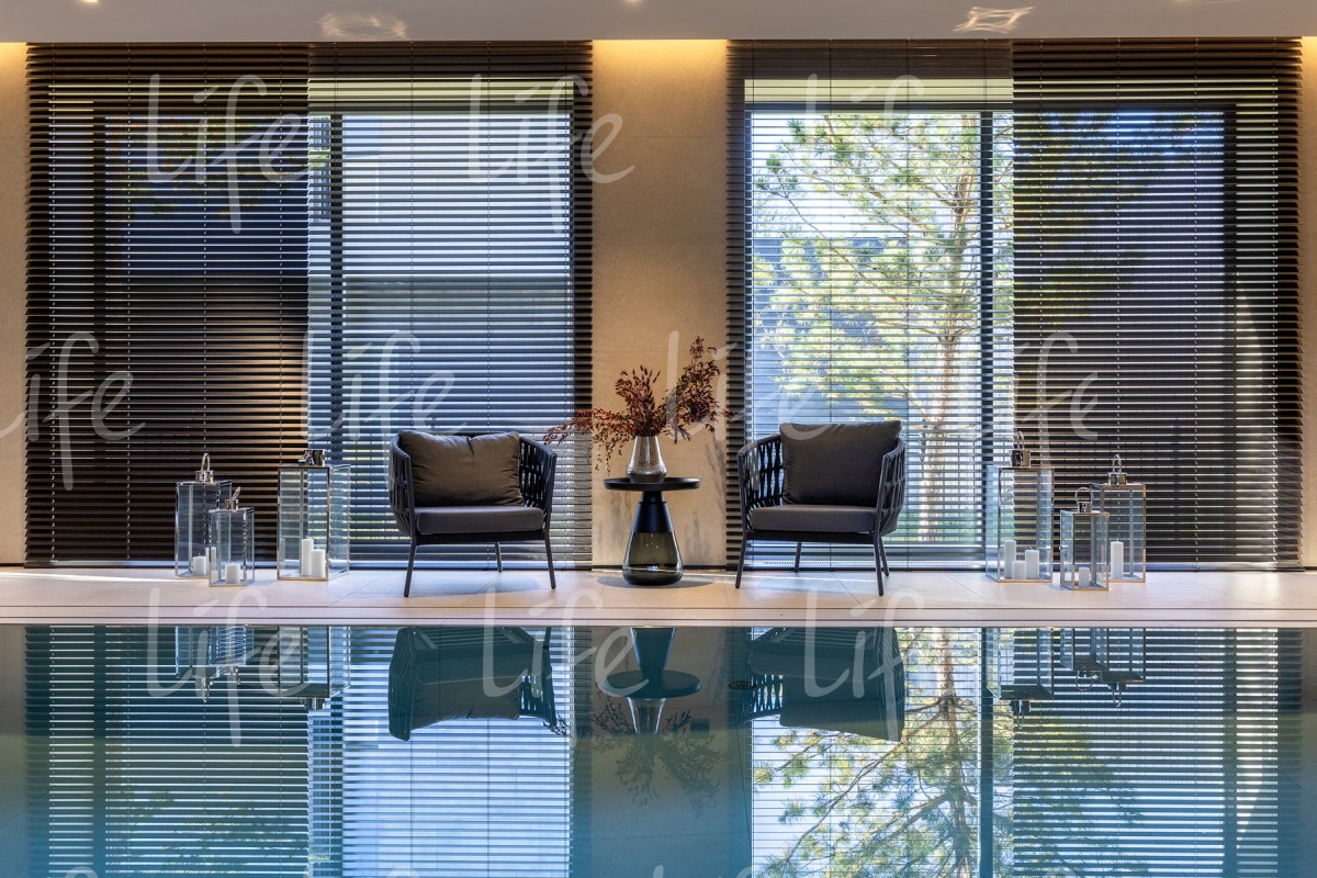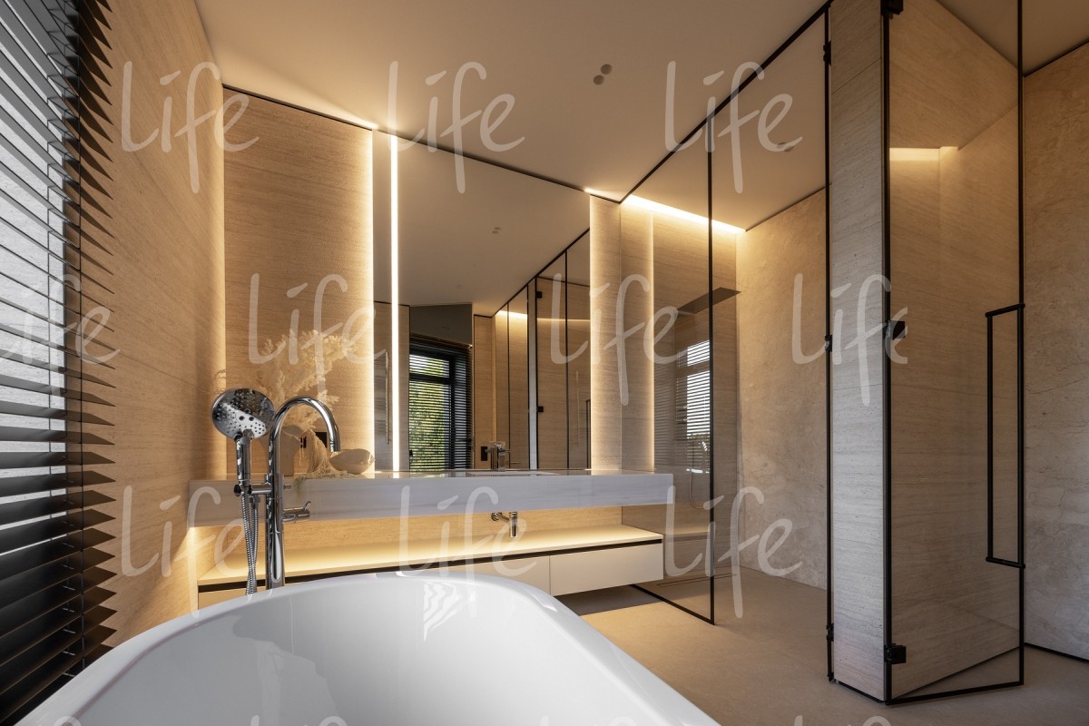 Удобная планировка, пять спален, гостиная со вторым светом, СПА-зона с бассейном обеспечивают комфортное проживание. Есть блок для персонала с двумя спальнями.