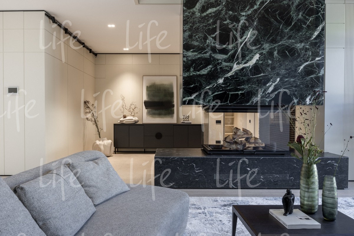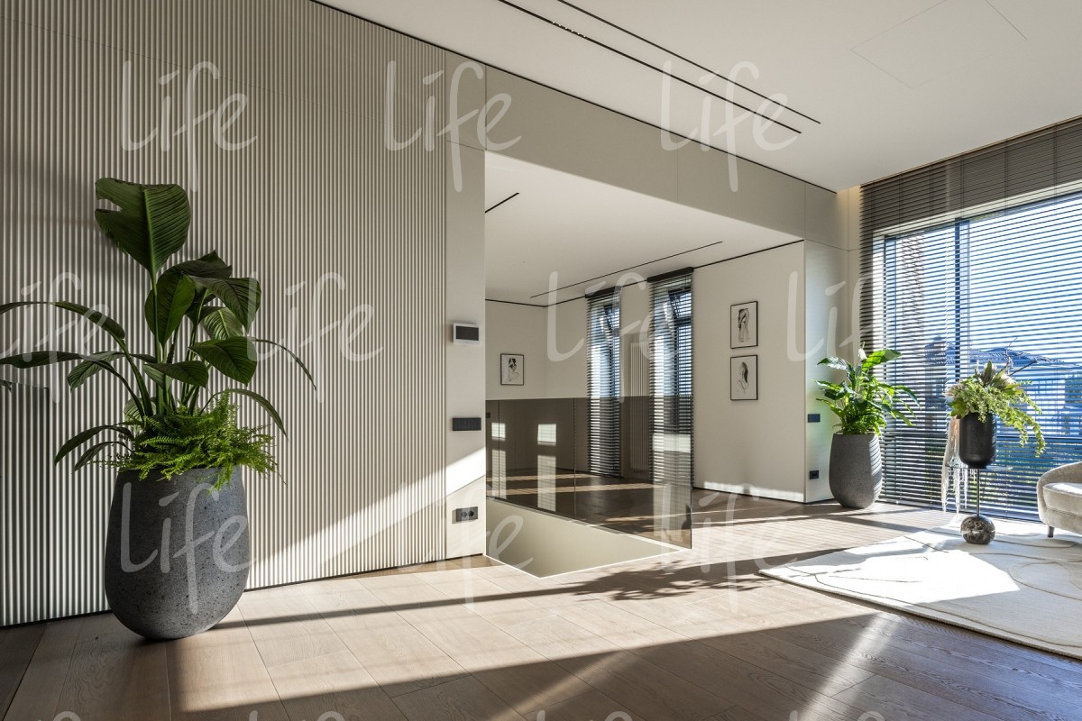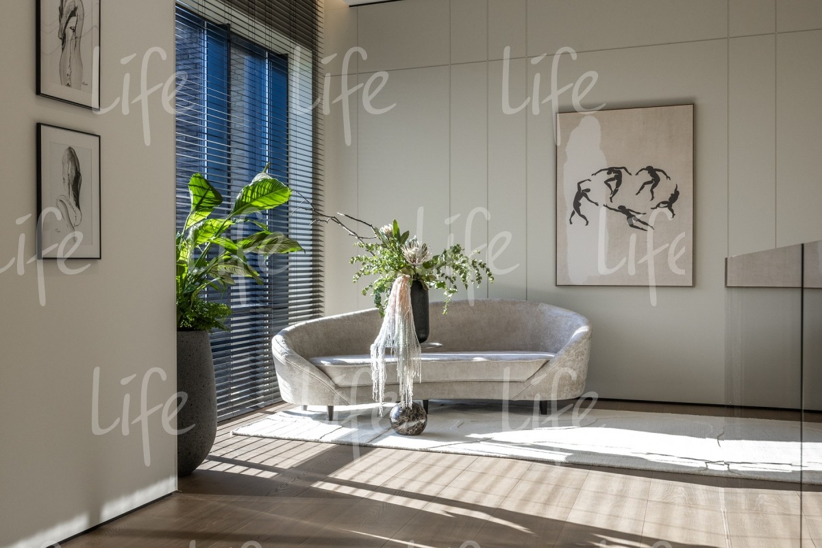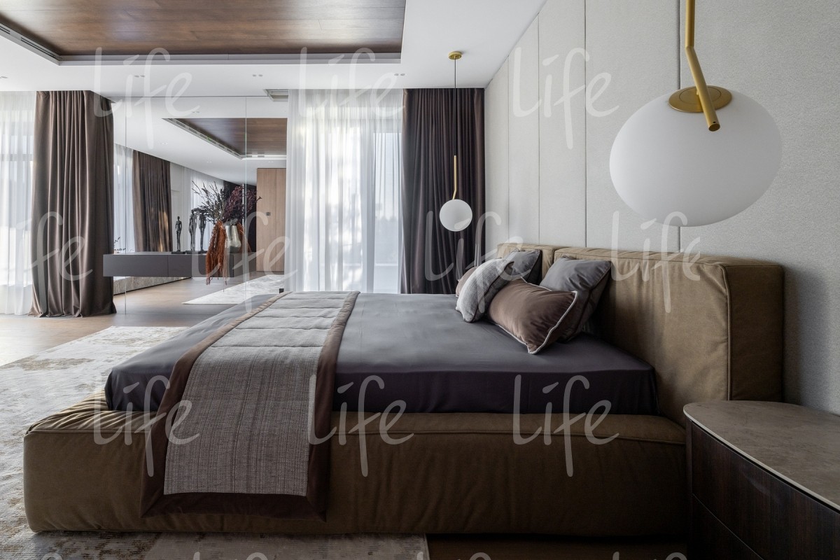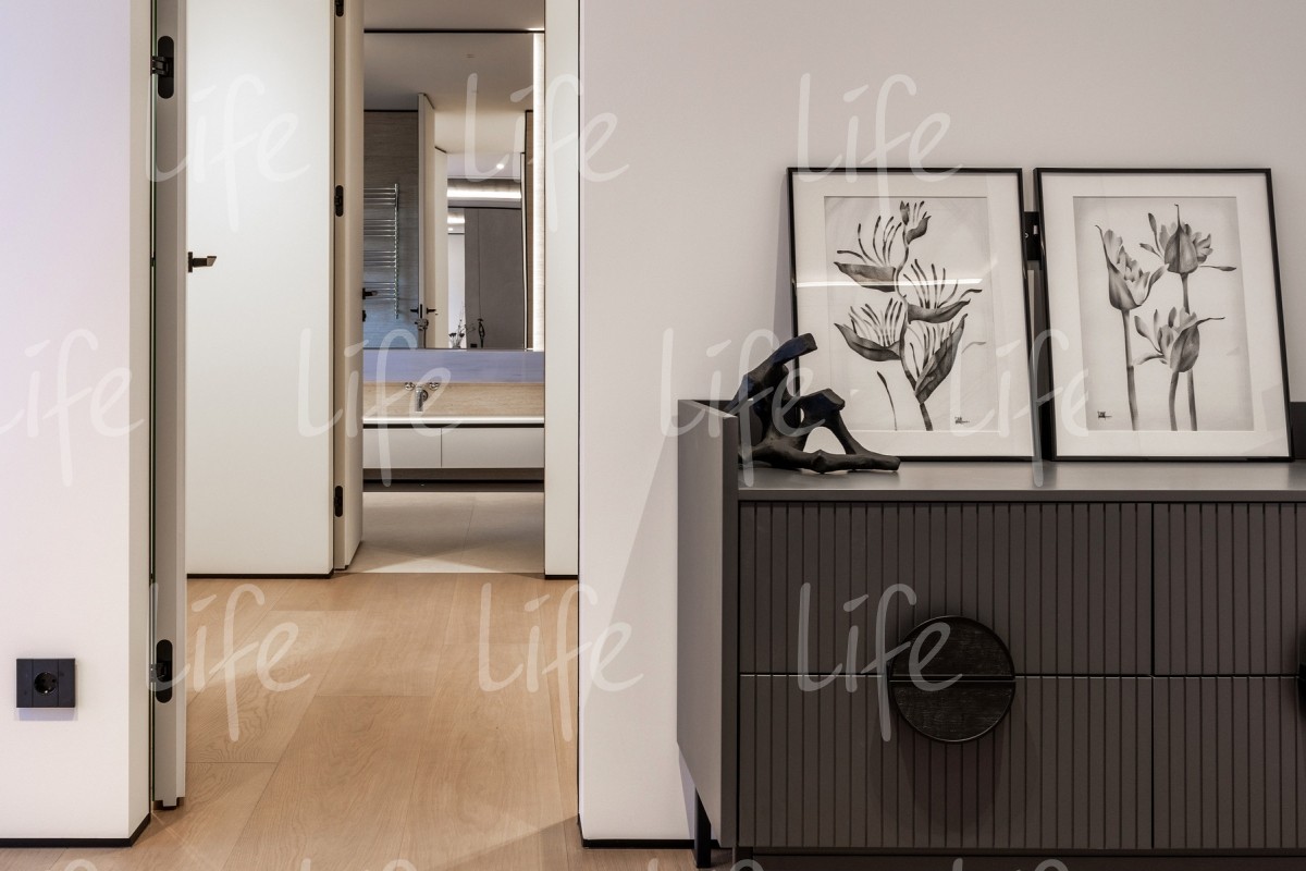 Интерьер выполнен в современном стиле, в мягких светлых тонах, использованы передовые световые решения. Со вкусом подобрана оригинальная, красивая мебель и аксессуары. Открытый биокамин украшает гостиную. Мягкие панели, элементы из дерева в спальнях добавляют уюта.