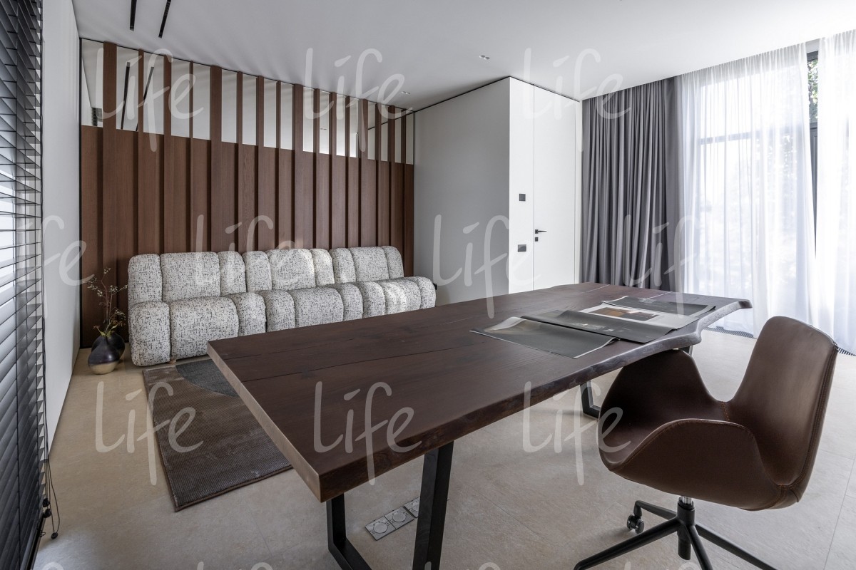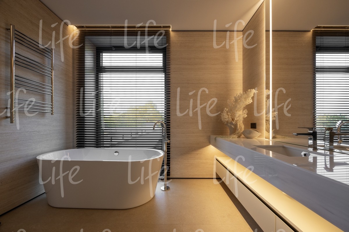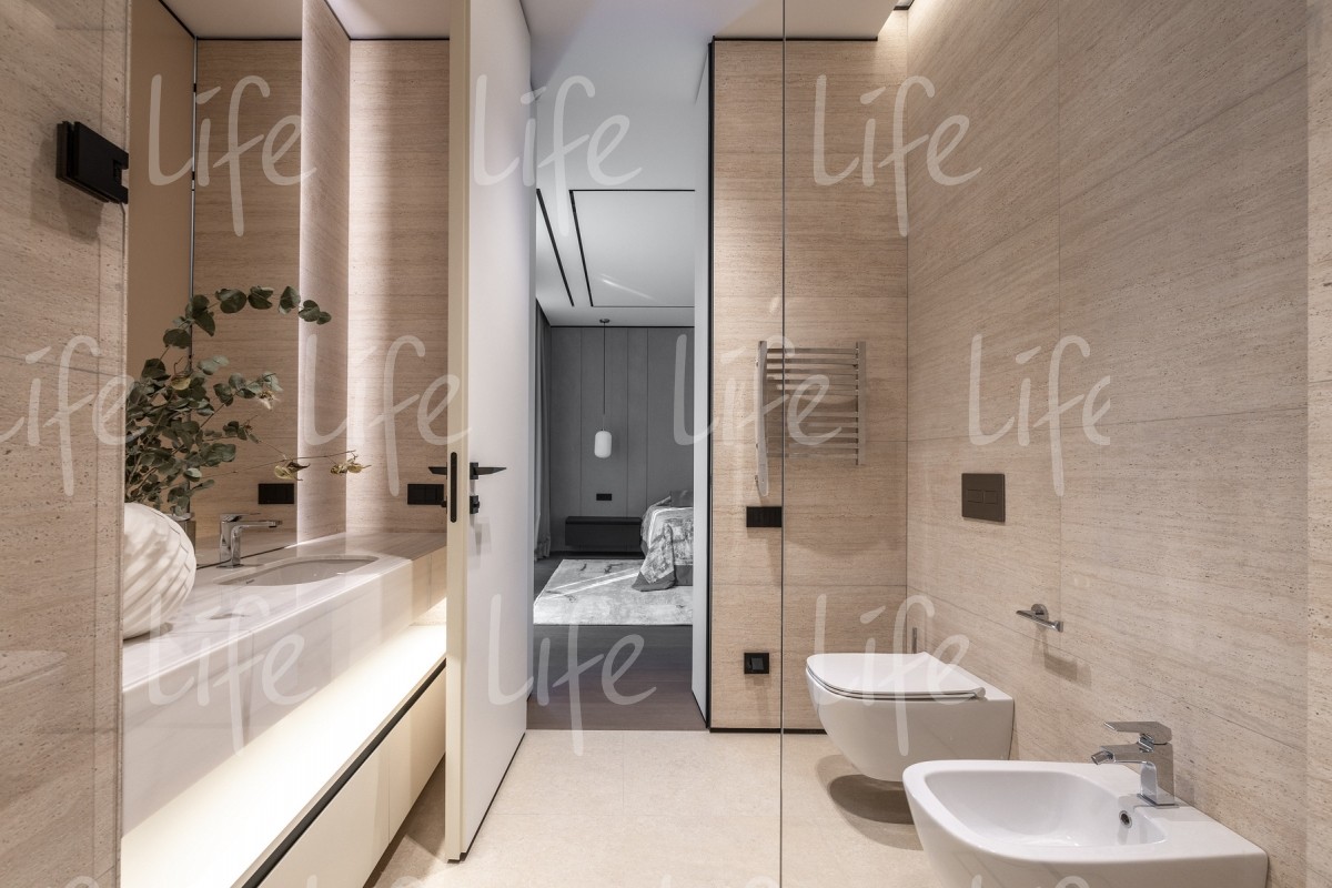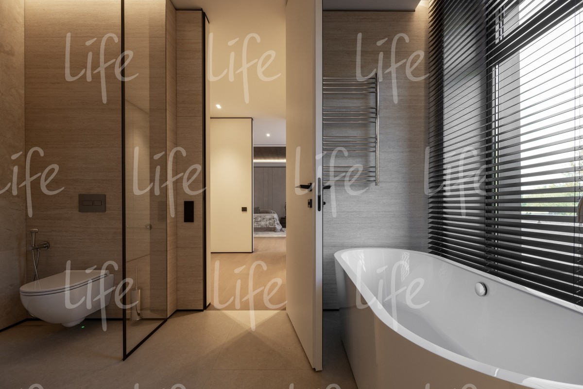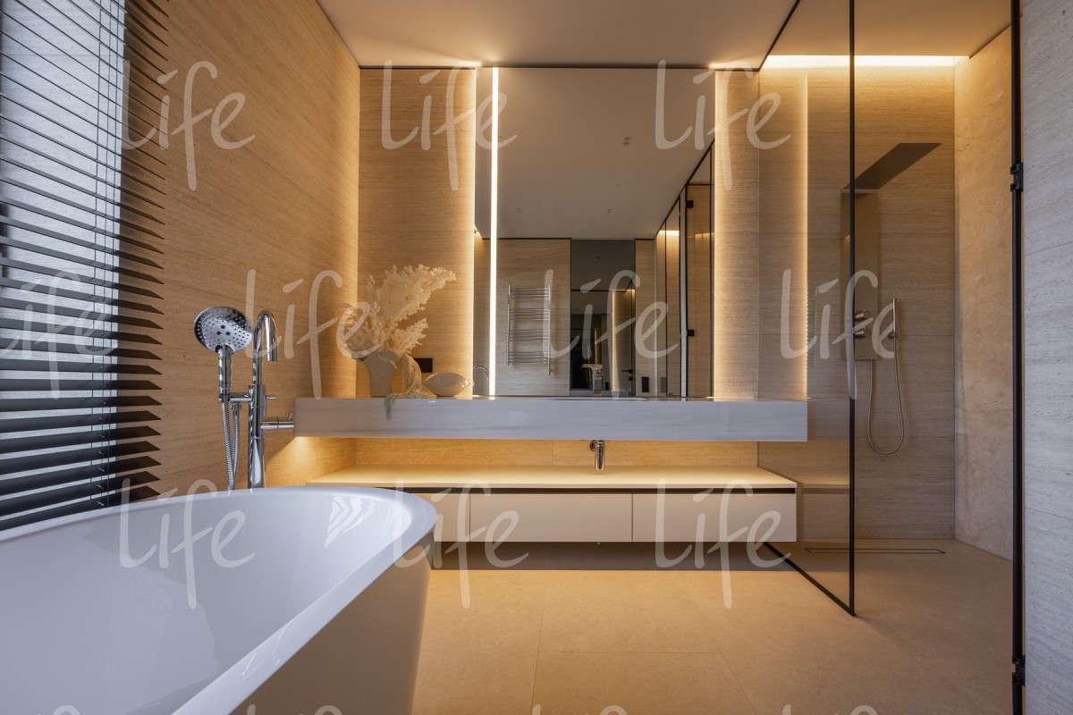 Интерьер выполнен в современном стиле, в мягких светлых тонах, использованы передовые световые решения. Со вкусом подобрана оригинальная, красивая мебель и аксессуары. Открытый биокамин украшает гостиную. Мягкие панели, элементы из дерева в спальнях добавляют уюта.