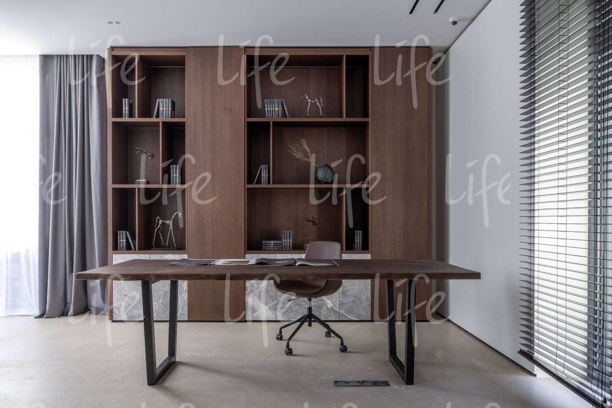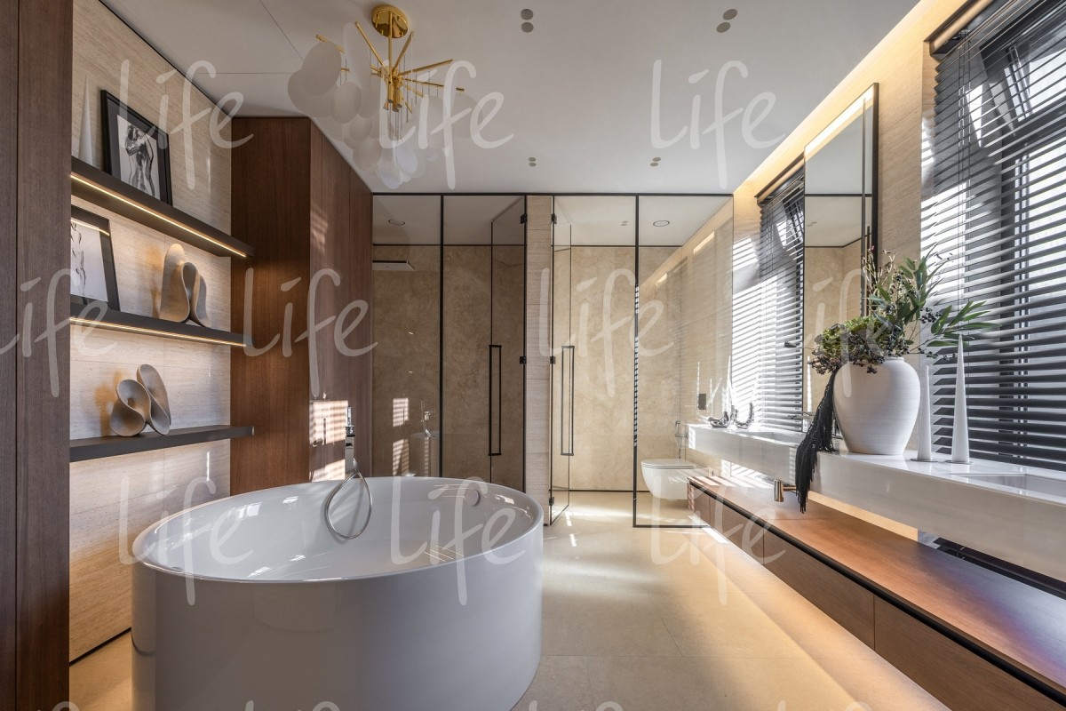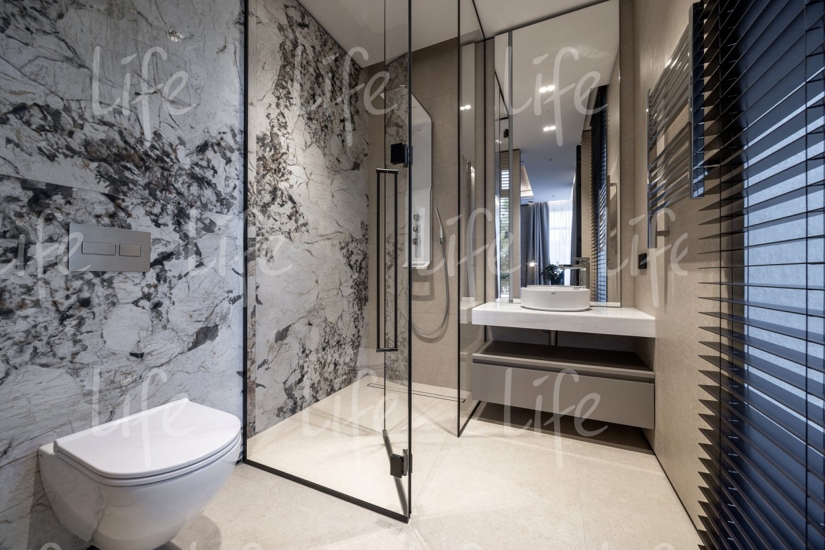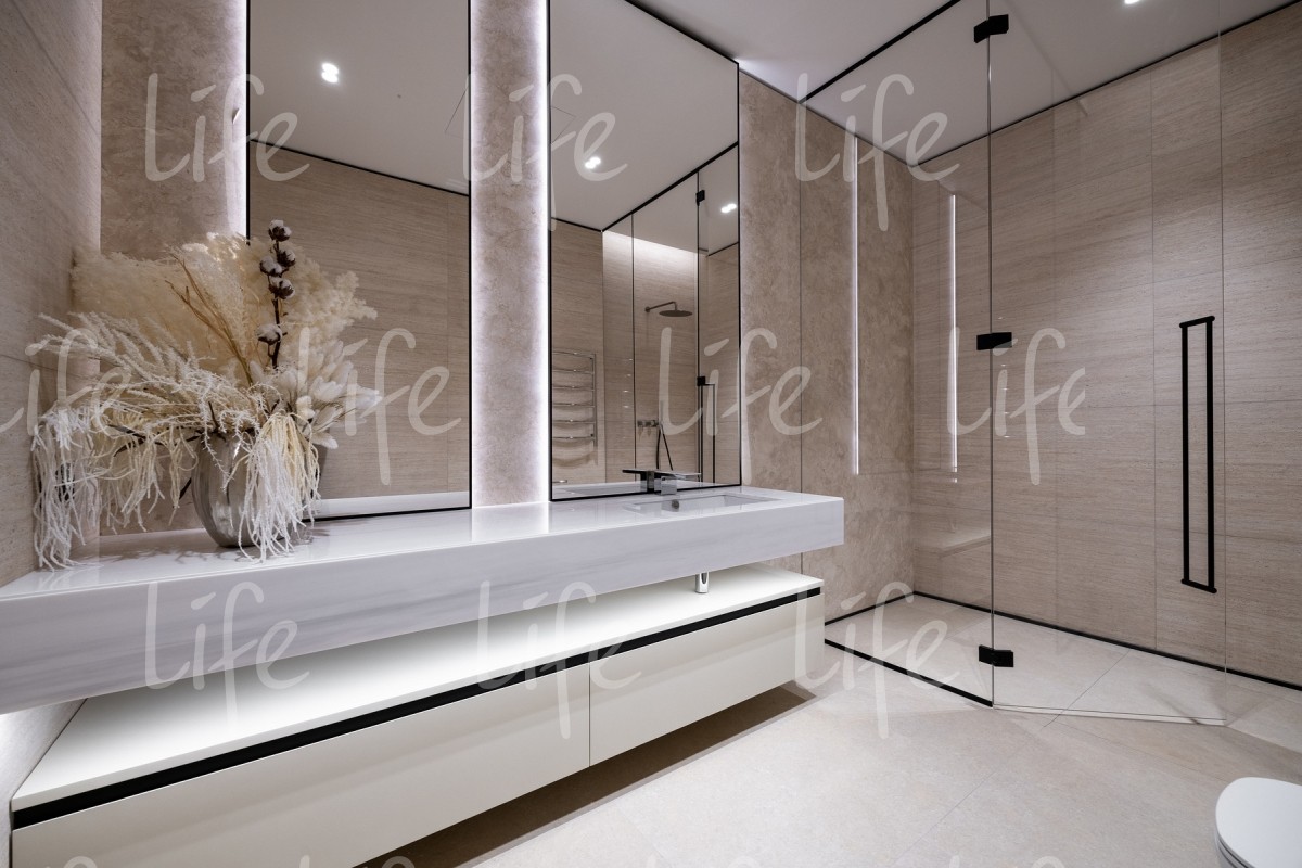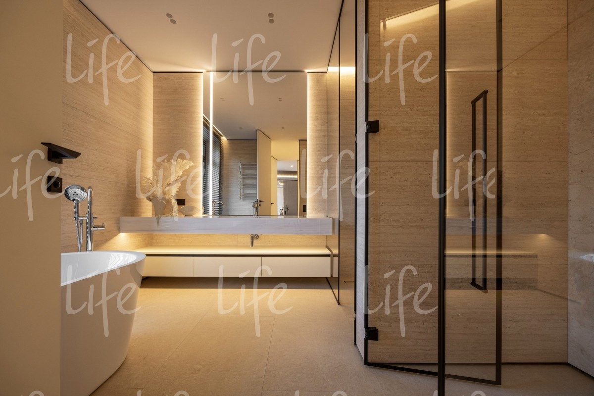 Интерьер выполнен в современном стиле, в мягких светлых тонах, использованы передовые световые решения. Со вкусом подобрана оригинальная, красивая мебель и аксессуары. Открытый биокамин украшает гостиную. Мягкие панели, элементы из дерева в спальнях добавляют уюта.