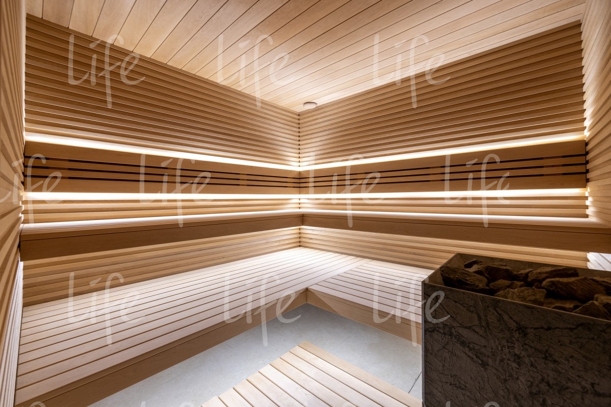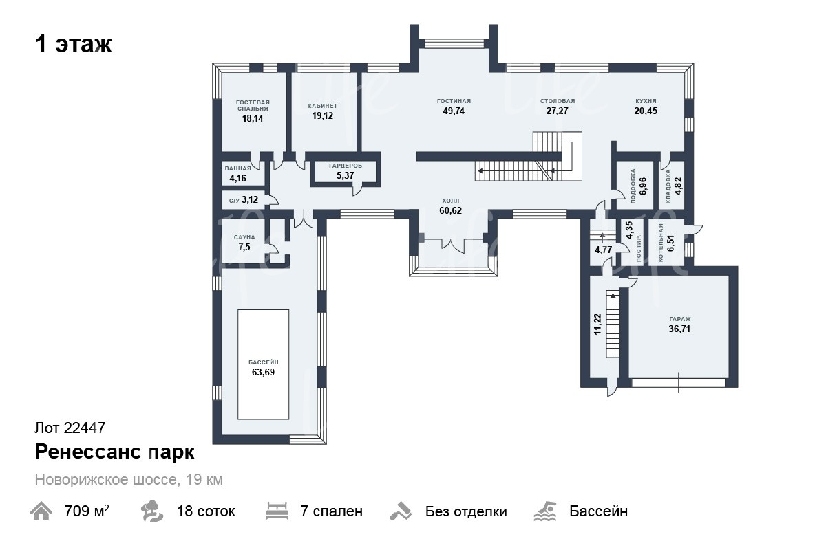 1 этаж: холл, гостиная со вторым светом, столовая, кухня, кладовая, две гардеробных, три санузла, спальня с ванной комнатой, постирочная, кабинет, бассейн, хаммам, купель, сауна, терраса, котельная, гараж на два автомобиля.
